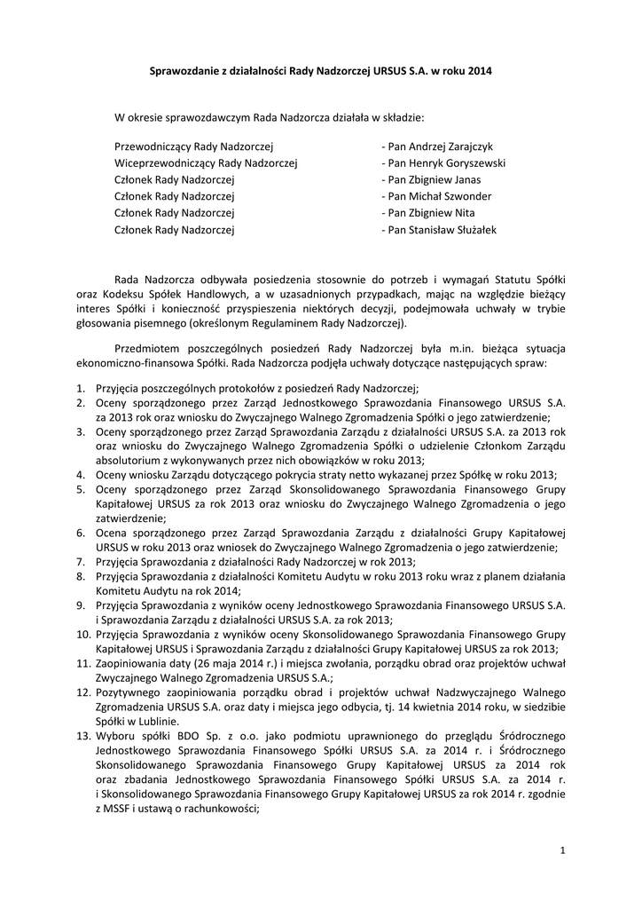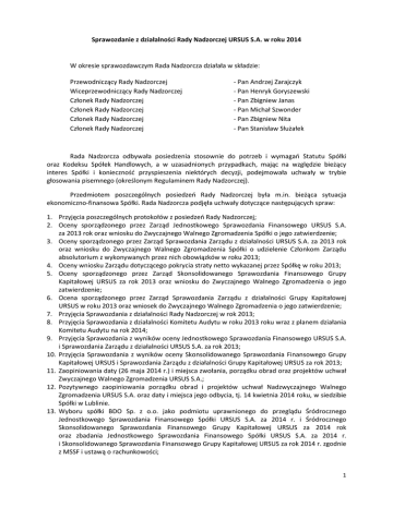 Sprawozdanie z działalności Rady Nadzorczej URSUS S.A. w roku 2014 W okresie sprawozdawczym Rada Nadzorcza działała w składzie: Przewodniczący Rady Nadzorczej Wiceprzewodniczący Rady Nadzorczej Członek Rady Nadzorczej Członek Rady Nadzorczej Członek Rady Nadzorczej Członek Rady Nadzorczej - Pan Andrzej Zarajczyk - Pan Henryk Goryszewski - Pan Zbigniew Janas - Pan Michał Szwonder - Pan Zbigniew Nita - Pan Stanisław Służałek Rada Nadzorcza odbywała posiedzenia stosownie do potrzeb i wymagań Statutu Spółki oraz Kodeksu Spółek Handlowych, a w uzasadnionych przypadkach, mając na względzie bieżący interes Spółki i konieczność przyspieszenia niektórych decyzji, podejmowała uchwały w trybie głosowania pisemnego (określonym Regulaminem Rady Nadzorczej). Przedmiotem poszczególnych posiedzeń Rady Nadzorczej była m.in. bieżąca sytuacja ekonomiczno-finansowa Spółki. Rada Nadzorcza podjęła uchwały dotyczące następujących spraw: 1. Przyjęcia poszczególnych protokołów z posiedzeń Rady Nadzorczej; 2. Oceny sporządzonego przez Zarząd Jednostkowego Sprawozdania Finansowego URSUS S.A. za 2013 rok oraz wniosku do Zwyczajnego Walnego Zgromadzenia Spółki o jego zatwierdzenie; 3. Oceny sporządzonego przez Zarząd Sprawozdania Zarządu z działalności URSUS S.A. za 2013 rok oraz wniosku do Zwyczajnego Walnego Zgromadzenia Spółki o udzielenie Członkom Zarządu absolutorium z wykonywanych przez nich obowiązków w roku 2013; 4. Oceny wniosku Zarządu dotyczącego pokrycia straty netto wykazanej przez Spółkę w roku 2013; 5. Oceny sporządzonego przez Zarząd Skonsolidowanego Sprawozdania Finansowego Grupy Kapitałowej URSUS za rok 2013 oraz wniosku do Zwyczajnego Walnego Zgromadzenia o jego zatwierdzenie; 6. Ocena sporządzonego przez Zarząd Sprawozdania Zarządu z działalności Grupy Kapitałowej URSUS w roku 2013 oraz wniosek do Zwyczajnego Walnego Zgromadzenia o jego zatwierdzenie; 7. Przyjęcia Sprawozdania z działalności Rady Nadzorczej w rok 2013; 8. Przyjęcia Sprawozdania z działalności Komitetu Audytu w roku 2013 roku wraz z planem działania Komitetu Audytu na rok 2014; 9. Przyjęcia Sprawozdania z wyników oceny Jednostkowego Sprawozdania Finansowego URSUS S.A. i Sprawozdania Zarządu z działalności URSUS S.A. za rok 2013; 10. Przyjęcia Sprawozdania z wyników oceny Skonsolidowanego Sprawozdania Finansowego Grupy Kapitałowej URSUS i Sprawozdania Zarządu z działalności Grupy Kapitałowej URSUS za rok 2013; 11. Zaopiniowania daty (26 maja 2014 r.) i miejsca zwołania, porządku obrad oraz projektów uchwał Zwyczajnego Walnego Zgromadzenia URSUS S.A.; 12. Pozytywnego zaopiniowania porządku obrad i projektów uchwał Nadzwyczajnego Walnego Zgromadzenia URSUS S.A. oraz daty i miejsca jego odbycia, tj. 14 kwietnia 2014 roku, w siedzibie Spółki w Lublinie. 13. Wyboru spółki BDO Sp. z o.o. jako podmiotu uprawnionego do przeglądu Śródrocznego Jednostkowego Sprawozdania Finansowego Spółki URSUS S.A. za 2014 r. i Śródrocznego Skonsolidowanego Sprawozdania Finansowego Grupy Kapitałowej URSUS za 2014 rok oraz zbadania Jednostkowego Sprawozdania Finansowego Spółki URSUS S.A. za 2014 r. i Skonsolidowanego Sprawozdania Finansowego Grupy Kapitałowej URSUS za rok 2014 r. zgodnie z MSSF i ustawą o rachunkowości; 1 14. Wyrażenia zgody na zlikwidowanie Oddziału Spółki w Dobrym Mieście i Opalenicy poprzez połączenie tych Oddziałów z Zakładem Głównym Spółki w Lublinie. Na skutek reorganizacji Spółka ze struktury oddziałowej przeszła na strukturę dywizyjną; 15. Zatwierdzenia zmian wprowadzonych przez Zarząd w Regulaminie Organizacyjnym oraz w Schemacie Organizacyjnym Spółki; 16. Zmiany treści oraz ustalenia tekstu jednolitego Regulaminu Rady Nadzorczej URSUS S.A.; 17. Udzielenia pełnomocnictwa Członkowi Rady Nadzorczej Panu Michałowi Szwonderowi do jednoosobowego ustalenia jednolitego tekstu Statutu Spółki uwzględniającego zmiany dokonane przez Zwyczajne Walne Zgromadzenie (26 maja 2014 r.) oraz do podpisania w imieniu Rady Nadzorczej, ustalonego tekstu jednolitego Statutu Spółki; 18. Zatwierdzenia Planu Finansowego Spółki na rok 2014, który przewidywał m.in. osiągnięcie przez Spółkę przychodów ze sprzedaży w kwocie 324 mln zł i zysk netto w kwocie 17 mln zł oraz zatwierdzenia Planu Inwestycyjnego Spółki na rok 2014 w zakresie wydatków planowanych na pierwszy kwartał 2014 r., tj. do kwoty 2 712 635 zł. 19. Rozszerzenia składu osobowego Zarządu URSUS S.A. bieżącej wspólnej kadencji do pięciu osób; 20. Powołania Pana Karola Zarajczyka na Prezesa Zarządu bieżącej wspólnej kadencji; 21. Powołania Pana Jana Wielgus na Członka Zarządu bieżącej wspólnej kadencji; 22. Powołania Pana Tadeusza Ustyniuka na Członka Zarządu bieżącej wspólnej kadencji; 23. Powołania Pana Wojciecha Zachorowskiego na Członka Zarządu bieżącej wspólnej kadencji; 24. Powołania Pana Abdullaha Akkus do składu Zarządu oraz na Członka Zarządu bieżącej wspólnej kadencji; 25. Udzielenia Członkowi Rady Nadzorczej Panu Andrzejowi Zarajczykowi pełnomocnictwa do podpisania jednoosobowo w imieniu Spółki, umowy o pracę albo kontraktu managerskiego z Panem Abdullahem Akkus; 26. Wyrażenia zgody na zawarcie aneksu nr 3 do umowy 2012/50/396/7127934 kredytu w rachunku bieżącym z Bankiem Polska Kasa Opieki S.A. z siedzibą w Warszawie; 27. Wyrażenia zgody na zawarcie z Bankiem Millenium S.A. z siedzibą w Warszawie Aneksu nr 2 do umowy faktoringowej nr 2179, Umowy o kredyt obrotowy nr 6567/13/400/04 na finansowanie bieżącej działalności, Aneksu nr A12/1/08/400/05 do umowy o kredyt w rachunku bieżącym nr 1/08/400/05 oraz Aneksu nr A1/5704/13/475/04 do umowy o kredyt rewolwingowy nr 5704/13/475/04; 28. Wyrażenia zgody na zawarcie z Bankiem Gospodarki Żywnościowej S.A. z siedzibą w Warszawie Aneksu nr 2 do umowy nr U/0092714856/0015/2013/3400 kredytu rewolwingowego, Aneksu nr 2 do 