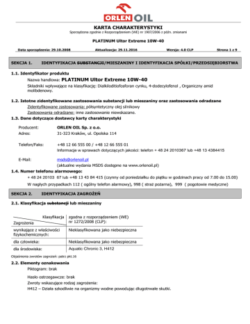 KARTA CHARAKTERYSTYKI Sporządzona zgodnie z Rozporządzeniem (WE) nr 1907/2006 z późn. zmianami PLATINUM Ultor Extreme 10W-40 Data sporządzenia: 29.10.2008 SEKCJA 1. Aktualizacja: 29.11.2016 Wersja: 4.0 CLP Strona 1 z 9 IDENTYFIKACJA SUBSTANCJI/MIESZANINY I IDENTYFIKACJA SPÓŁKI/PRZEDSIĘBIORSTWA 1.1. Identyfikator produktu Nazwa handlowa: PLATINUM Ultor Extreme 10W-40 Składniki wpływające na klasyfikację: Dialkiloditiofosforan cynku, 4-dodecylofenol , Organiczny amid molibdenowy. 1.2. Istotne zidentyfikowane zastosowania substancji lub mieszaniny oraz zastosowania odradzane Zidentyfikowane zastosowania: półsyntetyczny olej silnikowy Zastosowania odradzane: inne zastosowanie niewskazane. 1.3. Dane dotyczące dostawcy karty charakterystyki Producent: ORLEN OIL Sp. z o.o. Adres: 31-323 Kraków, ul. Opolska 114 Telefon/Faks: +48 12 66 555 00 / +48 12 66 555 01 Informacje w sprawach dotyczących jakości: telefon + 48 24 2010367 lub +48 13 4384415 E-Mail: [email protected] (aktualne wydania MSDS dostępne na www.orlenoil.pl) 1.4. Numer telefonu alarmowego: + 48 24 20103 67 lub +48 13 43 84 415 (czynny od poniedziałku do piątku w godzinach pracy od 7.00 do 15.00) W nagłych przypadkach 112 ( ogólny telefon alarmowy), 998 ( straż pożarna), 999 ( pogotowie medyczne) SEKCJA 2. IDENTYFIKACJA ZAGROŻEŃ 2.1. Klasyfikacja substancji lub mieszaniny Klasyfikacja Zagrożenia zgodna z rozporządzeniem (WE) nr 1272/2008 (CLP): wynikające z właściwości fizykochemicznych: Nieklasyfikowana jako niebezpieczna dla człowieka: Nieklasyfikowana jako niebezpieczna dla środowiska: Aquatic Chronic 3, H412 Objaśnienia zwrotów zagrożeń: patrz pkt.16 2.2. Elementy oznakowania Piktogram: brak Hasło ostrzegawcze: brak Zwroty wskazujące rodzaj zagrożenia: H412 – Działa szkodliwie na organizmy wodne powodując długotrwałe skutki. KARTA CHARAKTERYSTYKI Sporządzona zgodnie z Rozporządzeniem (WE) nr 1907/2006 z późn. zmianami PLATINUM Ultor Extreme 10W-40 Data sporządzenia: 29.10.2008 Aktualizacja: 29.11.2016 Wersja: 4.0 CLP Strona 2 z 9 Zwroty wskazujące środki ostrożności: P273 – Unikać uwolnienia do środowiska P501 - Zawartość/pojemnik usuwać do upoważnionego odbiorcy odpadów. 2.3. Inne zagrożenia Produkt nie spełnia kryteriów PBT lub vPvB zgodnie z załącznikiem XIII Rozporządzenia REACH. Produkt palny o wysokiej temperaturze zapłonu. SEKCJA 3. SKŁAD/INFORMACJA O SKŁADNIKACH 3.1. Substancje – nie dotyczy 3.2. Mieszaniny: mieszanina mineralnych i syntetycznych olejów bazowych i dodatków uszlachetniających Niebezpieczne składniki, zakresy ich stężeń w mieszaninie: Nazwa substancji/ Nr rejestracji REACH Nr CAS / Nr WE % wag. Nr indeksowy Klasyfikacja wg 1272/2008 (CLP) Skin Irrit.2, H315 *Eye Dam.1, H318 Aquatic Chronic 2, H411 Aquatic Acute 1;H400 Aquatic Chronic 1;H410 (M=1) Eye Dam.1;H318 Rep.1B; H360F Skin Corr.1C; H314 Aquatic Chronic 2, H411 Dialkiloditiofosforan cynku 68649-42-3/ 272-028-3 0,96 – 1,8 - 4-dodecylofenol 104-43-8/ 203-202-9 0,08 – 0,16 - Organiczny amid molibdenowy 445409-27-8 0,06- 0,1 - *stężenia graniczne Eye Dam. 1: C > 10% Eye Irrit. 2: 5% ≤ C ≤ 10% Opis zwrotów H oraz pełne brzmienie klasyfikacji podano w Sekcji 16. Stosowane oleje bazowe nie są klasyfikowane jako rakotwórcze. Zawartość ekstraktu DMSO (wg IP 346) < 3%. Na podstawie lepkości produkt nie stwarza zagrożenia spowodowanego aspiracją. SEKCJA 4. ŚRODKI PIERWSZEJ POMOCY 4.1. Opis środków pierwszej pomocy Wdychanie: Poszkodowanego usunąć (wyprowadzić/wynieść) z miejsca narażenia na świeże powietrze; zapewnić spokój i ciepło. Nieprzytomnego ułożyć w pozycji bocznej ustalonej, rozluźnić uciskające części ubrania; kontrolować i utrzymywać drożność dróg oddechowych. W przypadku zaburzeń w oddychaniu podawać tlen, w przypadku braku oddechu stosować sztuczne oddychanie. W przypadku utraty przytomności, zaburzeń oddychania lub utrzymującego się złego samopoczucia natychmiast zapewnić pomoc lekarską. Kontakt ze skórą: Natychmiast zdjąć zanieczyszczoną/nasiąkniętą odzież i buty. Zanieczyszczoną skórę umyć dokładnie wodą z mydłem lub łagodnym detergentem, a następnie spłukać wodą. W przypadku wystąpienia i utrzymywania się objawów podrażnienia skonsultować się z lekarzem. UWAGA: Zanieczyszczoną/nasiąkniętą odzież usunąć w bezpieczne miejsce z dala od źródeł ciepła i źródeł zapłonu. Kontakt z oczami: Zanieczyszczone oczy natychmiast płukać ciągłym strumieniem wody, usunąć szkła kontaktowe (jeśli są) i KARTA CHARAKTERYSTYKI Sporządzona zgodnie z Rozporządzeniem (WE) nr 1907/2006 z późn. zmianami PLATINUM Ultor Extreme 10W-40 Data sporządzenia: 29.10.2008 Aktualizacja: 29.11.2016 Wersja: 4.0 CLP Strona 3 z 9 kontynuować płukanie przez ok. 15 minut. Podczas płukania trzymać powieki szeroko rozwarte i poruszać gałką oczną. W przypadku wystąpienia i utrzymywania się dolegliwości skonsultować się z lekarzem. UWAGA: Nie stosować zbyt silnego strumienia wody, aby nie uszkodzić rogówki. Połknięcie: Nie prowokować wymiotów. W przypadku wystąpienia samoistnych wymiotów trzymać poszkodowanego w pozycji nachylonej do przodu z twarzą skierowaną do ziemi. Zapewnić pomoc medyczną. 4.2. Najważniejsze ostre i opóźnione objawy oraz skutki narażenia Nie określono. 4.3. Wskazania dotyczące wszelkiej postępowania z poszkodowanym natychmiastowej pomocy lekarskiej i szczególnego Nie prowokować wymiotów i nie podawać niczego doustnie osobie nieprzytomnej. Pokazać kartę charakterystyki lub etykietę/opakowanie personelowi medycznemu udzielającemu pomocy. Osoby udzielające pomocy w obszarze o nieznanym stężeniu par/mgły powinny być wyposażone w odpowiednie ochrony dróg oddechowych. Wskazówki dla lekarza: leczenie objawowe. SEKCJA 5. POSTĘPOWANIE W PRZYPADKU POŻARU 5.1. Środki gaśnicze Odpowiednie środki gaśnicze: dwutlenek węgla, proszek gaś