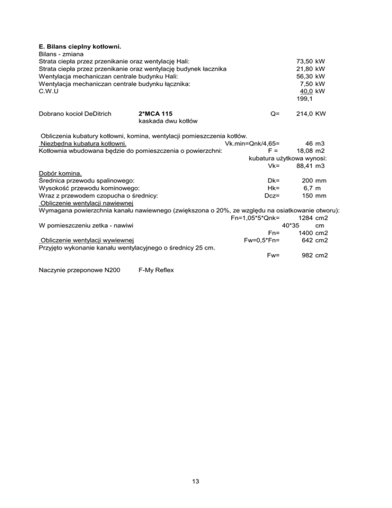 E. Bilans cieplny kotłowni. Bilans - zmiana Strata ciepła przez przenikanie oraz wentylację Hali: Strata ciepła przez przenikanie oraz wentylację budynek łacznika Wentylacja mechaniczan centrale budynku Hali: Wentylacja mechaniczan centrale budynku łącznika: C.W.U Dobrano kocioł DeDitrich 2*MCA 115 kaskada dwu kotłów 73,50 21,80 56,30 7,50 40,0 199,1 Q= kW kW kW kW kW 214,0 KW Obliczenia kubatury kotłowni, komina, wentylacji pomieszczenia kotłów. Niezbędna kubatura kotłowni. Vk.min=Qnk/4,65= 46 m3 Kotłownia wbudowana będzie do pomieszczenia o powierzchni: F= 18,08 m2 kubatura uŜytkowa wynosi: Vk= 88,41 m3 Dobór komina. Średnica przewodu spalinowego: Dk= 200 mm Wysokość przewodu kominowego: Hk= 6,7 m Wraz z przewodem czopucha o średnicy: Dcz= 150 mm Obliczenie wentylacji nawiewnej Wymagana powierzchnia kanału nawiewnego (zwiększona o 20%, ze względu na osiatkowanie otworu): Fn=1,05*5*Qnk= 1284 cm2 W pomieszczeniu zetka - nawiwi 40*35 cm Fn= 1400 cm2 Obliczenie wentylacji wywiewnej Fw=0,5*Fn= 642 cm2 Przyjęto wykonanie kanału wentylacyjnego o średnicy 25 cm. Fw= 982 cm2 Naczynie przeponowe N200 F-My Reflex 13