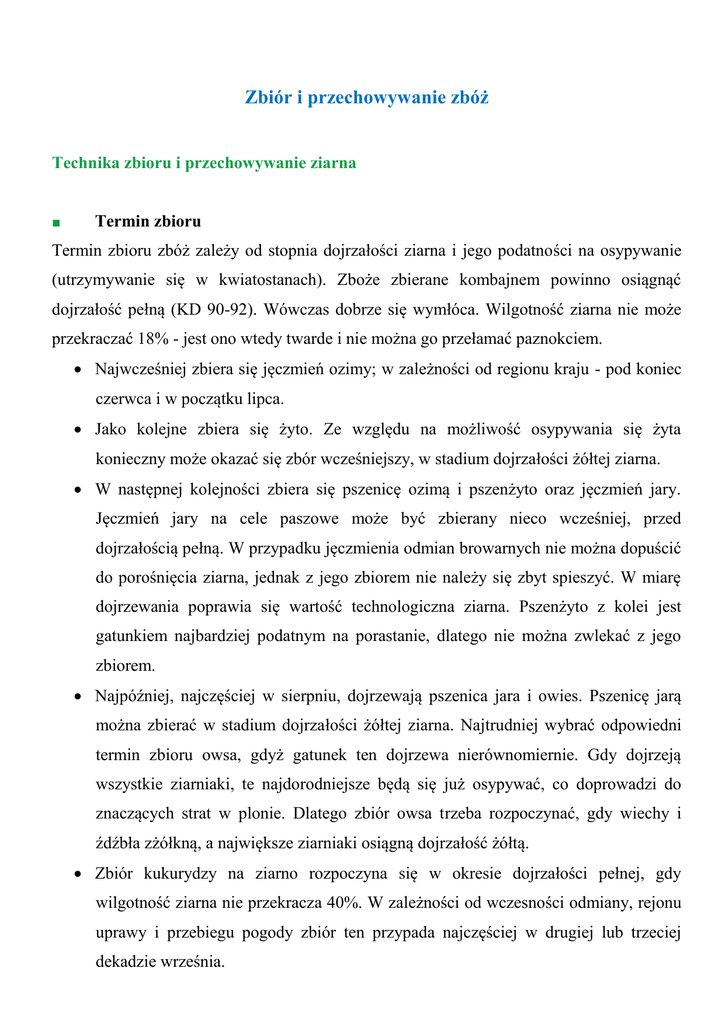 Zbiór i przechowywanie zbóż Technika zbioru i przechowywanie ziarna ■ Termin zbioru Termin zbioru zbóż zależy od stopnia dojrzałości ziarna i jego podatności na osypywanie (utrzymywanie się w kwiatostanach). Zboże zbierane kombajnem powinno osiągnąć dojrzałość pełną (KD 90-92). Wówczas dobrze się wymłóca. Wilgotność ziarna nie może przekraczać 18% - jest ono wtedy twarde i nie można go przełamać paznokciem. Najwcześniej zbiera się jęczmień ozimy; w zależności od regionu kraju - pod koniec czerwca i w początku lipca. Jako kolejne zbiera się żyto. Ze względu na możliwość osypywania się żyta konieczny może okazać się zbór wcześniejszy, w stadium dojrzałości żółtej ziarna. W następnej kolejności zbiera się pszenicę ozimą i pszenżyto oraz jęczmień jary. Jęczmień jary na cele paszowe może być zbierany nieco wcześniej, przed dojrzałością pełną. W przypadku jęczmienia odmian browarnych nie można dopuścić do porośnięcia ziarna, jednak z jego zbiorem nie należy się zbyt spieszyć. W miarę dojrzewania poprawia się wartość technologiczna ziarna. Pszenżyto z kolei jest gatunkiem najbardziej podatnym na porastanie, dlatego nie można zwlekać z jego zbiorem. Najpóźniej, najczęściej w sierpniu, dojrzewają pszenica jara i owies. Pszenicę jarą można zbierać w stadium dojrzałości żółtej ziarna. Najtrudniej wybrać odpowiedni termin zbioru owsa, gdyż gatunek ten dojrzewa nierównomiernie. Gdy dojrzeją wszystkie ziarniaki, te najdorodniejsze będą się już osypywać, co doprowadzi do znaczących strat w plonie. Dlatego zbiór owsa trzeba rozpoczynać, gdy wiechy i źdźbła zżółkną, a największe ziarniaki osiągną dojrzałość żółtą. Zbiór kukurydzy na ziarno rozpoczyna się w okresie dojrzałości pełnej, gdy wilgotność ziarna nie przekracza 40%. W zależności od wczesności odmiany, rejonu uprawy i przebiegu pogody zbiór ten przypada najczęściej w drugiej lub trzeciej dekadzie września. ■ Technika zbioru i magazynowanie ziarna Zbiór jest najbardziej pracochłonnym elementem technologii produkcji zbóż. Najczęściej wykonuje się go jednoetapowo, kombajnem zbożowym. Pole, na którym prowadzi się zbiór kombajnem, powinno być możliwie jak najbardziej wyrównane, bez głębokich nierówności. W czasie zbioru ziarno jest od razu młócone i zbierane w zasobniku kombajnu. Po wypełnieniu zasobnika ziarno jest przesypywane luzem na przyczepy i transportowane do magazynów. Słoma i plewy są wyrzucane na ściernisko, skąd słoma powinna być możliwie szybko zebrana, np. zwinięta w rolki lub sprasowana w kostki, i zmagazynowana albo rozdrobniona, jeżeli ma być przyorana. Ziarno zebrane kombajnem musi być doczyszczone. Ponadto, jeśli ma wilgotność większą niż 13-14%, to musi być dosuszone. Szczególnie starannie trzeba przechowywać ziarno jęczmienia browarnego oraz ziarno wszystkich gatunków zbóż przeznaczone do siewu. ■ Dosuszanie i przechowywanie Dosuszanie przeprowadza się w specjalnych suszarniach. Polega ono na ogrzewaniu ziarna do temperatury 45-50°C w przypadku ziarna, które musi zachować pełną zdolność kiełkowania (np. do siewu) lub do 60-70°C w przypadku ziarna paszowego, i następnie schładzaniu. Jeśli gospodarstwo nie dysponuje suszarnią, to ziarno można składować w przewiewnym pomieszczeniu i szuflować lub przepuścić przez wialnię. Dosuszone ziarno można przechowywać w silosach zbożowych lub w pomieszczeniach magazynowych luzem, lub w workach. Trzeba jednak pamiętać o właściwej wentylacji takich pomieszczeń i zabezpieczeniu ziarna przed dostępem gryzoni i szkodników.