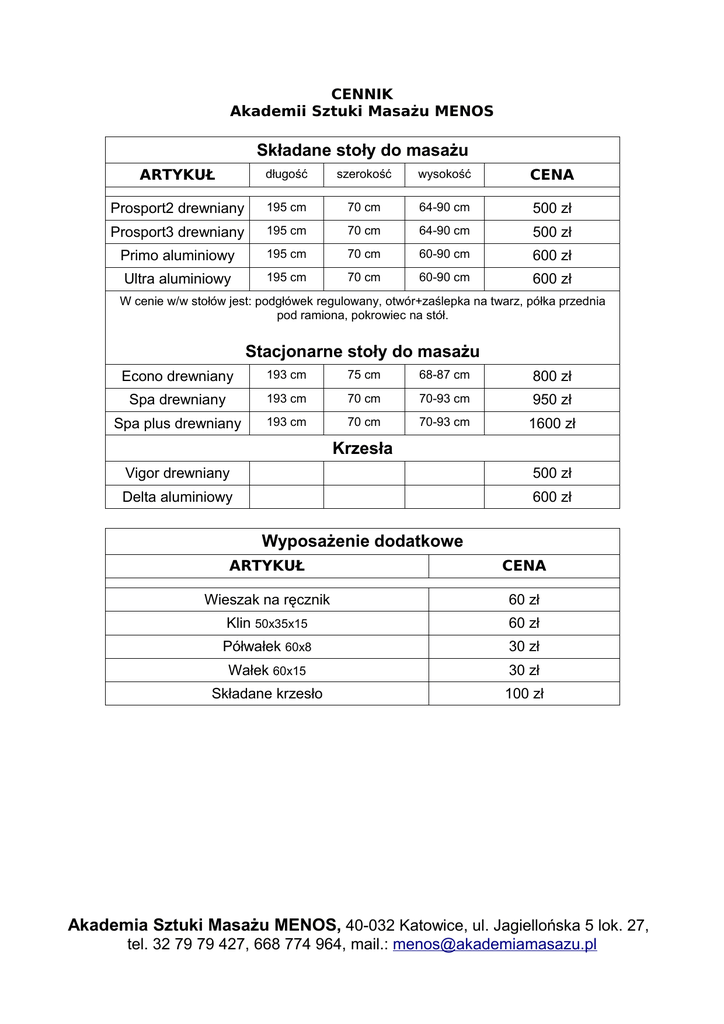 CENNIK Akademii Sztuki Masażu MENOS Składane stoły do masażu ARTYKUŁ długość szerokość wysokość CENA Prosport2 drewniany 195 cm 70 cm 64-90 cm 500 zł Prosport3 drewniany 195 cm 70 cm 64-90 cm 500 zł Primo aluminiowy 195 cm 70 cm 60-90 cm 600 zł Ultra aluminiowy 195 cm 70 cm 60-90 cm 600 zł W cenie w/w stołów jest: podgłówek regulowany, otwór+zaślepka na twarz, półka przednia pod ramiona, pokrowiec na stół. Stacjonarne stoły do masażu Econo drewniany 193 cm 75 cm 68-87 cm 800 zł Spa drewniany 193 cm 70 cm 70-93 cm 950 zł Spa plus drewniany 193 cm 70 cm 70-93 cm 1600 zł Krzesła Vigor drewniany 500 zł Delta aluminiowy 600 zł Wyposażenie dodatkowe ARTYKUŁ CENA Wieszak na ręcznik 60 zł Klin 50x35x15 60 zł Półwałek 60x8 30 zł Wałek 60x15 30 zł Składane krzesło 100 zł Akademia Sztuki Masażu MENOS, 40-032 Katowice, ul. Jagiellońska 5 lok. 27, tel. 32 79 79 427, 668 774 964, mail.: [email protected]