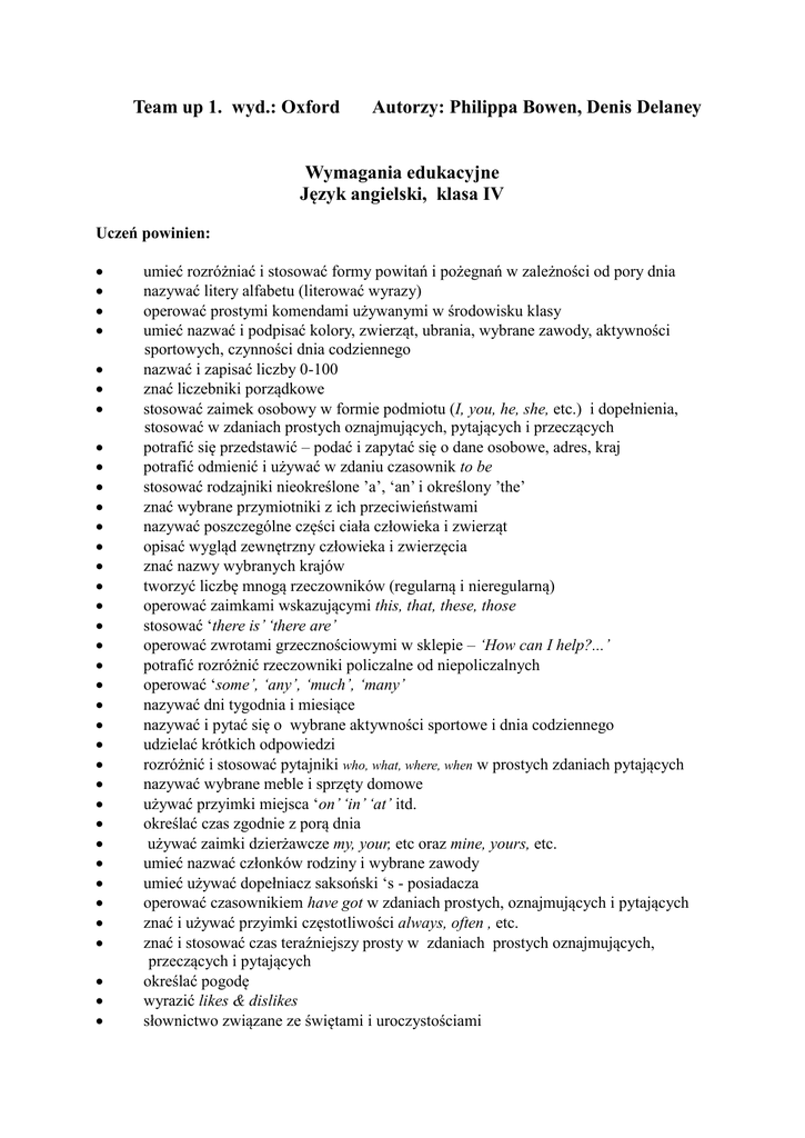 Team up 1. wyd.: Oxford Autorzy: Philippa Bowen, Denis Delaney Wymagania edukacyjne Język angielski, klasa IV Uczeń powinien: umieć rozróżniać i stosować formy powitań i pożegnań w zależności od pory dnia nazywać litery alfabetu (literować wyrazy) operować prostymi komendami używanymi w środowisku klasy umieć nazwać i podpisać kolory, zwierząt, ubrania, wybrane zawody, aktywności sportowych, czynności dnia codziennego nazwać i zapisać liczby 0-100 znać liczebniki porządkowe stosować zaimek osobowy w formie podmiotu (I, you, he, she, etc.) i dopełnienia, stosować w zdaniach prostych oznajmujących, pytających i przeczących potrafić się przedstawić – podać i zapytać się o dane osobowe, adres, kraj potrafić odmienić i używać w zdaniu czasownik to be stosować rodzajniki nieokreślone ’a’, ‘an’ i określony ’the’ znać wybrane przymiotniki z ich przeciwieństwami nazywać poszczególne części ciała człowieka i zwierząt opisać wygląd zewnętrzny człowieka i zwierzęcia znać nazwy wybranych krajów tworzyć liczbę mnogą rzeczowników (regularną i nieregularną) operować zaimkami wskazującymi this, that, these, those stosować ‘there is’ ‘there are’ operować zwrotami grzecznościowymi w sklepie – ‘How can I help?...’ potrafić rozróżnić rzeczowniki policzalne od niepoliczalnych operować ‘some’, ‘any’, ‘much’, ‘many’ nazywać dni tygodnia i miesiące nazywać i pytać się o wybrane aktywności sportowe i dnia codziennego udzielać krótkich odpowiedzi rozróżnić i stosować pytajniki who, what, where, when w prostych zdaniach pytających nazywać wybrane meble i sprzęty domowe używać przyimki miejsca ‘on’ ‘in’ ‘at’ itd. określać czas zgodnie z porą dnia używać zaimki dzierżawcze my, your, etc oraz mine, yours, etc. umieć nazwać członków rodziny i wybrane zawody umieć używać dopełniacz saksoński ‘s - posiadacza operować czasownikiem have got w zdaniach prostych, oznajmujących i pytających znać i używać przyimki częstotliwości always, often , etc. znać i stosować czas teraźniejszy prosty w zdaniach prostych oznajmujących, przeczących i pytających określać pogodę wyrazić likes & dislikes słownictwo związane ze świętami i uroczystościami