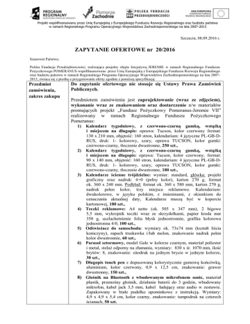 Projekt współfinansowany przez Unię Europejską z Europejskiego Funduszu Rozwoju Regionalnego oraz budżetu państwa w ramach Regionalnego Programu Operacyjnego Województwa Zachodniopomorskiego na lata 2007-2013 Szczecin, 08.09.2016 r. ZAPYTANIE OFERTOWE nr 20/2016 Szanowni Państwo, Polska Fundacja Przedsiębiorczości, realizująca projekty objęte Inicjatywą JEREMIE w ramach Regionalnego Funduszu Pożyczkowego POMERANUS współfinansowane przez Unię Europejską z Europejskiego Funduszu Rozwoju Regionalnego oraz budżetu państwa w ramach Regionalnego Programu Operacyjnego Województwa Zachodniopomorskiego na lata 20072013, zwraca się z prośbą o przygotowanie oferty zgodnie z poniższą specyfikacją: Przedmiot zamówienia, zakres zakupu Do zapytanie ofertowego nie stosuje się Ustawy Prawa Zamówień Publicznych. Przedmiotem zamówienia jest zaprojektowanie (wraz ze zdjęciem), wykonanie wraz ze znakowaniem oraz dostarczenie n/w materiałów promujących projekt „Fundusz Pożyczkowy Pomeranus-Jeremie VII” realizowany w ramach Regionalnego Funduszu Pożyczkowego Pomeranus: 1) Kalendarz tygodniowy, z czerwono-czarną gumką, wstążką i miejscem na długopis: oprawa: Tucson, kolor czerwony format: 130 x 210 mm, objętość: 160 stron, kalendarium: 4 języczne PL-GB-DRUS, druk: 1- kolorowy, szary, oprawa TUCSON, kolor gumki: czerwono-czarny, tłoczenie dwustronne, 250 szt., 2) Kalendarz tygodniowy, z czerwono-czarną gumką, wstążką i miejscem na długopis: oprawa: Tucson, kolor czerwony, format: 90 x 140 mm, objętość: 160 stron, kalendarium: 4 języczne PL-GB-DRUS, druk: 1- kolorowy, szary, oprawa TUCSON, kolor gumki: czerwono-czarny, tłoczenie dwustronne, 180 szt., 3) Kalendarze ścienne trójdzielne: wymiar: standard, główka: projekt graficzny oraz nadruk: 4+0 (pełny kolor), karton 270 g, format ok. 360 x 240 mm. Podkład: format ok. 360 x 580 mm, karton 270 g, nadruk pełen kolor, trzy miejsca reklamowe. Kalendarium: dwukolorowe, w języku polskim, z imieninami, z okienkiem do oznaczania aktualnej daty, Kalendarze muszą być w kopercie kartonowej, 180 szt., 4) Teczki reklamowe: A4 netto (ok. 505 x 347 mm), 2 bigowe 5,5 mm, wykrojnik teczki wraz ze skrzydełkami, papier kreda mat 350 g, uszlachetnienie folia błysk jednostronnie, grafika kolorowa jednostronna 4/0, 100 szt., 5) Odświeżacz do samochodu: wymiary ok. 73x74 mm (kształt liścia koniczyny), zapach truskawka i/lub melon, znakowanie nadruk pełen kolor dwustronnie, 60 szt., 6) Parasol sztormowy, model Gale w kolorze czarnym, materiał poliester i metal, stelaż odporny na złamania, wymiary: 830 x śr. 1070 mm, ilość brytów: 8, znakowanie: sitodruk na jednym brycie w jednym kolorze, 30 szt., 7) Długopis touch pen z dopasowaną kolorystycznie gumową końcówką, aluminium, kolor czerwony, 0,9 x 12,5 cm, znakowanie: grawer dwustronny, 150 szt., 8) Głośnik na Bluetooth z wbudowanym mikrofonem sonic, materiał plastik, przenośny głośnik, działanie baterii do 3 godzin, wbudowany mikrofon, kabel jack 3,5 mm, kabel ładujący oraz audio w zestawie. Zapakowany w białe pudełko upominkowe z instrukcją. Wymiary: 4,9 x 4,9 x 5,4 cm, kolor czarny, znakowanie: tampodruk na czterech ścianach, 50 szt. Informacje dodatkowe Materiały informacyjno-promocyjne muszą być zgodne z załączonymi zdjęciami lub zbliżone oraz powinny być wykonane z wysokiej jakości materiałów. Pola znakowania proponowanych materiałów informacyjno-promocyjnych muszą być wystarczająco duże, aby zmieściło się i było czytelne wymagane zestawienie. W związku z powyższym wymagana jest wizualizacja znakowania materiałów promocyjnych wraz z podaną wielkością znakowania. Materiały informacyjno-promocyjne muszą być zgodne z Księgą Identyfikacji Wizualnej Inicjatywy JEREMIE dla województwa zachodniopomorskiego, dostępnej na stronie http://www.jeremie.com.pl/promocja/identyfikacja/ Materiały informacyjno-promocyjne: teczki reklamowe, odświeżacze do samochodu, parasole, głośniki, kalendarz książkowy (duży i mały) oraz kalendarze ścienne trójdzielne muszą być oznakowane wg zestawienia rozszerzonego tj.: logo Programu Regionalnego, logo województwa, logo Polskiej Fundacji Przedsiębiorczości, logo Unii Europejskiej (flaga, słowne odniesienie do Unii Europejskiej i Europejskiego Funduszu Rozwoju Regionalnego), informacja o współfinansowaniu projektu, hasło Inicjatywy JEREMIE, logo Inicjatywy JEREMIE, kolorystyka Inicjatywy JEREMIE, hasło „Napędzamy rozwój przedsiębiorstw”, adres strony internetowej Inicjatywy JEREMIE, adres strony internetowej PFP. Materiały promocyjne: długopisy, muszą być oznakowane wg zestawienia minimalnego: jedna strona: ciąg 3 logotypów: logo Programu Regionalnego, logo województwa, logo Unii Europejskiej (flaga, słowne odniesienie do Unii Europejskiej i Europejskiego Funduszu Rozwoju Regionalnego), druga strona: logo PFP. Projekty muszą zostać każdorazowo zaakceptowane przez Zamawiającego. Projekty oraz znakowanie materiałów informacyjno- promocyjnych w cenie. Koszt dostawy w cenie usługi. Miejsce dostawy: siedziba Zamawiającego Termin dostawy: do 21 dni od daty zaakceptowania projektu. Zamawiający udostępni logo PFP. Zamawiający zastrzega sobie prawo do odstąpienia od części zamówienia. Zamawiający zastrzega sobie prawo do wyłączenia części zamówienia. Zamawiający zastrzega sobie prawo do złożenia częściowego zamówienia. Zamawiający zastrzega sobie prawo do unieważnienia postępowania ofertowego. Nie dopuszcza się składania ofert częściowych. Zdjęcia przykładowych materiałów promocyjnych w załączeniu, Do zapytanie ofertowego nie stosuje się Ustawy Prawa Zamówień Publicznych. Przelew w terminie 14 dni od daty prawidłowo wystawionej faktury VAT przez Sprzedawcę na podstawie protokołu odbioru materiałów reklamowych. Termin nadsyłania Podpisane oferty należy przesyłać do 26 września 2016 roku do godziny 1