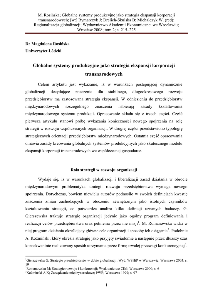M. Rosińska; Globalne systemy produkcyjne jako strategia ekspansji korporacji transnarodowych; [w:] Rymarczyk J; Drelich-Skulska B; Michalczyk W. (red); Regionalizacja globalizacji; Wydawnictwo Akademii Ekonomicznej we Wrocławiu; Wrocław 2008; tom 2; s. 215–225 Dr Magdalena Rosińska Uniwersytet Łódzki Globalne systemy produkcyjne jako strategia ekspansji korporacji transnarodowych Celem artykułu jest wykazanie, iż w warunkach postępującej dynamicznie globalizacji decydujące znaczenie dla stabilnego, długookresowego rozwoju przedsiębiorstw ma zastosowana strategia ekspansji. W odniesieniu do przedsiębiorstw międzynarodowych szczególnego znaczenia nabierają zasady kształtowania międzynarodowego systemu produkcji. Opracowanie składa się z trzech części. Część pierwsza artykułu stanowi próbę wykazania konieczności nowego spojrzenia na rolę strategii w rozwoju współczesnych organizacji. W drugiej części przedstawiono typologię strategicznych orientacji przedsiębiorstw międzynarodowych. Ostatnia część opracowania omawia zasady kreowania globalnych systemów produkcyjnych jako skutecznego modelu ekspansji korporacji transnarodowych we współczesnej gospodarce. Rola strategii w rozwoju organizacji Wydaje się, iż w warunkach globalizacji i liberalizacji zasad działania w obrocie międzynarodowym problematyka strategii rozwoju przedsiębiorstwa wymaga nowego spojrzenia. Dotychczas, bowiem niewielu autorów podnosiło w swoich definicjach kwestię znaczenia zmian zachodzących w otoczeniu zewnętrznym jako istotnych czynników kształtowania strategii, co potwierdza analiza kilku definicji uznanych badaczy. G. Gierszewska traktuje strategię organizacji jedynie jako ogólny program definiowania i realizacji celów przedsiębiorstwa oraz pełnienia przez nie misji1. M. Romanowska widzi w niej program działania określający główne cele organizacji i sposoby ich osiągania 2. Podobnie A. Koźmiński, który określa strategię jako przyjęty świadomie a następnie przez dłuższy czas konsekwentnie realizowany sposób utrzymania przez firmę trwałej przewagi konkurencyjnej3. 1 Gierszewska G; Strategie przedsiębiorstw w dobie globalizacji; Wyd. WSHiP w Warszawie; Warszawa 2003; s. 19 2 Romanowska M; Strategie rozwoju i konkurencji; Wydawnictwo CIM; Warszawa 2000; s. 6 3 Koźmiński A.K; Zarządzanie międzynarodowe; PWE; Warszawa 1999; s. 97 1 M. Rosińska; Globalne systemy produkcyjne jako strategia ekspansji korporacji transnarodowych; [w:] Rymarczyk J; Drelich-Skulska B; Michalczyk W. (red); Regionalizacja globalizacji; Wydawnictwo Akademii Ekonomicznej we Wrocławiu; Wrocław 2008; tom 2; s. 215–225 Szersze ujęcie uwzględniające oddziaływanie zmian zachodzących w gospodarce światowej na zasady funkcjonowania podmiotów na poziomie mikroekonomicznym prezentuje A. Zorska. Znajdziemy tam zbliżone określenie samej strategii 4 , jednak z uwypukleniem konieczności odpowiedniej integracji i koordynacji działań organizacji w zależności od wymogów otoczenia. Autorka uważa modyfikowania istniejących kompetencji w trakcie realizacji przyjętej strategii (wręcz tworzenia nowych kompetencji) za niezbędne dla rozwoju organizacji w długim okresie w związku ze zmianami dokonującymi się w otoczeniu. Koncepcja ta wydaje się, zatem szczególnie istotna w dobie konieczności uwzględniania globalnej perspektywy dla biznesu pozwala, bowiem na uznanie umiędzynaradawiania działalności przedsiębiorstwa za etap rozwojowy organizacji a nie odrębną koncepcję strategiczną. W przypadku analizy funkcjonowania przedsiębiorstw międzynarodowych kwestia ta zyskuje znaczenie fundamentalne. Zasadnym wydaje się przyjęcie, że „strategia to sztuka tworzenia wartości 5 ”, dzięki właściwej koncepcji (wyznaczeniu kierunków i zakresu działalności) planowania rozwoju przedsiębiorstwa w długim okresie z uwzględnieniem „odpowiedniej konfiguracji posiadanych zasobów oraz zmieniającego się otoczenia6”. Impulsem do uwypuklenia znaczenia strategii dla rozwoju organizacji było dostrzeżenie, że przedsiębiorstwa skoncentrowane jedynie na bieżących wynikach szybko tracą swoje wysokie pozycje rynkowe 7 . Niezbędne zwłaszcza dla operujących w skali globalnej przedsiębiorstw międzynarodowych konieczne stało strategiczne przemodelowanie łańcucha tworzenia wartości. Liberalizacja zasad funkcjonowania gospodarki światowej spowodowała ożywienie rynków globalnych oraz rozwój korporacyjnego systemu organizacji procesu produkcji. Wydaje się, iż przyspieszenie tworzenia korporacyjnych systemów produkcji międzynarodowej stało się możliwe dzięki zmniejszeniu barier w handlu międzynarodowym i przepływach inwestycyjnych (standaryzacja zasad przepływu BIZ). Szczególne znaczenie dla rozwoju sieci powiązań w ramach międzynarodowego łańcucha 4 Zorska określa strategię jako zintegrowany i skoordynowany zbiór działań (akcji, posunięć) podejmowanych dla wykorzystania zasadniczych kompetencji oraz uzyskania przewagi konkurencyjnej. Por. Zorska A; Ku globalizacji? Przemiany w korporacjach transnarodowych i w gospodarce światowej; PWN; Warszawa 1998; s. 148 5 Zorska A; Ku globalizacji? …; op. cit.; s. 146 6 Olszanowska K; Determinanty strategii internalizacji przedsiębiorstwa na etapie wyboru rynku zagranicznej ekspansji; [w]: Najlepszy E (red); Biznes międzynarodowy a internacjonalizacja gospodarki narodowej; Wydawnictwo AE w Poznaniu; Poznań 2005; s.291 7 Sowa K; Strategie konkurencji korporacji ponadnarodowych; Difin; Warszawa 2006; s. 79 2 M. Rosińska; Globalne systemy produkcyjne jako strategia ekspansji korporacji transnarodowych; [w:] Rymarczyk J; Drelich-Skulska B; Michalczyk W. (red); Regionalizacja globalizacji; Wydawnictwo Akademii Ekonomicznej we Wrocławiu; Wrocław 2008; tom 2; s. 215–225 produkcyjnego miało także zastosowanie nowoczesnej technologii (internetu). W konsekwencji strategie korporac