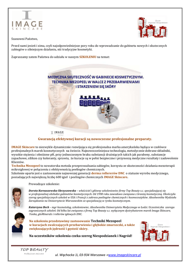 Szanowni Państwo, Przed nami jesień i zima, czyli najodpowiedniejsze pory roku do wprowadzanie do gabinetu nowych i skutecznych zabiegów o silniejszym działaniu, niż tradycyjne kosmetyki. Zapraszamy zatem Państwa do udziału w naszym SZKOLENIU na temat: Gwarancją efektywnej kuracji są nowoczesne profesjonalne profesjonalne preparaty. IMAGE Skincare to niezwykle dynamicznie rozwijająca się profesjonalna profesjonalna marka amerykańska będąca w czołówce profesjonalnych marek kosmetycznych na świecie. świecie Najnowocześniejsza technologia, metodycznie dobrane składniki, wysokie stężenia i obniżone pH,, przy jednoczesnym braku substancji drażniących takich t jak parabeny, substancje zapachowe, silikon czy koloranty, sprawia, że kuracje są w pełni bezpieczne i przynoszą medyczne rezultaty i zadowolenie Klientów. Technika Mezopeel to nowatorska metoda przeprowadzania przeprowa nia zabiegów, korzysta ze skuteczności działania mezoterapii mikroigłowej w połączeniu z efektywnością peelingów chemicznych. Szkolenie oparte jest o zastosowanie najnowszej generacji derma rollererów DNC o statusie wyrobu medycznego, posiadających największą liczbę 600 igieł i peelingów chemicznych IMAGE Skincare. Prowadzące szkolenie: Dorota Kornaszewska-Skrzyszowsk Skrzyszowska – właściciel i główny szkoleniowiec firmy Top Beauty s.c. specjalizującej się w profesjonalnej obsłudze gabinetów kosmetycznych. Od 1998 roku zawodowo związana z branżą kosmetyczną. Ukończyła szereg specjalistycznych szkoleń w USA i Francji z zakresu peelingów chemicznych i kosmeceutyków. Absolwentka Wydziału Zarządzania na Uniwersytecie Warszawskim ze specjalizacją w rynku kosmetycznym. Katarzyna Beck – mgr kosmetolog, szkoleniowiec. szkoleni . Absolwentka Uniwersytetu Medycznego w Łodzi. Uczestniczka szeregu zagranicznych szkoleń. Od kilku lat związana z firmą Top Beauty s.c. wyłącznym wyłącznym dystrybutorem marek Image Skincare, Yonka, gloMinerals i rollerów igłowych DNC. Na szkoleniu przedstawimy my zastosowanie Techniki Mezopeel w kuracjach zwalczających przebarwienia i głębokie zmarszczki, a także zwiększających jędrność i gęstość skóry. Na uczestników szkolenia czeka szereg Niespodzianek i Nagród! Nagród ul. Wąchocka 1i, 03-934 03 Warszawa • www.imageskincare.pl W trakcie szkolenia zostaną zaprezentowane i przeprowadzone praktyczne ćwiczenia z szeregu zabiegów marki IMAGE Skincare z zastosowaniem DNC derma rollerów: • • • SIGNATURE FACE ™LIFT - zabieg firmowy z 30% kwasem L-ascorbinowym, pH 2,00. Kuracja stosowana na świeże naskórkowe przebarwienia oraz prewencji ich nawrotów, a także do redukcji rumienia , zniesienia dyskomfortu skóry związanego z nadmiernym przesuszeniem. LIGHTENING LIFT ™PEEL- zabieg z 50% mieszaniną kwasów mlekowego i kojowego, pH 2,00. Kuracja stosowana na wieloletnie przebarwienia naskórkowe, fotostarzenie, a także jako intensywna odbudowa nawilżenia, poprawa gęstości i spoistości skóry. PERFECTION LIFT ™PEEL - silny zabieg z 60% mieszaniną kwasów salicylowego i mlekowego, retinolu, rezorcyny, witaminy C i roślinnych komórek macierzystych, pH 2,00. Kuracja stosowana na wieloletnie i głębokie przebarwienia skórne, do redukcji głębokich zmarszczek, blizn i rozszerzonych porów. Bardzo intensywna rewitalizacja skóry. Szczegóły szkolenia Termin: 30.09.2013 (poniedziałek), w godzinach 11.00-16.00 Miejsce: Hotel Arsenal Palace ul. Paderewskiego 35, Chorzów (lokalizacja - 5 min. od CH Silesia City Center, dojazd z A4 zjazdem nr 32 CHORZÓW) Liczba miejsc ograniczona Cena: 250 zł za osobę ZGŁOŚ SIĘ JUŻ TERAZ i OSZCZEDZAJ - cena 210 zł - tylko do 13.09.2013 r Każdemu uczestnikowi oferujemy: • • • • Ćwiczenia praktyczne przy fotelu Certyfikat uczestnictwa uprawniający do przeprowadzania zabiegów z zastosowaniem preparatów profesjonalnych IMAGE Skincare i DNC rollers Materiały szkoleniowe Lunch W trakcie szkolenia możliwość skorzystanie z Wyjątkowej Oferty Handlowej tylko dla Uczestników szkoleń. Zgłoszenia prosimy przesyłać na adres mail’owy: [email protected] lub zgłaszać się telefonicznie pod nr 22/783 42 42 wew. 21. Wpłaty za szkolenie prosimy dokonać w ciągu 3-ch dni od zgłoszenia (dotyczy oferty 210 zł). Pozostałe wpłaty do dnia 20.09.2013. Nr konta 17 1140 2017 0000 4802 0971 2854 Top Beauty s.c. ul. Wąchocka 1i 03-934 Warszawa Z dopiskiem: imię i nazwisko, szkolenie 30.09.2013 Serdecznie zapraszamy! ul. Wąchocka 1i, 03-934 Warszawa • www.imageskincare.pl