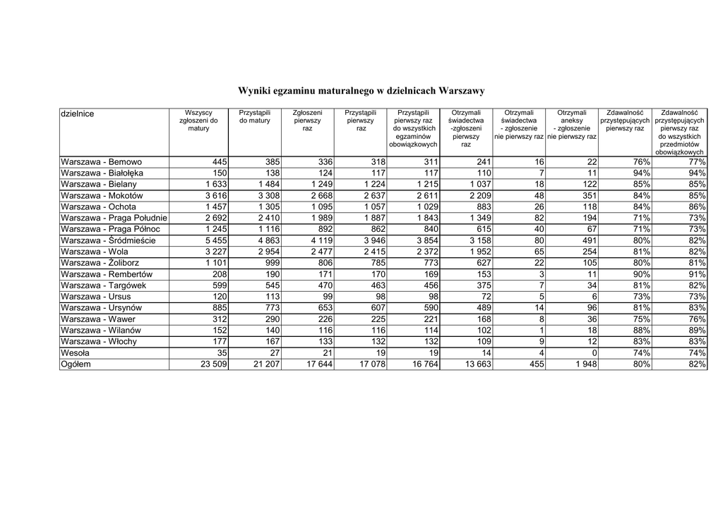 Wyniki egzaminu maturalnego w dzielnicach Warszawy dzielnice Warszawa - Bemowo Warszawa - Białołęka Warszawa - Bielany Warszawa - Mokotów Warszawa - Ochota Warszawa - Praga Południe Warszawa - Praga Północ Warszawa - Śródmieście Warszawa - Wola Warszawa - Żoliborz Warszawa - Rembertów Warszawa - Targówek Warszawa - Ursus Warszawa - Ursynów Warszawa - Wawer Warszawa - Wilanów Warszawa - Włochy Wesoła Ogółem Wszyscy zgłoszeni do matury 445 150 1 633 3 616 1 457 2 692 1 245 5 455 3 227 1 101 208 599 120 885 312 152 177 35 23 509 Przystąpili do matury 385 138 1 484 3 308 1 305 2 410 1 116 4 863 2 954 999 190 545 113 773 290 140 167 27 21 207 Zgłoszeni pierwszy raz 336 124 1 249 2 668 1 095 1 989 892 4 119 2 477 806 171 470 99 653 226 116 133 21 17 644 Przystąpili pierwszy raz 318 117 1 224 2 637 1 057 1 887 862 3 946 2 415 785 170 463 98 607 225 116 132 19 17 078 Przystąpili pierwszy raz do wszystkich egzaminów obowiązkowych 311 117 1 215 2 611 1 029 1 843 840 3 854 2 372 773 169 456 98 590 221 114 132 19 16 764 Otrzymali świadectwa -zgłoszeni pierwszy raz 241 110 1 037 2 209 883 1 349 615 3 158 1 952 627 153 375 72 489 168 102 109 14 13 663 Otrzymali Otrzymali Zdawalność Zdawalność świadectwa aneksy przystępujących przystępujących - zgłoszenie - zgłoszenie pierwszy raz pierwszy raz nie pierwszy raz nie pierwszy raz do wszystkich przedmiotów obowiązkowych 16 7 18 48 26 82 40 80 65 22 3 7 5 14 8 1 9 4 455 22 11 122 351 118 194 67 491 254 105 11 34 6 96 36 18 12 0 1 948 76% 94% 85% 84% 84% 71% 71% 80% 81% 80% 90% 81% 73% 81% 75% 88% 83% 74% 80% 77% 94% 85% 85% 86% 73% 73% 82% 82% 81% 91% 82% 73% 83% 76% 89% 83% 74% 82% Warszawa - Bemowo Warszawa - Białołęka 77,5% 94,0% 85,3% 84,6% Warszawa - Bielany Warszawa - Mokotów Warszawa - Ochota Warszawa - Praga Południe Warszawa - Praga Północ 85,8% 73,2% 73,2% Warszawa - Śródmieście Warszawa - Wola 81,9% 82,3% Warszawa - Żoliborz Warszawa - Rembertów Warszawa - Targówek Warszawa - Ursus Warszawa - Ursynów Warszawa - Wawer Warszawa - Wilanów Warszawa - Włochy Wesoła Warszawa 81,1% 90,5% 82,2% 73,5% 82,9% 76,0% 89,5% 82,6% 73,7% 81,5%