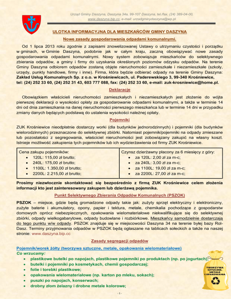 Urząd Gminy Daszyna, Daszyna 34a, 99-107 Daszyna, tel./fax. (24) 389-04-00, www.daszyna.bip.cc, e-mail: [email protected] ULOTKA INFORMACYJ NA DLA MIESZKAŃCÓW GMINY DASZYNA Nowe zasady gospodarowania odpadami komunalnymi. Od 1 lipca 2013 roku zgodnie z zapisami znowelizowanej Ustawy o utrzymaniu czystości i porządku w gminach, w Gminie Daszyna, podobnie jak w całym kraju, zaczną obowiązywać nowe zasady gospodarowania odpadami komunalnymi. Nowy system zobowiązuje mieszkańców do selektywnego zbierania odpadów, a gminy i firmy do uzyskania określonych poziomów odzysku odpadów. Na terenie Gminy Daszyna odbiorem odpadów zostaną objęte nieruchomości zamieszkałe i niezamieszkałe (szkoły, urzędy, punkty handlowe, firmy i inne). Firma, która będzie odbierać odpady na terenie Gminy Daszyna: Zakład Usług Komunalnych Sp. z o.o. w Krośniewicach, ul. Paderewskiego 3, 99-340 Krośniewice, tel: (24) 252 33 60, (24) 252 31 43, 603 777 088, fax: (24) 252 33 60, e-mail: [email protected]. Deklaracje Obowiązkiem właścicieli nieruchomości zamieszkałych i niezamieszkałych jest złożenie do wójta pierwszej deklaracji o wysokości opłaty za gospodarowanie odpadami komunalnymi, a także w terminie 14 dni od dnia zamieszkania na danej nieruchomości pierwszego mieszkańca lub w terminie 14 dni w przypadku zmiany danych będących podstawą do ustalenia wysokości należnej opłaty. Pojemniki ZUK Krośniewice nieodpłatnie dostarczy worki (dla budynków jednorodzinnych) i pojemniki (dla budynków wielorodzinnych) przeznaczone do selektywnej zbiórki. Natomiast pojemnik/pojemniki na odpady zmieszane lub pozostałości z segregowania, właściciel nieruchomości jest zobowiązany zakupić na własny koszt. Istnieje możliwość zakupienia tych pojemników lub ich wydzierżawienia od firmy ZUK Krośniewice. Cena zakupu pojemników: 120L: 115,00 zł brutto; 240L: 175,00 zł brutto; 1100L: 1.350,00 zł brutto; 2200L: 2.215,00 zł brutto; Czynsz dzierżawny płacony za 6 miesięcy z góry: za 120L: 2,00 zł za m-c; za 240L: 3,00 zł za m-c; za 1100L: 19,00 zł za m-c; za 2200L: 27,00 zł za m-c; Prosimy niezwłocznie skontaktować się bezpośrednio z firmą ZUK Krośniewice celem złożenia informacji kto jest zainteresowany zakupem lub dzierżawą pojemnika. Punkt Selektywnego Zbierania Odpadów Komunalnych (PSZOK) PSZOK – miejsce, gdzie będą gromadzone odpady takie jak: zużyty sprzęt elektryczny i elektroniczny, zużyte baterie i akumulatory, opony, papier i tektura, metale, chemikalia pochodzące z gospodarstw domowych oprócz niebezpiecznych, opakowania wielomateriałowe niekwalifikujące się do selektywnej zbiórki, odpady wielkogabarytowe, odpady budowlane i rozbiórkowe. Mieszkańcy samodzielnie dostarczają do tego punktu w/w odpady. PSZOK znajduje się w miejscowości Daszyna 34 na terenie byłej bazy RolDasz. Terminy przyjmowania odpadów w PSZOK będą ogłaszane na tablicach sołeckich a także na naszej stronie: www.daszyna.bip.cc Zasady segregacji odpadów Pojemnik/worek żółty (tworzywa sztuczne, metale, opakowania wielomateriałowe) Co wrzucamy: plastikowe butelki po napojach, plastikowe pojemniki po produktach (np. po jogurtach); butelki i pojemniki po kosmetykach, chemii gospodarczej; folie i torebki plastikowe; opakowania wielomateriałowe (np. karton po mleku, sokach); puszki po napojach, konserwach; drobny złom żelazny i drobne metale kolorowe; -1- metalowe i plastikowe nakrętki i kapsle; folie aluminiowe. Czego nie wrzucamy: pojemników zabrudzonych, tym bardziej z zawartością; tworzyw piankowych i styropianowych; pojemników po środkach chemicznych (farbach, olejach); pojemników po środkach ochrony roślin (oddajemy je do sklepu, w którym zostały zakupione); opakowań po olejach silnikowych, smarach i płynach chłodniczych; opakowań po lekach, opakowań po aerozolach; grubego plastiku, plastikowych zabawek; pieluch jednorazowych i innych art. higienicznych, baterii, termometrów, strzykawek; szkła stołowego, fajansu, porcelany i ceramiki, luster, szkła okiennego, szkła żaroodpornego, szyb z pleksy; szkła okularowego, ekranów i lamp telewizyjnych, szyb samochodowych; żarówek, lamp neonowych, fluorescencyjnych i rtęciowych; reflektorów, izolatorów, doniczek, zniczy; plastikowych elementów pojazdów, np. zderzaki, deski rozdzielcze, lusterka. PAMIĘTAJ: zgnieć opakowanie przed wrzuceniem do pojemnika, opróżnij wrzucane przedmioty z zawartości! Pojemnik/worek zielony (szkło) Co wrzucamy: opakowania ze szkła białego i kolorowego; butelki i słoiki szklane po napojach i żywności, po napojach alkoholowych; szklane opakowania po kosmetykach. Czego nie wrzucamy: szkła stołowego, fajansu, porcelany i ceramiki, luster, szkła okiennego, szyb samochodowych; żarówek, lamp neonowych, fluorescencyjnych i rtęciowych, reflektorów; izolatorów, szkła żaroodpornego, szkła okularowego, zniczy, doniczek; ekranów i lamp telewizyjnych; opakowań po lekarstwach, termometrów, strzykawek. PAMIĘTAJ: usuń nakrętki, wieczka, kapsle, usuń resztki produktów, nie tłucz szkła przed wrzuceniem! Pojemnik na odpady zmieszane co wrzucamy: pozostałe śmieci, które nie nadają się do segregacji, m.in.: worki z odkurzacza, pieluchy dziecięce, art. higieniczne, niedopałki papierosów, ścinki tapet i wykładzin podłogowych, porcelana, płytki ceramiczne, guma, resztki świec, wkłady do długopisów, potłuczone szyby, szczoteczki do zębów, zapalniczki, negatywy fotograficzne, zdjęcia, zabawki, segregatory, wychłodzony popiół, bio–odpady (jeżeli nie posiadamy kompostownika). nie wrzucamy: odpadów niebezpiecznych takich jak świetlówki, leki, baterie. UWAGA! Przeterminowane leki, opakowania po lekach - zbiórka odbywać się będzie w wyznaczonych aptekach lub punktach aptecznych na terenie gminy. Adresy tych punktów będą podawane do publicznej wiadomości. Częstotliwość odbioru odpadów Odpady niesegregowane – raz