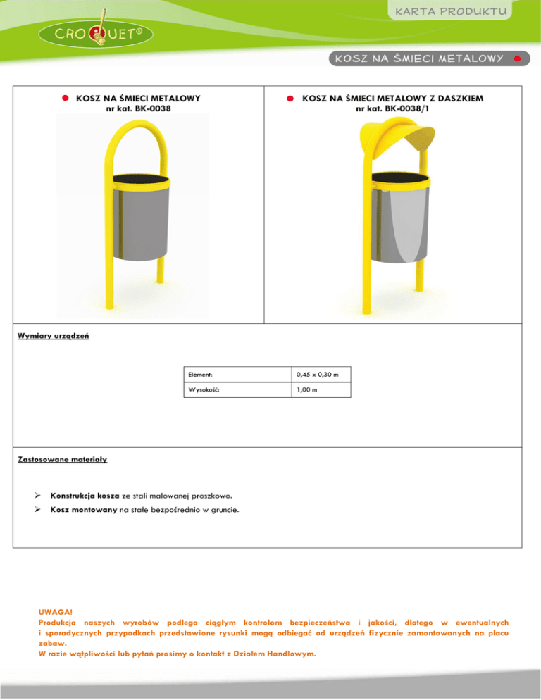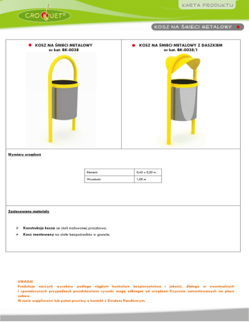 KARTA PRODUKTU Kosz na śmieci metalowy KOSZ NA ŚMIECI METALOWY nr kat. BK-0038 KOSZ NA ŚMIECI METALOWY Z DASZKIEM nr kat. BK-0038/1 Wymiary urządzeń Element: 0,45 x 0,30 m Wysokość: 1,00 m Zastosowane materiały Konstrukcja kosza ze stali malowanej proszkowo. Kosz montowany na stałe bezpośrednio w gruncie. UWAGA! Produkcja naszych wyrobów podlega ciągłym kontrolom bezpieczeństwa i jakości, dlatego w ewentualnych i sporadycznych przypadkach przedstawione rysunki mogą odbiegać od urządzeń fizycznie zamontowanych na placu zabaw. W razie wątpliwości lub pytań prosimy o kontakt z Działem Handlowym.