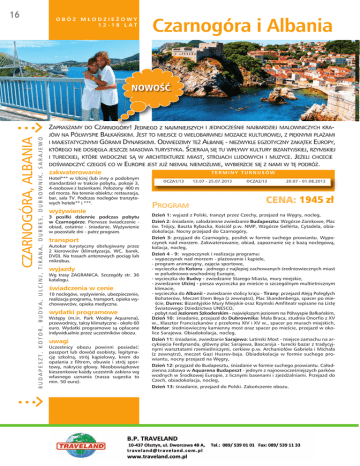 OBÓZ MŁODZIEŻOWY 12-18 LAT Czarnogóra i Albania CZARNOGÓRA, ALBANIA NOWOŚĆ ZAPRASZAMY DO CZARNOGÓRY! JEDNEGO Z NAJMNIEJSZYCH I JEDNOCZEŚNIE NAJBARDZIEJ MALOWNICZYCH KRAJÓW NA PÓŁWYSPIE BAŁKAŃSKIM. JEST TO MIEJSCE O WIELOBARWNEJ MOZAICE KULTUROWEJ, Z PIĘKNYMI PLAŻAMI I MAJESTATYCZNYMI GÓRAMI DYNARSKIMI. ODWIEDZIMY TEŻ ALBANIĘ - NIEZWYKLE EGZOTYCZNY ZAKĄTEK EUROPY, KTÓREGO NIE DOSIĘGŁA JESZCZE MASOWA TURYSTYKA. ŚCIERAJĄ SIĘ TU WPŁYWY KULTURY BIZANTYJSKIEJ, RZYMSKIEJ I TURECKIEJ, KTÓRE WIDOCZNE SĄ W ARCHITEKTURZE MIAST, STROJACH LUDOWYCH I MUZYCE. JEŻELI CHCECIE DOŚWIADCZYĆ CZEGOŚ CO W EUROPIE JEST JUŻ NIEMAL NIEMOŻLIWE, WYBIERZCIE SIĘ Z NAMI W TĘ PODRÓŻ. TERMINY TURNUSÓW Hotel*** w Ulcinj (lub inny o podobnym standardzie) w trakcie pobytu, pokoje 3, 4-osobowe z łazienkami. Położony 400 m od morza. Na terenie obiektu: restauracja, bar, sala TV. Podczas noclegów tranzytowych hotele** i ***. 3 posiłki dziennie podczas pobytu w Czarnogórze. Pierwsze świadczenie obiad, ostatnie - śniadanie. Wyżywienie w pozostałe dni - patrz program. Autokar turystyczny obsługiwany przez 2 kierowców (klimatyzacja, WC, barek, DVD). Na trasach antenowych pociąg lub mikrobus. Wg trasy ZAGRANICA. Szczegóły str. 36 katalogu. 10 noclegów, wyżywienie, ubezpieczenie, realizacja programu, transport, opieka wychowawców, opieka medyczna. Wstępy (m.in. Park Wodny Aquarena), przewodnicy, taksy klimatyczne - około 60 euro. Wydatki programowe są opłacane indywidualnie przez uczestników obozu. Uczestnicy obozu powinni posiadać: paszport lub dowód osobisty, legitymację szkolną, strój kąpielowy, krem do opalania z filtrem, obuwie i strój sportowy, nakrycie głowy. Nieobowiązkowe kieszonkowe każdy uczestnik zabiera wg własnego uznania (nasza sugestia to min. 50 euro). 1945 zł Dzień 1: wyjazd z Polski, tranzyt przez Czechy, przejazd na Węgry, nocleg, Dzień 2: śniadanie, całodzienne zwiedzanie Budapesztu: Wzgórze Zamkowe, Plac św. Trójcy, Baszta Rybacka, Kościół p.w. NMP, Wzgórze Gellérta, Cytadela, obiadokolacja. Nocny przejazd do Czarnogóry, Dzień 3: przyjazd do Czarnogóry, posiłek w formie suchego prowiantu. Wypoczynek nad morzem. Zakwaterowanie, obiad, zapoznanie się z bazą noclegową, kolacja, nocleg, Dzień 4 - 9: wypoczynek i realizacja programu: - wypoczynek nad morzem - plażowanie i kąpiele, - program animacyjny, zajęcia sportowe, - wycieczka do Kotoru - jednego z najlepiej zachowanych średniowiecznych miast w południowo-wschodniej Europie, - wycieczka do Budvy - zwiedzanie Starego Miasta, mury miejskie, - zwiedzanie Ulcinj - piesza wycieczka po mieście o szczególnym multietnicznym klimacie, - wycieczka do Albanii - zwiedzanie stolicy kraju - Tirany: przejazd Aleją Poległych Bohaterów, Meczet Etem Beya (z zewnątrz), Plac Skandenberga, spacer po mieście, Durres: Bizantyjskie Mury Miejskie oraz Rzymski Amfiteatr wpisane na Listę Światowego Dziedzictwa UNESCO, - pobyt nad Jeziorem Szkoderskim - największym jeziorem na Półwyspie Bałkańskim, Dzień 10: śniadanie, przejazd do Dubrownika: Mala Braca, studnia Onorfio z XV w., Klasztor Franciszkanów z przełomu XIV i XV w., spacer po murach miejskich, Mostar: średniowieczny kamienny most oraz spacer po mieście, przejazd w okolice Sarajewa. Obiadokolacja, nocleg, Dzień 11: śniadanie, zwiedzanie Sarajewa: Latinski Most - miejsce zamachu na arcyksięcia Ferdynanda, główny plac Sarajewa, Bascarsija - turecki bazar z tradycyjnymi warsztatami rzemieślniczymi, cerkiew p.w. Archaniołów Gabriela i Michała (z zewnątrz), meczet Gazi Husrev-beja. Obiadokolacja w formie suchego prowiantu, nocny przejazd na Węgry, Dzień 12: przyjazd do Budapesztu, śniadanie w formie suchego prowiantu. Całodzienna zabawa w Aquarena Budapeszt - jednym z najnowocześniejszych parków wodnych w Środkowej Europie, z licznymi basenami i zjeżdżalniami. Przejazd do Czech, obiadokolacja, nocleg, Dzień 13: śniadanie, przejazd do Polski. Zakończenie obozu.