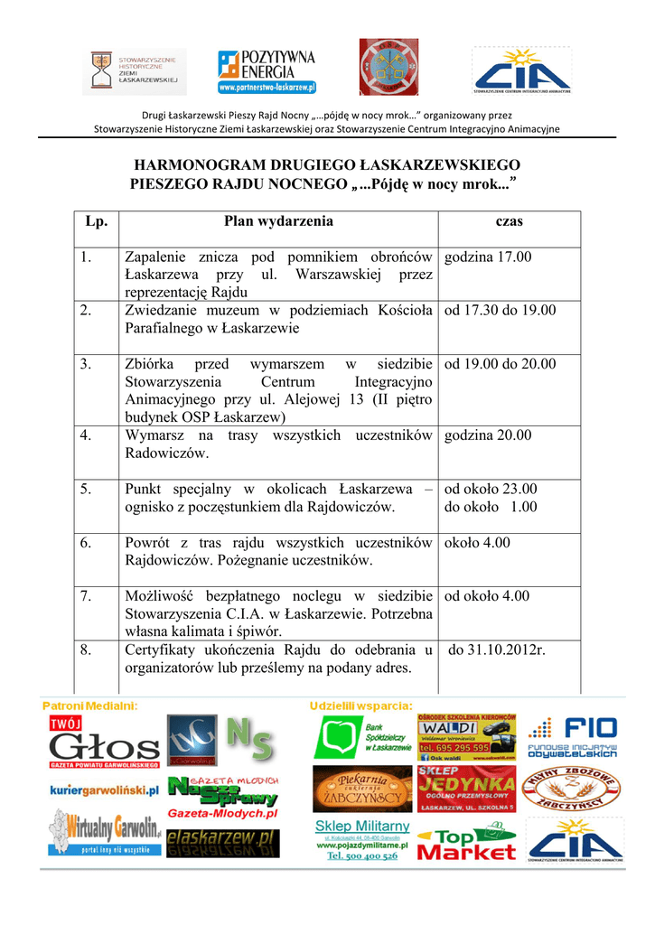 Drugi Łaskarzewski Pieszy Rajd Nocny „…pójdę w nocy mrok…” organizowany przez Stowarzyszenie Historyczne Ziemi Łaskarzewskiej oraz Stowarzyszenie Centrum Integracyjno Animacyjne HARMONOGRAM DRUGIEGO ŁASKARZEWSKIEGO PIESZEGO RAJDU NOCNEGO „...Pójdę w nocy mrok...” Lp. 1. 2. 3. 4. Plan wydarzenia czas Zapalenie znicza pod pomnikiem obrońców godzina 17.00 Łaskarzewa przy ul. Warszawskiej przez reprezentację Rajdu Zwiedzanie muzeum w podziemiach Kościoła od 17.30 do 19.00 Parafialnego w Łaskarzewie Zbiórka przed wymarszem w siedzibie od 19.00 do 20.00 Stowarzyszenia Centrum Integracyjno Animacyjnego przy ul. Alejowej 13 (II piętro budynek OSP Łaskarzew) Wymarsz na trasy wszystkich uczestników godzina 20.00 Radowiczów. 5. Punkt specjalny w okolicach Łaskarzewa – od około 23.00 ognisko z poczęstunkiem dla Rajdowiczów. do około 1.00 6. Powrót z tras rajdu wszystkich uczestników około 4.00 Rajdowiczów. Pożegnanie uczestników. 7. Możliwość bezpłatnego noclegu w siedzibie od około 4.00 Stowarzyszenia C.I.A. w Łaskarzewie. Potrzebna własna kalimata i śpiwór. Certyfikaty ukończenia Rajdu do odebrania u do 31.10.2012r. organizatorów lub prześlemy na podany adres. 8.