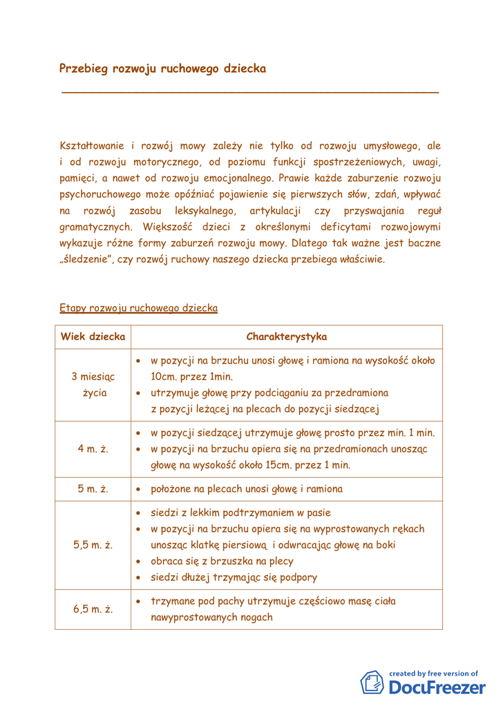 Przebieg rozwoju ruchowego dziecka ___________________________________________________ Kształtowanie i rozwój mowy zależy nie tylko od rozwoju umysłowego, ale i od rozwoju motorycznego, od poziomu funkcji spostrzeżeniowych, uwagi, pamięci, a nawet od rozwoju emocjonalnego. Prawie każde zaburzenie rozwoju psychoruchowego może opóźniać pojawienie się pierwszych słów, zdań, wpływać na rozwój zasobu leksykalnego, artykulacji czy przyswajania reguł gramatycznych. Większość dzieci z określonymi deficytami rozwojowymi wykazuje różne formy zaburzeń rozwoju mowy. Dlatego tak ważne jest baczne „śledzenie”, czy rozwój ruchowy naszego dziecka przebiega właściwie. Etapy rozwoju ruchowego dziecka Wiek dziecka Charakterystyka 3 miesiąc życia w pozycji na brzuchu unosi głowę i ramiona na wysokość około 10cm. przez 1min. utrzymuje głowę przy podciąganiu za przedramiona z pozycji leżącej na plecach do pozycji siedzącej 4 m. ż. w pozycji siedzącej utrzymuje głowę prosto przez min. 1 min. w pozycji na brzuchu opiera się na przedramionach unosząc głowę na wysokość około 15cm. przez 1 min. 5 m. ż. położone na plecach unosi głowę i ramiona siedzi z lekkim podtrzymaniem w pasie w pozycji na brzuchu opiera się na wyprostowanych rękach 5,5 m. ż. 6,5 m. ż. unosząc klatkę piersiową i odwracając głowę na boki obraca się z brzuszka na plecy siedzi dłużej trzymając się podpory trzymane pod pachy utrzymuje częściowo masę ciała nawyprostowanych nogach 7 m. ż. 7,5 m. ż. 8 m. ż. 8,5 m. ż. 9 m. ż. obraca się z pleców na brzuch w pozycji na brzuchu odrywa tułów od podłoża opierając się na rękach i kolanach odwraca głowę we wszystkich kierunkach siada samo przy lekkim podciąganiu trzymając się dwóch palców dorosłego siedzi samo opierając się na rękach, plecy pochylone do przodu siedzi przez moment wyprostowane, bez podtrzymania pełza na brzuchu za pomocą rąk, nogi nie biorą czynnego udziału podtrzymywane pod pachy podskakuje, zginając i wyprostowując kolana stoi podtrzymywane za obie ręce przez 1 min. siada samodzielnie, chwytając się podpory siedzi pewnie bez oparcia około 1 min. staje podciągane za obie ręce siada samodzielnie bez pomocy stoi z oparciem bez pomocy staje samodzielnie chwytając się podpory raczkuje trzymane pod pachy wykonuje ruchy chodzenia stąpa bokiem trzymając się obiema rękami nieruchomego oparcia stojąc z oparciem schyla się podnosi zabawkę chodzi podtrzymywane za dwie ręce 10,5 m. ż. stoi samodzielnie 11 m. ż. chodzi trzymane za jedną rękę 11,5 m. ż. staje samodzielnie chodzi samodzielnie na sztywnych i szeroko rozstawionych 9,5 m. ż. 12,5 m. ż. nogach, kołysząc się stąpa często na palcach potrafi chodzić już w różnym tempie zmienia swobodnie kierunek chodzenia, zatrzymuje się, 18 m. ż. 2 rok życia zwalnia i przyspiesza wstaje bez podtrzymywania się trzymane za rękę wchodzi po schodach potrafi zrobić kilka kroków do tyłu potrafi chwycić kredkę i mazać po kartce papieru uczy się wchodzić po schodach – jedna nóżka za drugą wchodzi na krzesło i siada bez podpierania się rękoma potrafi nawlec na nitkę duże perełki nie musi się już trzymać poręczy podczas wchodzenia po schodach 3 r. ż. 3,5 r. ż. 4 r. ż. 5 r. ż. potrafi kucać potrafi mocno kopać piłkę skakać na jednej nodze potrafi stać przez chwilę na jednej nodze zapina guziki potrafi przez chwilę skakać na jednej nodze próbuje wyciąć w kartce prostą linię biega, skacze nie upadając uczy się jeździć na rowerze przeskakuje przez niewysokie przeszkody dziecko ćwiczy równowagę na hulajnodze potrafi dłużej stać na jednej nodze potrafi balansować na murku lub linie leżącej na ziemi potrafi zeskoczyć z taboretu coraz sprawniej posługuje się nożyczkami potrafi zrobić fikołka Literatura Krawczyński, M. (2002). Propedeutyka pediatrii. Warszawa Nitsch, C., Huther, G. (2004). Wspieranie rozwoju dziecka. München Walczak, M. (1991). Zarys pediatrii. Warszawa