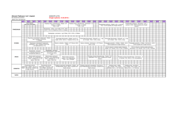 Zdrowie Publiczne I rok 1 stopień SEMESTR LETNI Rok akademicki 2015/2016 Drugie wydanie, 12.02.2016 r. Opiekun roku: mgr Dawid Łyś 8.00 8.15 8.30 8.45 9.00 9.15 9.30 9.45 Język angielski (dwie grupy równolegle) 10.00 10.15 10.30 10.45 11.00 11.15 11.30 11.45 12.00 12.15 12.30 12.45 13.00 13.15 13.30 13.45 14.00 14.15 14.30 14.45 15.00 15.15 15.30 15.45 16.00 16.15 16.30 16.45 17.00 17.15 17.30 17.45 18.00 18.15 18.30 18.45 19.00 19.15 19.30 19.45 20.00 Podstawy makro i mikroekonomii - Wykład - dr P. Karniej - s. 3, Bartla 15.02 - 14.03 Podstawy makro i mikroekonomii - Seminarium - dr P. Karniej - s. 3, Bartla 15.02 - 14.03 Propedeutyka medycyny - Wykład - prof. J. Lewczuk - 15.02 - 25.04 (rozpiska sal w drugim arkuszu) Propedeutyka medycyny - Seminarium - prof. J. Lewczuk - 22.02 - 09.05 (rozpiska sal w drugim arkuszu) Biostatystyka - wykład - mgr S. Mizia, 04.04 - 09.05, 04.04 i 11.04 w s. 25 Bartla od 18.04 w s. 20 Bartla PONIEDZIAŁEK Biostatystyka - seminarium - mgr S. Mizia, 16.05 - 23.05, s. 20 Bartla Negocjacje w placówkach medycznych - Wykład mgr J. Kulińska, 23.02-22.03, s. 20 Bartla WTOREK ŚRODA CZWARTEK PIĄTEK Negocjacje w placówkach medycznych Seminarium - mgr J. Kulińska, 05.04-10.05, s. 20, Bartla (26.04 w s. 10) Technologie informacyjne - Wykład - mgr inż. D. Kiedik - 23.02 - 22.03, s. 11 Bartla (01.03 w s. 20) Technologie informacyjne - Ćwiczenia - gr. 1 - mgr inż. D. Kiedik - 16.02 - 15.03, s. komp Technologie informacyjne - Ćwiczenia - gr. 2 - mgr inż. D. Kiedik - 16.02 - 15.03, s. komp Nauka o człowieku - Wykład - dr P. Pelczar, 29.03 07.06 Nauka o człowieku - Seminarium - dr P. Pelczar, 29.03 - 07.06 Pedagogika specjalna - dr Białas - Wykład - 22.03 26.04 (rozpiska sal w drugim arkuszu) Pedagogika specjalna - dr Białas - Seminarium - 22.03 26.04 (rozpiska sal w drugim arkuszu) Ochrona danych w systemie opieki medycznej Wykład - dr P. Pelczar, 10.05 - 07.06, s. 25 Bartla Ochrona danych w systemie opieki medycznej Seminarium - dr P. Pelczar, 10.05 - 07.06, s. 25 Bartla Biostatystyka - ćwiczenia dr A. Felinczak 06.04-25.05, sala komputerowa, Bartla, gr. 1 Biostatystyka - ćwiczenia dr A. Felinczak 06.04 - 25.05, sala komputerowa, Bartla, gr. 2 Metody badań naukowych ćwiczenia - dr. M. Wójta-Kempa, 13.04 - 1.06 Bartla, gr. 2, s. 10 Bartla, 1.06 (s. 20) Metody badań naukowych ćwiczenia - dr. M. Wójta-Kempa, 13.04 - 1.06 Bartla, gr. 1, s. 10 Bartla, 1.06 (s. 20) Propedeutyka zdrowia publicznego - wykład - mgr inż. D. Kiedik - cały semestr (rozpiska sal w drugim arkuszu) Propedeutyka zdrowia publicznego - seminariun - mgr inż. D. Kiedik - cały semestr (rozpiska sal w drugim arkuszu) Metody badań naukowych wykład - dr. M. Wójta-Kempa, 13.04 - 1.06, s. 20 Bartla Podstawy organizacji i zarządzania - Wykład - mgr M. Matuszewska (18.02 - 28.04) (rozpiska sal w drugim arkuszu) Podstawy zdrowia środowiskowego - Wykład - Prof. Całkosiński 17.02 - 06.04 (rozpiska sal w drugim arkuszu) Podstawy organizacji i zarządzania - Seminarium mgr M. Matuszewska (31.03- 28.04) (rozpiska sal w drugim arkuszu) Podstawy zdrowia środowiskowego - Seminarium - dr A. Kumala 17.02 - 06.04, s. 18 ul. Grunwaldzka 2 Podstawy prawa - wykład Podstawy prawa - seminarium mgr A. Sieńko, 18.02 - 09.06, s. mgr A. Sieńko, 18.02 - 09.06, s. 20 20 Bartla (10.03 - s. 101 Parkowa) Bartla (10.03 - s. 101 Parkowa) 20:15 20.30 Propedeutyka medycyny Data: Sala: 15.02 117 (od godz. 15:15) 22.02 117 (od godz. 15:15) 29.02 117 (od godz. 15:15) 07.03 101 ul. Parkowa 14.03 106 21.03 106 04.04 117 11.04 117 18.04 117 25.04 117 09.05 117 Propedeutyka zdrowia publicznego Data: Sala: 18.02 106 25.02 105 3.03 20 10.03 105 17.03 20 31.03 105 07.04 105 14.04 105 21.04 20 28.04 105 12.05 105 19.05 20 2.06 20 9.06 20 Pedagogika specjalna Data: Sala: 22.03 117 05.04 110 12.04 105 19.04 206 26.04 206 Podstawy zdrowia środowiskowego Data: Sala: 17.02 11 24.02 101 ul. Parkowa 02.03 20 09.03 101 ul. Parkowa 16.03 101 ul. Parkowa 23.03 11 06.04 20 Podstawy organizacji i zarządzania Wykład Data: Sala: 18.02 106 25.02 105 3.03 20 10.03 106 17.03 20 31.03 105 07.04 14 14.04 105 21.04 14 28.04 14 Podstawy organizacji i zarządzania Seminarium Data: Sala: 18.02 25 25.02 20 3.03 11 10.03 11 17.03 11 31.03 11 07.04 11 14.04 20 21.04 11 28.04 11