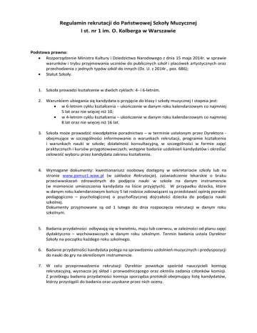 Regulamin rekrutacji do Państwowej Szkoły Muzycznej I st. nr 1 im. O. Kolberga w Warszawie Podstawa prawna: Rozporządzenie Ministra Kultury i Dziedzictwa Narodowego z dnia 15 maja 2014r. w sprawie warunków i trybu przyjmowania uczniów do publicznych szkół i placówek artystycznych oraz przechodzenia z jednych typów szkół do innych (Dz. U. z 2014r., poz. 686); Statut Szkoły. 1. Szkoła prowadzi kształcenie w dwóch cyklach: 4- i 6-letnim. 2. Warunkiem ubiegania się kandydata o przyjęcie do klasy I szkoły muzycznej I stopnia jest: w 6-letnim cyklu kształcenia – ukończenie w danym roku kalendarzowym co najmniej 5 lat oraz nie więcej niż 10; w 4-letnim cyklu kształcenia – ukończenie w danym roku kalendarzowym co najmniej 8 lat oraz nie więcej niż 16 lat. 3. Szkoła może prowadzić nieodpłatnie poradnictwo – w terminie ustalonym przez Dyrektora obejmujące w szczególności informowanie o warunkach rekrutacji, programie kształcenia i warunkach nauki w szkole; działalność konsultacyjną, w szczególności w formie zajęć praktycznych i kursów przygotowawczych; wstępne badanie uzdolnień kandydatów i określać celowość wyboru przez kandydata zakresu kształcenia. 4. Wymagane dokumenty: kwestionariusz osobowy dostępny w sekretariacie szkoły lub na stronie www.psmuz1.waw.pl (w zakładce Rekrutacja), zaświadczenie lekarskie o braku przeciwwskazań zdrowotnych do podjęcia nauki w szkole na danym instrumencie (w momencie umieszczenia kandydata na liście przyjętych). W przypadku dziecka, które w danym roku kalendarzowym kończy 5 lat rodzice zobowiązani są przedstawić opinię poradni pedagogiczno – psychologicznej o psychofizycznej dojrzałości dziecka do podjęcia nauki szkolnej. Dokumenty przyjmowane są od 1 lutego do dnia rozpoczęcia rekrutacji w danym roku szkolnym. 5. Badania przydatności odbywają się w kwietniu, maju lub czerwcu, w zależności od planu zajęć dydaktyczno – wychowawczych w danym roku szkolnym. Termin badania ustala Dyrektor Szkoły na początku każdego roku szkolnego. 6. Badanie przydatności kandydata polega na sprawdzeniu uzdolnień muzycznych i predyspozycji do nauki do gry na określonym instrumencie. 7. W celu przeprowadzenia rekrutacji Dyrektor powołuje spośród nauczycieli komisję rekrutacyjną, wyznacza jej skład i przewodniczącego oraz określa zadania członków komisji. Z przebiegu badania przydatności komisja sporządza protokół obejmujący listę kandydatów, którzy przystąpili do badania oraz uzyskane przez nich oceny. 8. Kwalifikacja kandydata odbywa się na podstawie wyników badania przydatności. Na podstawie ocen komisja sporządza listę kandydatów, którzy uzyskali wynik kwalifikujący do przyjęcia do szkoły. Protokół przechowywany jest w szkole przez cały okres kształcenia ucznia w szkole. 9. Dyrektor Szkoły na podstawie wyniku kwalifikującego podejmuje decyzję o przyjęciu kandydata do szkoły. W przypadku gdy liczba kandydatów, którzy uzyskali wynik kwalifikujący, jest większa niż liczba dostępnych miejsc, dyrektor tworzy tzw. „listę rezerwową” i podejmuje decyzję o przyjęciu z niej kandydata do szkoły w miarę możliwości organizacyjnych. 10. Kandydat może być przyjęty do klasy programowo wyższej niż pierwsza na podstawie egzaminu kwalifikacyjnego, który ma na celu sprawdzenie czy predyspozycje i poziom umiejętności kandydata odpowiadają programowi danej klasy, do której ma być przyjęty. Egzamin kwalifikacyjny przeprowadza komisja kwalifikacyjna powołana przez Dyrektora spośród nauczycieli szkoły. Na podstawie oceny protokołu komisji Dyrektor podejmuje decyzję o przyjęciu kandydata do klasy programowo wyższej. Protokół ten jest przechowywany przez cały okres kształcenia ucznia w szkole. 11. W uzasadnionych przypadkach, w szczególności w przypadku zmiany miejsca zamieszkania, jeśli istnieje możliwość organizacyjna, uczeń może być przyjęty do szkoły w ciągu roku szkolnego. Dopuszcza się również możliwość przechodzenia ucznia z jednej szkoły do drugiej. Dla tych kandydatów procedura przyjęcia odbywa się odpowiednio wg pkt.10. 12. Dyrektor ogłasza listę przyjętych Kandydatów przed dniem zakończenia zajęć dydaktycznych. 13. Decyzje komisji są niepodważalne, a odwołania rodziców mogą dotyczyć wyłącznie procedur badania przydatności . 14. Rodzice kandydatów przyjętych do szkoły zobowiązani są do potwierdzenia rozpoczęcia nauki dziecka w szkole nie później niż 14 dni od daty ogłoszenia listy przyjętych oraz przedstawić zaświadczenie o uczęszczaniu do szkoły ogólnokształcącej.