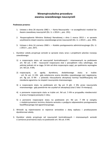 Wewnątrzszkolna procedura awansu zawodowego nauczycieli Podstawa prawna: 1. Ustawa z dnia 26 stycznia 1982 r. – Karta Nauczyciela – w szczególności rozdział 3a: Awans zawodowy nauczycieli (Dz. U. z 2014 r., poz. 191). 2. Rozporządzenie Ministra Edukacji Narodowej z dnia 1 marca 2013 r. w sprawie uzyskiwania stopni awansu zawodowego przez nauczycieli (Dz. U. z 2013 r., poz. 393). 3. Ustawa z dnia 14 czerwca 1960 r. – Kodeks postępowania administracyjnego (Dz. U. z 2013 r., poz. 267). 1. Dyrektor szkoły przyjmuje wnioski w sprawie stażu wraz z projektami planów rozwoju zawodowego: 1) o rozpoczęcie stażu od nauczycieli kontraktowych i mianowanych na podstawie art. 9d ust. 1 KN - nauczyciel rozpoczyna staż z początkiem roku szkolnego, nie później jednak niż w ciągu 14 dni od dnia rozpoczęcia zajęć, po spełnieniu wymogów art. 9d ust. 4 KN; 2) rozpoczęcie, za zgodą dyrektora, dodatkowego stażu w trybie: - art. 9c ust. 11 KN - gdy ostateczna ocena dorobku zawodowego jest negatywna, art. 9g ust. 8 KN - z powodu nieuzyskania akceptacji komisji kwalifikacyjnej lub niezdania egzaminu na stopień nauczyciela mianowanego; 3) o rozpoczęcie stażu na podstawie art. 9g ust. 8 pkt. 2 KN, przez nauczyciela mianowanego - gdy powtórnie nie uzyskał on akceptacji (staż 2 lata i 9 miesięcy); 4) o ponowne rozpoczęcie stażu w trybie art. 9d ust. 5 KN w przypadku nieobecności w pracy trwającej powyżej 1 roku; 5) o ponowne rozpoczęcie stażu na podstawie art. 9d ust. 7 KN w związku z niedotrzymaniem terminu złożenia wniosku o podjęcie odpowiednio postępowania kwalifikacyjnego lub egzaminacyjnego. 2. Wnioski są rejestrowane w rejestrze wniosków z datą wpływu i przekazywane dyrektorowi szkoły. 3. Dyrektor szkoły przyjmuje od nauczycieli kontraktowych i mianowanych wnioski o zamiarze przerwania stażu na podstawie art. 9d ust. 6 KN. 4. Dyrektor szkoły przyjmuje od nauczycieli stażystów projekty planu rozwoju zawodowego - § 3 ust.1 rozporządzenia w sprawie uzyskiwania stopni awansu zawodowego przez nauczycieli - w terminie 20 dni od rozpoczęcia zajęć. 5. Dyrektor szkoły przydziela opiekunów stażu dla nauczycieli stażystów i kontraktowych w trybie art. 9c ust. 4 KN. 1) doboru opiekuna stażu dyrektor szkoły dokonuje z uwzględnieniem następujących kryteriów: a) nauczyciel mianowany lub dyplomowany, b) nauczyciel tego samego lub pokrewnego przedmiotu, c) nauczyciel, który potrafi dzielić się swoją wiedzą i doświadczeniem; 2) wyznaczony nauczyciel akceptuje pełnienie funkcji opiekuna stażu; 3) nauczyciel stażysta lub kontraktowy może odwołać się w terminie 7 dni od decyzji o przydzieleniu opiekuna stażu do dyrektora szkoły w formie pisemnej; 4) dyrektor szkoły rozpatruje podanie nauczyciela do 7 dni od daty wpływu. Po powtórnym przeanalizowaniu kryteriów opiekuna stażu podejmuje decyzję, którą przekazuje nauczycielowi na piśmie. Decyzja dyrektora jest ostateczna; 5) opiekun stażu nauczyciela stażysty jest zobowiązany do hospitacji nauczyciela jeden raz w miesiącu oraz do przeprowadzenia 2 lekcji w miesiącu w obecności nauczyciela stażysty. Z lekcji hospitowanych opiekun sporządza arkusz hospitacji, a z lekcji obserwowanych stażysta sporządza notatki na swój użytek. Opiekun i stażysta mogą spisać kontrakt, nie jest to konieczne; 6) opiekun stażu nauczyciela kontraktowego dzieli się ze stażystą i doświadczeniem, pomaga stażyście w gromadzeniu dokumentacji. wiedzą 6. Dyrektor szkoły zatwierdza plan rozwoju zawodowego na okres stażu w trybie art. 9c ust. 3 KN (w terminie 30 dni od rozpoczęcia zajęć - § 3 ust. 3 rozporządzenia w sprawie uzyskiwania stopni awansu zawodowego przez nauczycieli) w 2 egzemplarzach, składając podpis i datę na planie. Jeden egzemplarz zatwierdzonego planu otrzymuje nauczyciel, drugi znajduje się u dyrektora szkoły. W przypadku braku akceptacji planu dyrektor szkoły zwraca go nauczycielowi do poprawy z pisemnym wskazaniem zakresu niezbędnych zmian. Nauczyciel po niezwłocznym dokonaniu zmian ponownie przedkłada projekt do akceptacji. 7. Dyrektor szkoły wyraża na podstawie § 4 ust. 3 rozporządzenia w sprawie uzyskiwania stopni awansu zawodowego przez nauczycieli, zgodę na wprowadzenie przez nauczyciela zmian w planie rozwoju zawodowego w trakcie trwania stażu. 2 8. W szczególnie uzasadnionych przypadkach, na podstawie § 4 ust. 2 rozporządzenia w sprawie uzyskiwania stopni awansu zawodowego przez nauczycieli, w trakcie stażu dyrektor szkoły: 1) pisemnie zobowiązuje nauczyciela do korekty planu rozwoju zawodowego w trakcie stażu; 2) dokonuje zmiany nauczycielowi opiekuna stażu. 9. Dyrektor szkoły przyjmuje od nauczycieli sprawozdania z realizacji planu rozwoju zawodowego za okres stażu na podstawie art. 9 c ust. 3 KN w terminie określonym w § 4 ust. 4 rozporządzenia w sprawie uzyskiwania stopni awansu zawodowego przez nauczycieli (30 dni od dnia zakończenia stażu), w dwóch egzemplarzach. 10. Dyrektor szkoły sprawdza rzetelność sprawozdania z: 1) protokolarzem konferencji rady pedagogicznej; 2) przydziałem czynności w okresie odbywania stażu; 3) kartą informacyjną o pracy nauczyciela wypełnianą każdorazowo pod koniec roku szkolnego oraz dołączonymi kopiami dokumentów potwierdzających dokonania nauczyciela; 4) aktami osobowymi, 11. Dyrektor szkoły dokonuje pełnej analizy formalnej dokumentacji wymaganej rozporządzeniem w sprawie uzyskiwania stopni awansu zawodowego przez nauczycieli. 12. W przypadku braku możliwości sprawdzenia rzetelności sprawozdania w w/w dokumentach dyrektor szkoły może domagać się dodatkowego udokumentowania. Jeżeli dokumentacja nie spełnia wymogów formalnych dyrektor ustala niezbędne poprawki i wyznacza ostateczny termin ich wprowadzenia. 13. Dyrektor szkoły zalicza nauczycielom, w trybie art. 9f ust. 2 KN, dotychczasowy staż odbyty w innej szkole w związku ze zmianą miejsca zatrudnienia, przy pozyt