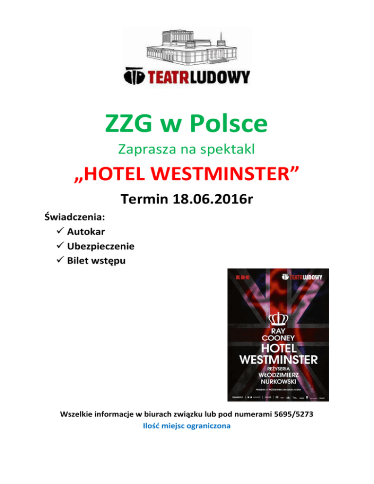 ZZG w Polsce Zaprasza na spektakl „HOTEL WESTMINSTER” Termin 18.06.2016r Świadczenia: Autokar Ubezpieczenie Bilet wstępu Wszelkie informacje w biurach związku lub pod numerami 5695/5273 Ilość miejsc ograniczona