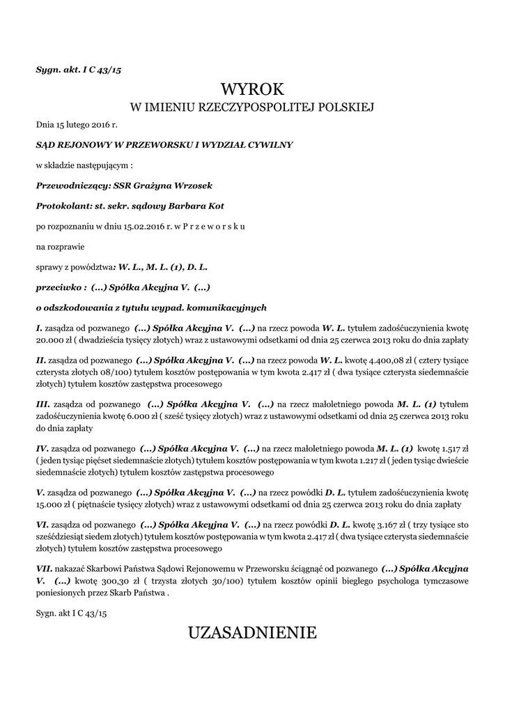 Sygn. akt. I C 43/15 WYROK W IMIENIU RZECZYPOSPOLITEJ POLSKIEJ Dnia 15 lutego 2016 r. SĄD REJONOWY W PRZEWORSKU I WYDZIAŁ CYWILNY w składzie następującym : Przewodniczący: SSR Grażyna Wrzosek Protokolant: st. sekr. sądowy Barbara Kot po rozpoznaniu w dniu 15.02.2016 r. w P r z e w o r s k u na rozprawie sprawy z powództwa: W. L., M. L. (1), D. L. przeciwko : (...) Spółka Akcyjna V. (...) o odszkodowania z tytułu wypad. komunikacyjnych I. zasądza od pozwanego (...) Spółka Akcyjna V. (...) na rzecz powoda W. L. tytułem zadośćuczynienia kwotę 20.000 zł ( dwadzieścia tysięcy złotych) wraz z ustawowymi odsetkami od dnia 25 czerwca 2013 roku do dnia zapłaty II. zasądza od pozwanego (...) Spółka Akcyjna V. (...) na rzecz powoda W. L. kwotę 4.400,08 zł ( cztery tysiące czterysta złotych 08/100) tytułem kosztów postępowania w tym kwota 2.417 zł ( dwa tysiące czterysta siedemnaście złotych) tytułem kosztów zastępstwa procesowego III. zasądza od pozwanego (...) Spółka Akcyjna V. (...) na rzecz małoletniego powoda M. L. (1) tytułem zadośćuczynienia kwotę 6.000 zł ( sześć tysięcy złotych) wraz z ustawowymi odsetkami od dnia 25 czerwca 2013 roku do dnia zapłaty IV. zasądza od pozwanego (...) Spółka Akcyjna V. (...) na rzecz małoletniego powoda M. L. (1) kwotę 1.517 zł ( jeden tysiąc pięćset siedemnaście złotych) tytułem kosztów postępowania w tym kwota 1.217 zł ( jeden tysiąc dwieście siedemnaście złotych) tytułem kosztów zastępstwa procesowego V. zasądza od pozwanego (...) Spółka Akcyjna V. (...) na rzecz powódki D. L. tytułem zadośćuczynienia kwotę 15.000 zł ( piętnaście tysięcy złotych) wraz z ustawowymi odsetkami od dnia 25 czerwca 2013 roku do dnia zapłaty VI. zasądza od pozwanego (...) Spółka Akcyjna V. (...) na rzecz powódki D. L. kwotę 3.167 zł ( trzy tysiące sto sześćdziesiąt siedem złotych) tytułem kosztów postępowania w tym kwota 2.417 zł ( dwa tysiące czterysta siedemnaście złotych) tytułem kosztów zastępstwa procesowego VII. nakazać Skarbowi Państwa Sądowi Rejonowemu w Przeworsku ściągnąć od pozwanego (...) Spółka Akcyjna V. (...) kwotę 300,30 zł ( trzysta złotych 30/100) tytułem kosztów opinii biegłego psychologa tymczasowe poniesionych przez Skarb Państwa . Sygn. akt I C 43/15 UZASADNIENIE wyroku z dnia 15 lutego 2016 r W ostatecznie sprecyzowanym żądaniu pozwu k. 222 powodowie W. L. , małoletni M. L. (1) reprezentowany przez ojca W. L. i D. L. domagali się zasądzenia od pozwanego (...) SPÓŁKA AKCYJNA V. (...) „ zapłaty zadośćuczynienia na rzecz powoda W. L. po śmierci matki M. L. (2) kwoty 20,000 zł wraz z ustawowymi odsetkami od dnia 25.06.2013r do dnia zapłaty , na rzecz małoletniego powoda M. L. (1) po śmierci babki kwoty 6000 zł z ustawowymi odsetkami od dnia 25.06. 2013 r do dnia zapłaty , na rzecz powódki D. L. po śmierci siostry M. L. (2) kwoty 15,000 zł , wraz z ustawowymi odsetkami od dnia 25.06.2013 r do dnia zapłaty . Na uzasadnienie swojego roszczenia podali ,ze w dniu 13 czerwca 2012 r M. L. (2) została potrącona przez samochód prowadzony przez A. K. , którą Sąd Rejonowy w Jarosławiu XI Zamiejscowy Wydział Karny z siedzibą w P. wyrokiem z dnia 24 stycznia 2013 r sygn.. akt VI K 49 /13 uznał za winną nieumyślnego naruszenia zasad bezpieczeństwa w ruchu lądowym czym doprowadziła do potrącenia M. L. (2) , która w wyniku tego zdarzenia zmarła . Ponieważ skazana posiadała polisę odpowiedzialności cywilnej u pozwanego , powodowie zwrócili się o wypłatę zadośćuczynienia w sposób dobrowolny i ten wypłacił na rzecz powoda W. L. kwotę 10,000 zł , na rzecz M. 2500 zł i na rzecz D. L. kwoty 7500 zł . Dalej podali oni ,że wypłacone przez pozwanego kwoty są niskie zważywszy ,że pomiędzy nimi , a zmarłą były bardzo bliskie i silne więzi rodzinne , a zamarła do w dniu wypadku była osobą sprawną fizycznie i intelektualnie , a jej śmierć była zdarzeniem nagłym , którego nie dało się przewidzieć i każdego z powodów napełniła smutkiem i wielkim żalem . Na koniec powodowie naprowadzali ,że ubezpieczyciel przypuszczalnie na podstawie opinii biegłego sadowego wydanej w procesie karnym przyjął i uznał ,że zmarła M. L. (2) przyczyniła się do wypadku w 50 % i stąd taka wysokość wypłaconych kwot to jednak dalej w swoich wywodach podnosili , że to sprawczyni wypadku jechała z niedozwoloną prędkością i nie zachowała należytej ostrożności zbliżając się do przejścia dla pieszych . Na koniec powodowie podali , że jak wynika z orzecznictwa sądów , zadośćuczynienie za doznana krzywdę spowodowaną śmiercią osoby najbliższej ma celu odzwierciedlenie w formie pieniężnej rozmiaru krzywdy spowodowanej utratą osoby najbliższej , której nie można przeliczyć na pieniądze jednak kwoty wypłacone przez pozwanego są zaniżone i dlatego wystąpienie z przedmiotowym pozwem o wypłatę sum dodatkowych jest konieczne i uzasadnione . Strona pozwana w odpowiedzi na pozew k.44 i k. 225-k.226 wnosiła o oddalenie każdego z powództw w całości podnosząc ,że wypłacone kwoty na rzecz powodów w postępowaniu likwidacyjnym uwzględniały 50 % przyczynienie się do zaistniałego wypadku zmarłej M. L. (2) , a przeprowadzone postepowanie likwidacyjne wykazało , iż powodowie w trudnym dla siebie momencie mogli i nadal mogą liczyć na wzajemne wsparcie najbliższej rodziny , a fakt ten miał niewątpliwy wpływał na łatwiejsze znoszenie żałoby po śmierci M. L. (2) ,a nadto podnieśli ,że w chwili śmierci matki powód W. L. był osobą pełnoletnia od kilkunastu lat tworząc ze swą żoną i synem rodzinę tym samym był osoba ukształtowana emocjonalnie , a skoncentrowany na własnej rodzinie ,a śmierć matki poza smutkiem i żalem nie spowodowała dla niego żadnych negatywnych skutków jak brak poczucia bezpieczeństwa , efektywnej pomocy czy osamotnienia . Odn