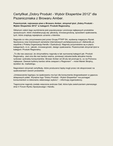 Certyfikat „Dobry Produkt - Wybór Ekspertów 2012” dla Pszeniczniaka z Browaru Amber. Pszeniczniak, najnowsze piwo z Browaru Amber, otrzymał tytuł „Dobry Produkt Wybór Ekspertów 2012” w kategorii: Produkt Regionalny. Głównym celem tego wyróżnienia jest popularyzacja i promocja najlepszych produktów spożywczych, które charakteryzują się: jakością, innowacyjnością, sposobem opakowania, tych, które znajdują największe uznanie u klientów. Nagroda co roku przyznawana jest przez Grupę PTWP SA, wydawcę magazynu Rynek Spożywczy oraz branżowych serwisów internetowych portalspozywczy.pl i dlahandlu.pl, wspólnie z Polską Organizacją Handlu i Dystrybucji. Nagrody przyznawane są w pięciu kategoriach, m.in.: jakość, innowacyjność, design opakowania. Pszeniczniak otrzymał tytuł w kategorii: Produkt Regionalny. „To dla nas zaszczyt, że otrzymaliśmy nagrodę w tak wymownej kategorii jak: Produkt Regionalny. Jest ona dla nas bardzo ważna, ponieważ odzwierciedla aktualne trendy rynkowe i potrzeby konsumentów. Browar Amber od 20-stu lat promuje to, co na Pomorzu najlepsze. Zawsze byliśmy bardzo silnie związani z Regionem” – mówi Marek Skrętny, dyrektor ds. marketingu. Nagrodzeni otrzymali certyfikaty, które producenci będą mogli przez rok eksponować na opakowaniach swoich produktów. „Umieszczenie logotypu na opakowaniu ma być dla konsumenta drogowskazem w gąszczu sklepowych półek. Wyraźne logo "Dobry Produkt - Wybór Ekspertów" ma pomagać konsumentom w dokonaniu właściwego wyboru” – informują organizatorzy. Tegoroczne nagrody zostały wręczone podczas Gali, która była zwieńczeniem pierwszego dnia V Forum Rynku Spożywczego i Handlu.