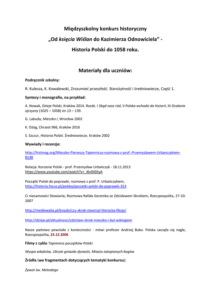 Międzyszkolny konkurs historyczny „Od księcia Wiślan do Kazimierza Odnowiciela” Historia Polski do 1058 roku. Materiały dla uczniów: Podręcznik szkolny: R. Kulesza, K. Kowalewski, Zrozumieć przeszłość. Starożytność i średniowiecze, Część 1. Syntezy i monografie, na przykład: A. Nowak, Dzieje Polski, Kraków 2014. Rozdz. I Skąd nasz ród, II Polska wchodzi do historii, III Ocalanie ojczyzny (1025 – 1058) str.13 – 139. G. Labuda, Mieszko I, Wrocław 2002 K. Ożóg, Chrzest 966, Kraków 2016 S. Szczur, Historia Polski. Średniowiecze, Kraków 2002 Wywiady i recenzje: http://histmag.org/Mieszko-Pierwszy-Tajemniczy-rozmowa-z-prof.-Przemyslawem-Urbanczykiem8138 Relacja: Korzenie Polski - prof. Przemysław Urbańczyk - 18.11.2013 https://www.youtube.com/watch?v=_i6vIl4DtyA Początki Polski do poprawki, rozmowa z prof. P. Urbańczykiem, http://historia.focus.pl/polska/poczatki-polski-do-poprawki-353 Ci niesamowici Słowianie, Rozmowa Rafała Geremka ze Zdzisławem Skrokiem, Rzeczpospolita, 27-102007 http://mediewalia.pl/ksiazki/czy-skrok-stworzyl-literacka-fikcje/ http://dzieje.pl/aktualnosci/zdzislaw-skrok-mieszko-i-byl-wikingiem Nasze państwo powstało z konieczności - mówi profesor Andrzej Buko. Polska zaczęła się nagle, Rzeczpospolita, 23.12.2006 Filmy z cyklu Tajemnice początków Polski: Wyspa władców, Ukryte gniazdo dynastii, Miasto zatopionych bogów Źródła (we fragmentach dotyczących tematyki konkursu): Żywot św. Metodego Dogome iudex Anonim tzw. Gall, Kronika Polska, przeł. R. Grodecki, Wrocław 1989 Kronika Thietmara, Ibrahim ibn Jakub, opis kraju Mesko Kronika Kosmasa, Powieść minionych lat Geograf bawarski, Opis grodów i ziem z północnej strony Dunaju Kronika Widukinda Mistrz Wincenty (tzw. Kadłubek), Kronika Polska, Wrocław 1992 Ikonografia Drzwi Gnieźnieńskich Wizyta w Muzeum Archidiecezjalnym w Krakowie