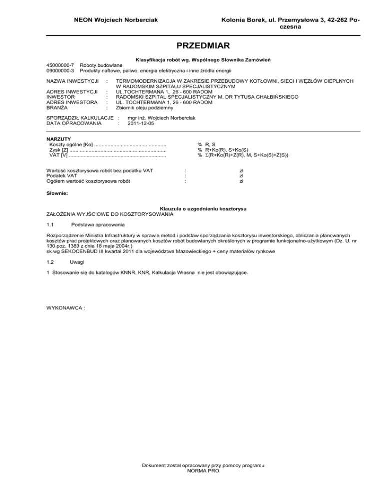NEON Wojciech Norberciak Kolonia Borek, ul. Przemysłowa 3, 42-262 Poczesna PRZEDMIAR 45000000-7 09000000-3 Klasyfikacja robót wg. Wspólnego Słownika Zamówień Roboty budowlane Produkty naftowe, paliwo, energia elektryczna i inne źródła energii NAZWA INWESTYCJI : ADRES INWESTYCJI INWESTOR ADRES INWESTORA BRANśA : : : : TERMOMODERNIZACJA W ZAKRESIE PRZEBUDOWY KOTŁOWNI, SIECI I WĘZŁÓW CIEPLNYCH W RADOMSKIM SZPITALU SPECJALISTYCZNYM UL.TOCHTERMANA 1, 26 - 600 RADOM RADOMSKI SZPITAL SPECJALISTYCZNY M. DR TYTUSA CHAŁBIŃSKIEGO UL. TOCHTERMANA 1, 26 - 600 RADOM Zbiornik oleju podziemny SPORZĄDZIŁ KALKULACJE : DATA OPRACOWANIA : mgr inŜ. Wojciech Norberciak 2011-12-05 NARZUTY Koszty ogólne [Ko] ................................................. Zysk [Z] .................................................................. VAT [V] .................................................................. Wartość kosztorysowa robót bez podatku VAT Podatek VAT Ogółem wartość kosztorysowa robót % R, S % R+Ko(R), S+Ko(S) % Σ(R+Ko(R)+Z(R), M, S+Ko(S)+Z(S)) : : : zł zł zł Słownie: Klauzula o uzgodnieniu kosztorysu ZAŁOśENIA WYJŚCIOWE DO KOSZTORYSOWANIA 1.1 Podstawa opracowania Rozporządzenie Ministra Infrastruktury w sprawie metod i podstaw sporządzania kosztorysu inwestorskiego, obliczania planowanych kosztów prac projektowych oraz planowanych kosztów robót budowlanych określonych w programie funkcjonalno-uŜytkowym (Dz. U. nr 130 poz. 1389 z dnia 18 maja 2004r.) sk wg SEKOCENBUD III kwartał 2011 dla województwa Mazowieckiego + ceny materiałów rynkowe 1.2 Uwagi 1 Stosowanie się do katalogów KNNR, KNR, Kalkulacja Własna nie jest obowiązujące. WYKONAWCA : Dokument został opracowany przy pomocy programu NORMA PRO Zbiornik podziemny Lp. Nazwa Kosztorys netto VAT Razem brutto TABELA ELEMENTÓW SCALONYCH Robocizna Materiały Słownie: -2- Norma PRO Wersja 4.27 Licencja: 21348 dla wn Sprzęt Ko Z RAZEM Zbiornik podziemny PRZEDMIAR Lp. Podstawa Opis i wyliczenia j.m. 1 Roboty montaŜowe 1 Prace przygotowawcze do modernizacji zbiornika przez wykonania przestrzeni kpl d.1 kalk. własna monitorowane rozkręcenie włazów zbiornikowych przepompowanie do pojemników inwestora wybieranie osadów i zanieczyszczeń , wytarcie powierzchni do sucha mycie zbiornika lub wentylowanie skręcenie włazów zbiornikowych z wymianą uszczelki na nową Rewizja wewnetrzna - udział naszego przedstawiciela Utylizacja odpadów ropopochodnych Pomiary grubości płaszcza stalowego Próba szczel. zb. przed modernizacją w obec. urzędnika UDT(met. Uprawn.) 1 kpl 2 Dokumentacja modernizacyjna zbiornika do zatwierdzenia przez UDT d.1 kalk. własna 1 kpl 3 Modernizacja zbiornika przez wykonanie drugiego płaszcza - 178 m2 d.1 kalk. własna 1 kpl 4 MontaŜ urządzeń do monitoringu Centralka PETROVend SiteSentinel 1 d.1 kalk. własna Centralka podciśnieniowa monitorująca wszystkie zbiorniki Pb i ON Wykonanie instalacji systemu monitoringu (układ przewodów ) ok. 30 mb Zakup oraz montaŜ czujników Próba szczelności przestrzeni monitorującej w obecności UDT 1 kpl 5 Prace modernizacyjne dodatkowe d.1 kalk. własna System do ciągłego pomiaru paliwa wraz z montaŜem dla 2 zbiorników kable do podłączenia ok. 30 mb drukarka sondy z świadectwem wzorcowania, ,montaŜ,uruchomienie, szkolenie 1 kpl -3- Norma PRO Wersja 4.27 Licencja: 21348 dla wn kpl kpl kpl kpl Poszcz Razem 1.000 RAZEM 1.000 1.000 RAZEM 1.000 1.000 RAZEM 1.000 1.000 RAZEM 1.000 1.000 RAZEM 1.000