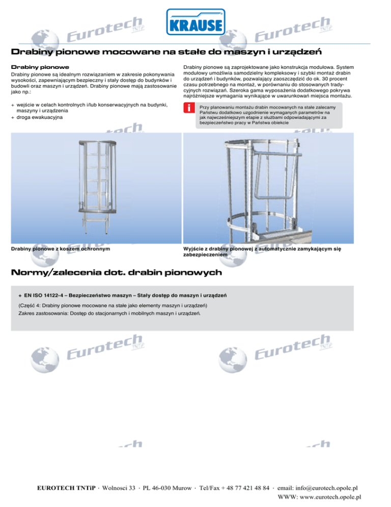 Drabiny pionowe mocowane na stałe do maszyn i urza ˛ dzeń Drabiny pionowe Drabiny pionowe są idealnym rozwiązaniem w zakresie pokonywania wysokości, zapewniającym bezpieczny i stały dostęp do budynków i budowli oraz maszyn i urządzeń. Drabiny pionowe mają zastosowanie jako np.: + wejście w celach kontrolnych i/lub konserwacyjnych na budynki, maszyny i urządzenia + droga ewakuacyjna Drabinypionowezkoszemochronnym Drabiny pionowe są zaprojektowane jako konstrukcja modułowa. System modułowy umożliwia samodzielny kompleksowy i szybki montaż drabin do urządzeń i budynków, pozwalający zaoszczędzić do ok. 30 procent czasu potrzebnego na montaż, w porównaniu do stosowanych tradycyjnych rozwiązań. Szeroka gama wyposażenia dodatkowego pokrywa najróżniejsze wymagania wynikające w uwarunkowań miejsca montażu. i Przy planowaniu montażu drabin mocowanych na stałe zalecamy Państwu dodatkowo uzgodnienie wymaganych parametrów na jak najwcześniejszym etapie z służbami odpowiadającymi za bezpieczeństwo pracy w Państwa obiekcie Wyjściezdrabinypionowejzautomatyczniezamykającymsię zabezpieczeniem Normy/zalecenia dot. drabin pionowych + ENISO14122-4–Bezpieczeństwomaszyn–Stałydostępdomaszyniurządzeń (Część 4: Drabiny pionowe mocowane na stałe jako elementy maszyn i urządzeń) Zakres zastosowania: Dostęp do stacjonarnych i mobilnych maszyn i urządzeń. EUROTECH TNTiP . Wolnosci 33 . PL 46-030 Murow . Tel/Fax + 48 77 421 48 84 . email: [email protected] WWW: www.eurotech.opole.pl Drabiny pionowe według normy PN-EN ISO 14122-4 Drabiny pionowe mocowane na stałe do maszyn i urza ˛ dzeń Zakresstosowania Dostęp do maszyn i urządzeń Planowanieiużytkowanie Drabiny pionowe mocowane do maszyn i urządzeń umożliwiają dostęp przy wykonywaniu prac serwisowych i kontrolnych, jak też napraw i prac porządkowych. n mi n x. 50 0m m n. mi mm 00 10 max. 1500 mm max. 1500 mm max. 2000 mm 22003000 mm ma x. 50 mm 0m m max. 2000 mm min. 1600 mm ma max. 6,0 m mm 00 1 .1 mi 2200-2300 mm do dolnej krawędzi pałąka max. 6,0 m Wysokość w pionie od 3-10 m mm min. 1680 mm górnej krawędzi szczebla n mi 00 0 .1 00 1 .1 22003000 mm 140-380 mm max. 500 mm 16 140-380 mm max. 500 mm Ważne–należyprzestrzegaćnastępującewytyczne: + od wysokości ponad 3 m wymagane są pałąki ochronne zabezpieczające przed upadkiem + od wysokości ponad 10 m należy stosować konstrukcje wielo-ciągowe (ciągi przesunięte względem siebie), maksymalna długość ciągu nie może przekraczać 6 m + Jeśli ze względów konstrukcyjnych nie można wykonać konstrukcji wielo-ciągowej ( o przesuniętych ciągach), możliwy jest montaż drabiny jedno-ciągowej o długości powyżej 10 m, jednakże w tym przypadku należy zastąpić platformę przejściową platformą składaną (nr kat. 835 475) + na odcinku przejścia z jednego ciągu na drugi, elementy niższego ciągu mogą być dłuższe + jeżeli szczelina przy wyjściu jest większa niż 75 mm należy ją zmniejszyć montując dodatkowo stopień zejścia + przy niebezpiecznych wyjściach należy stosować barierki przymocowane do drabiny (obustronnie), patrz: DIN EN ISO 14122-4. + przy wyjściu drabiny wymagana jest barierka zabezpieczająca (nr kat. 835 499) + maksymalny rozstaw pałąków zabezpieczających wynosi 1500 mm + minimalna odległość drabiny od ściany wynosi 150 mm + maksymalna odległość pomiędzy pomostami spoczynkowymi wynosi 8000 – 10000 mm + maksymalna odległość pomiędzy kotwami wynosi 2000 mm EUROTECH TNTiP . Wolnosci 33 . PL 46-030 Murow . Tel/Fax + 48 77 421 48 84 . email: [email protected] WWW: www.eurotech.opole.pl Drabiny pionowe według normy PN-EN ISO 14122-4 max. 6,0 m n. mi n. mi mm 00 10 ma x. max. 1500 mm m 0m 0 11 50 Wielkość szczeliny max. 75 0m m min. 150 min. 1680 mm von Sprosse min. 200 max. 2000 mm min. 1600 mm Drabiny pionowe, jedno-cia ˛ gowe wg normy PN-EN-14122-4 Drabiny pionowe mocowane na stałe do maszyn i urza ˛ dzeń do max wysokości wejścia 10 m, z koszem ochronnym Wysokość wejścia w pionie do m 5,60 6,44 7,28 8,40 9,52 Długość drabiny łącznie z belką zejścia 6,70 7,54 8,38 9,50 10,62 836212 M 836229 M 836236 M 836243M 836250 M – – – – 2 1 – 3 2 1 2 – – 2 2 2 2 12 Nrkat. Stal ocynkowana Element drabiny 1,96 m 2200-2300 mm 2 – bis UK Rücken2 schutzbügel max. 6,0 m Element drabiny 2,80 m Element drabiny 3,64 m Belka zejścia Kotwa murowa sztywna (odl. od ściany 200 mm) 8 8 8 10 Pałąk zabezpieczający, Ø 700 mm 4 5 5 6 7 Podpora zabezpieczająca, długość 3000 mm 7 10 10 12 15 Łącznik drabin pionowych 2 2 2 4 6 Drabiny pionowe , wielo-cia ˛gowe według PN-EN-14122 Drabiny pionowe mocowane na stałe do maszyn i urza ˛ dzeń do wysokości wejścia powyżej 10 m, 2200z koszem ochronnym 3000 mm Maksymalna wysokość drabiny w jednym ciągu nie może przekraczać 6 m. Wysokość wejścia w pionie do m 10,92 11,76 13,16 14,00 15,12 15,96 16,80 17,64 18,76 Długość drabiny łącznie z belka zejścia ok. m 12,02 12,86 14,26 15,10 16,22 17,06 17,90 18,74 19,86 836007M 836014M 836021M 836038M 836045 M 836052M 836069M 836076M 836083M 1 1 1 1 2 1 1 1 1 4 3 3 2 3 4 3 6 2 Nrkat. Stal ocynkowana 140-380 mm Element drabiny 1,96 m Element drabiny 2,80 m max. 500 mm Element drabiny 3,64 m – 1 2 3 2 2 3 1 5 Belka zejścia 2 2 2 2 2 2 2 2 2 Kotwa murowa sztywna (odl. od ściany 200 mm) 18 18 26 26 28 28 28 30 36 Pałąk zabezpieczający, Ø 700 mm 8 9 10 11 11 12 13 14 15 Podpora zabezpieczająca, długość 3000 mm 19 24 26 26 31 31 31 31 39 Pałąk zabezpieczający � 4 4 8 8 8 8 8 8 12 Verbinder für Doppelring 2 2 4 4 4 4 4 4 6 Platforma przejściowa 1 1 2 2 2 2 2 2 3 Łącznik drabin pionowych 6 6 6 6 8 8 8 10 8 EUROTECH TNTiP . Wolnosci 33 . PL 46-030 Murow . Tel/Fax + 48 77 421 48 84 . email: [email protected] WWW: www.eurotech.opole.pl Elementy systemu Element drabiny 1,96 m Element drabiny 2,80 m Wersja Nrkat. Wersja Nrkat. Stal ocyn