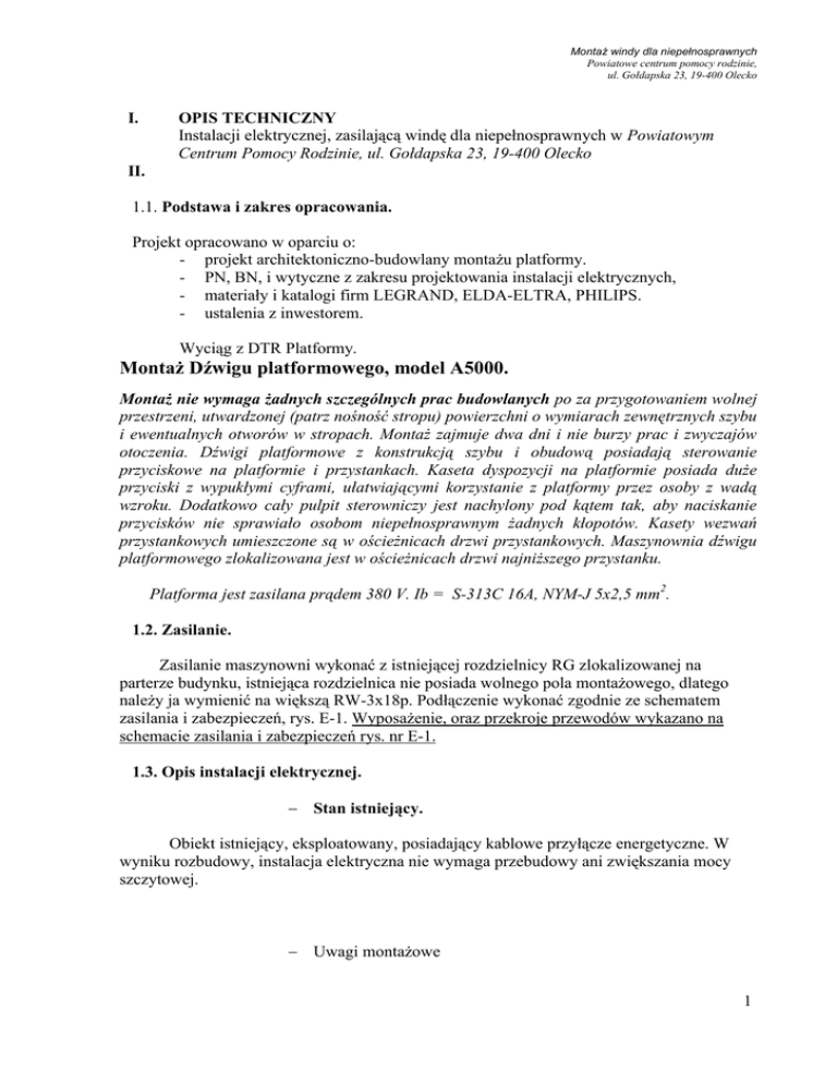 Montaż windy dla niepełnosprawnych Powiatowe centrum pomocy rodzinie, ul. Gołdapska 23, 19-400 Olecko I. OPIS TECHNICZNY Instalacji elektrycznej, zasilającą windę dla niepełnosprawnych w Powiatowym Centrum Pomocy Rodzinie, ul. Gołdapska 23, 19-400 Olecko II. 1.1. Podstawa i zakres opracowania. Projekt opracowano w oparciu o: - projekt architektoniczno-budowlany montażu platformy. - PN, BN, i wytyczne z zakresu projektowania instalacji elektrycznych, - materiały i katalogi firm LEGRAND, ELDA-ELTRA, PHILIPS. - ustalenia z inwestorem. Wyciąg z DTR Platformy. Montaż Dźwigu platformowego, model A5000. Montaż nie wymaga żadnych szczególnych prac budowlanych po za przygotowaniem wolnej przestrzeni, utwardzonej (patrz nośność stropu) powierzchni o wymiarach zewnętrznych szybu i ewentualnych otworów w stropach. Montaż zajmuje dwa dni i nie burzy prac i zwyczajów otoczenia. Dźwigi platformowe z konstrukcją szybu i obudową posiadają sterowanie przyciskowe na platformie i przystankach. Kaseta dyspozycji na platformie posiada duże przyciski z wypukłymi cyframi, ułatwiającymi korzystanie z platformy przez osoby z wadą wzroku. Dodatkowo cały pulpit sterowniczy jest nachylony pod kątem tak, aby naciskanie przycisków nie sprawiało osobom niepełnosprawnym żadnych kłopotów. Kasety wezwań przystankowych umieszczone są w ościeżnicach drzwi przystankowych. Maszynownia dźwigu platformowego zlokalizowana jest w ościeżnicach drzwi najniższego przystanku. Platforma jest zasilana prądem 380 V. Ib = S-313C 16A, NYM-J 5x2,5 mm2. 1.2. Zasilanie. Zasilanie maszynowni wykonać z istniejącej rozdzielnicy RG zlokalizowanej na parterze budynku, istniejąca rozdzielnica nie posiada wolnego pola montażowego, dlatego należy ja wymienić na większą RW-3x18p. Podłączenie wykonać zgodnie ze schematem zasilania i zabezpieczeń, rys. E-1. Wyposażenie, oraz przekroje przewodów wykazano na schemacie zasilania i zabezpieczeń rys. nr E-1. 1.3. Opis instalacji elektrycznej. Stan istniejący. Obiekt istniejący, eksploatowany, posiadający kablowe przyłącze energetyczne. W wyniku rozbudowy, instalacja elektryczna nie wymaga przebudowy ani zwiększania mocy szczytowej. Uwagi montażowe 1 Montaż windy dla niepełnosprawnych Powiatowe centrum pomocy rodzinie, ul. Gołdapska 23, 19-400 Olecko Maszynownię dostarczoną w komplecie przez dostawcę, zasilić przewodem NYM-J5x2,5 mm2, układanym na tynku w kanale kablowym lub w rurce RL. Ochrona od porażeń. Rozdział przewodu PEN winien być wykonany w RG, a miejsce rozdziału uziemić, rezystancja uziemienia nie może przekroczyć 30 Ω. Dodatkową ochroną zapewnią wyłączniki przeciwporażeniowe różnicowoprądowe. Całość instalacji wykonać w układzie TN-S z przewodem ochronnym. 1.4. Uwagi końcowe. 1. Opis stanowi integralną część projektu technicznego. 2. Całość robót wykonać zgodnie z aktualnie obowiązującymi przepisami i normami ze szczególnym uwzględnieniem przepisów BHP i PN-91/E-05009 „Instalacje Elektryczne w obiektach budowlanych”, „ Warunkami technicznymi wykonania i odbioru robót budowlano-montażowych” cz. V „Instalacje elektryczne” pod nadzorem osoby uprawnionej. 3. Przy wykonaniu instalacji elektrycznej stosować materiały i urządzenia posiadające aktualne atesty i certyfikaty dopuszczające do ich stosowania. 4. Całość opracowania pozostaje własnością inwestora. 5. Dopuszcza się wprowadzenie zmian za zgodą nadzoru inwestorskiego. III. OBLICZENIA TECHNICZNE. Założenia podstawowe: 1. Napięcie U = 380 V. 2. cos fi = 0,93 3. Współczynnik jednoczesności dla oświetlenia k = 1 Zestawienie mocy zainstalowanej 1. Razem moc zainstalowana dla platformy Pi = 2,2 kW - Obliczenie prądu szczytowego: Is = 2200 : [v3x380x0,93] =3,6 A Prąd rozruchowy silnika zwartego P=2,0 kW. Is = 2000 : [v3x380x0,93] x3 =9,8 A - Dobór przewodów i zabezpieczeń. Do zasilenia wykorzystać przewód NYM-J-5x2,5 mm2 o maksymalnym obciążeniu Io = 27 A. Obwód zabezpieczyć wyłącznikiem nadprądowym S 313 C 16 A. Pozostałe obliczenia pomijam ze względu na nieistotne zmiany obciążenia. 2