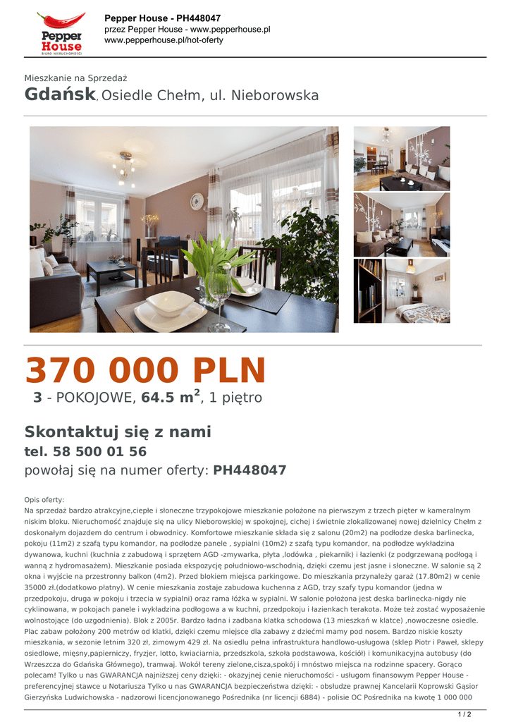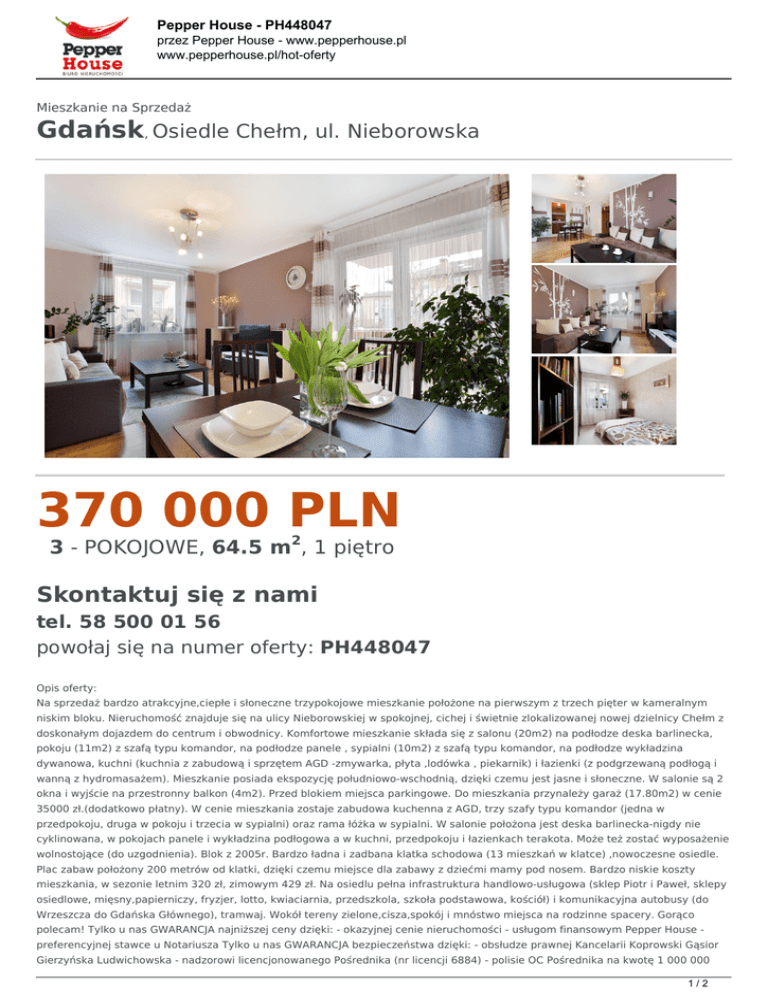 Pepper House - PH448047 przez Pepper House - www.pepperhouse.pl www.pepperhouse.pl/hot-oferty Mieszkanie na Sprzedaż Gdańsk, Osiedle Chełm, ul. Nieborowska 370 000 PLN 3 - POKOJOWE, 64.5 m2, 1 piętro Skontaktuj się z nami tel. 58 500 01 56 powołaj się na numer oferty: PH448047 Opis oferty: Na sprzedaż bardzo atrakcyjne,ciepłe i słoneczne trzypokojowe mieszkanie położone na pierwszym z trzech pięter w kameralnym niskim bloku. Nieruchomość znajduje się na ulicy Nieborowskiej w spokojnej, cichej i świetnie zlokalizowanej nowej dzielnicy Chełm z doskonałym dojazdem do centrum i obwodnicy. Komfortowe mieszkanie składa się z salonu (20m2) na podłodze deska barlinecka, pokoju (11m2) z szafą typu komandor, na podłodze panele , sypialni (10m2) z szafą typu komandor, na podłodze wykładzina dywanowa, kuchni (kuchnia z zabudową i sprzętem AGD -zmywarka, płyta ,lodówka , piekarnik) i łazienki (z podgrzewaną podłogą i wanną z hydromasażem). Mieszkanie posiada ekspozycję południowo-wschodnią, dzięki czemu jest jasne i słoneczne. W salonie są 2 okna i wyjście na przestronny balkon (4m2). Przed blokiem miejsca parkingowe. Do mieszkania przynależy garaż (17.80m2) w cenie 35000 zł.(dodatkowo płatny). W cenie mieszkania zostaje zabudowa kuchenna z AGD, trzy szafy typu komandor (jedna w przedpokoju, druga w pokoju i trzecia w sypialni) oraz rama łóżka w sypialni. W salonie położona jest deska barlinecka-nigdy nie cyklinowana, w pokojach panele i wykładzina podłogowa a w kuchni, przedpokoju i łazienkach terakota. Może też zostać wyposażenie wolnostojące (do uzgodnienia). Blok z 2005r. Bardzo ładna i zadbana klatka schodowa (13 mieszkań w klatce) ,nowoczesne osiedle. Plac zabaw położony 200 metrów od klatki, dzięki czemu miejsce dla zabawy z dziećmi mamy pod nosem. Bardzo niskie koszty mieszkania, w sezonie letnim 320 zł, zimowym 429 zł. Na osiedlu pełna infrastruktura handlowo-usługowa (sklep Piotr i Paweł, sklepy osiedlowe, mięsny,papierniczy, fryzjer, lotto, kwiaciarnia, przedszkola, szkoła podstawowa, kościół) i komunikacyjna autobusy (do Wrzeszcza do Gdańska Głównego), tramwaj. Wokół tereny zielone,cisza,spokój i mnóstwo miejsca na rodzinne spacery. Gorąco polecam! Tylko u nas GWARANCJA najniższej ceny dzięki: - okazyjnej cenie nieruchomości - usługom finansowym Pepper House preferencyjnej stawce u Notariusza Tylko u nas GWARANCJA bezpieczeństwa dzięki: - obsłudze prawnej Kancelarii Koprowski Gąsior Gierzyńska Ludwichowska - nadzorowi licencjonowanego Pośrednika (nr licencji 6884) - polisie OC Pośrednika na kwotę 1 000 000 1/2 Pepper House - PH448047 przez Pepper House - www.pepperhouse.pl www.pepperhouse.pl/hot-oferty PLN w PZU SA - ubezpieczeniu kupowanej nieruchomości (szczegóły na naszej stronie). Więcej zdjęć, zdjęcia w dużym formacie, rzuty, filmy i dodatkowe informacje: www.pepperhouse.pl Wejdź już dziś i wyślij zapytanie bezpośrednio do opiekuna oferty. 2/2 Powered by TCPDF (www.tcpdf.org)