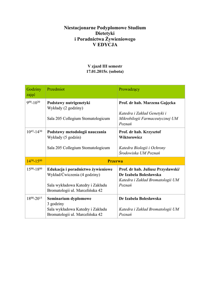 Niestacjonarne Podyplomowe Studium Dietetyki i Poradnictwa Żywieniowego V EDYCJA V zjazd III semestr 17.01.2015r. (sobota) Godziny zajęć Przedmiot Prowadzący 900-1030 Podstawy nutrigenetyki Wykłady (2 godziny) Prof. dr hab. Marzena Gajęcka 1045-1430 Sala 205 Collegium Stomatologicum Katedra i Zakład Genetyki i Mikrobilogii Farmaceutycznej UM Poznań Podstawy metodologii nauczania Wykłady (5 godzin) Prof. dr hab. Krzysztof Wiktorowicz Sala 205 Collegium Stomatologicum Katedra Biologii i Ochrony Środowiska UM Poznań 1430-1500 1500-1800 Przerwa Edukacja i poradnictwo żywieniowe Wykład/Ćwiczenia (4 godziny) Sala wykładowa Katedry i Zakładu Bromatologii ul. Marcelińska 42 1800-2015 Seminarium dyplomowe 3 godziny Sala wykładowa Katedry i Zakładu Bromatologii ul. Marcelińska 42 Prof. dr hab. Juliusz Przysławski/ Dr Izabela Bolesławska Katedra i Zakład Bromatologii UM Poznań Dr Izabela Bolesławska Katedra i Zakład Bromatologii UM Poznań V zjazd III semestr 18.01.2015r. (niedziela) Godziny zajęć Przedmiot Prowadzący 900-1115 Technologia potraw dietetycznych – ćwiczenia grupa IV Sala ćwiczeniowa Katedry i Zakładu Bromatologii ul. Marcelińska 42 Dr n. farm. Izabela Bolesławska 1115-1145 1145-1315 1315-1445 1445-1615 1615-1830 Katedra i Zakład Bromatologii UM Poznań Przerwa Edukacja i poradnictwo żywieniowe Wykład (2 godziny) Dr n. farm. Izabela Bolesławska Sala 205 Collegium Stomatologicum Katedra i Zakład Bromatologii UM Poznań Edukacja i poradnictwo żywieniowe Wykład/Ćwiczenia (2 godziny) Prof. dr hab. Juliusz Przysławski/ Dr Izabela Bolesławska Sala 205 Collegium Stomatologicum Katedra i Zakład Bromatologii UM Poznań Edukacja i poradnictwo żywieniowe Wykład (2 godziny) Prof. dr hab. Juliusz Przysławski Sala 205 Collegium Stomatologicum Katedra i Zakład Bromatologii UM Poznań Żywienie w sporcie Dr Krzysztof Durkalec - Michalski Wykład (3 godziny) Sala 205 Collegium Stomatologicum Katedra Higieny Żywienia Człowieka Uniwersytet Przyrodniczy Poznań