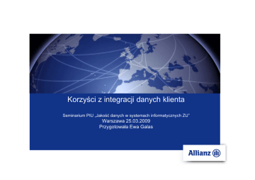Korzyści z integracji danych klienta Seminarium PIU „Jakość danych w systemach informatycznych ZU” Warszawa 25.03.2009 Przygotowała Ewa Galas Definicje CDI ( Customer Data Integration) koncepcja integracji danych o kliencie i prezentacji jednolitego obrazu klienta, zintegrowanego z danych istniejących w wielu systemach Centralna Baza Klientów system informatyczny realizujący koncepcję CDI DQM ( Data Quality Management) –zarządzanie danymi w taki sposób, który prowadzi do pozyskiwania wysokiej jakości danych; zapewnienie ich aktualności, kompletności,spójności,dostępności DS ( Data Strategy) - działanie lub proces zapewniajacy,że korporacyjne dane sa zarządzane jako aktywo organizacji. Cel i zakres projektu Cel i zakres Projektu CBK Cel projektu: • Stworzenie fundamentu Strategii Klientocentryczności w Grupie Allianz. Projekt CBK koncentruje się na danych klienta w krótkiej perspektywie, natomiast długookresowo ma objąć wszystkie dane w Grupie Allianz. Streamy projektowe: • 1. Centralna Baza Klientów • 2. Data Quality Management (DQM) • 3. Data Strategy (DS) Cel i zakres projektu Zakres Centralnej Bazy Klienta Stworzenie jednolitego widoku klienta Grupy Allianz Polska. • Widok 360° - pełna wiedza o kliencie i jego wszystkich produktach. Zakres prac: • Wdrożenie CBK ma na celu konsolidację danych klienta – stworzenie Golden Record w centralnej bazie. • Integracja CBK z systemami dziedzinowymi pozwoli wykorzystać zintegrowany widok klienta do celów obsługowych, marketingowych, analitycznych. Rola Centralnej Bazy Klientów Centralna Baza Klientów docelowo będzie masterem kluczowych danych o kliencie, będzie systemem nadrzędnym w stosunku do wszystkich systemów przechowujących dane o kliencie •utrzymuje najlepszy obraz klienta • ustandaryzowany, wzbogacony, czysty (kompletny) • zdeduplikowany • integruje się z systemami dziedzinowymi Allianz • udostępnia dane o kliencie • propaguje zmiany o kliencie • systemy dziedzinowe komunikują się z Centralną Bazą Klientów w celu modyfikacji danych • dostępna jest w trybie on-line i wsadowym Cel i zakres projektu Zakres DQM Cel: • Zapewnienie pozyskiwania wysokiej jakości danych, gromadzonych i przetwarzanych w organizacji, poprzez wdrożenie Data Quality Management. Dane dobrej jakości są fundamentem wielu procesów realizowanych w ramach Grupy Allianz. • Jakość danych definiujemy w kategoriach kompletności, poprawności, spójności, aktualności. Zakres prac: Ustalenie reguł i mierników jakości danych Wdrożenie monitorowania jakości danych Analiza danych Realizacja działań naprawczych Wdrożenie procesów DQM Procesy DQM Proces monitorowania jakości danych Proces zarządzania incydentem Proces zarządzania zmianą Cel i zakres projektu Zakres Data Strategy Cel: • Opracowanie korporacyjnej strategii danych określającej jak postępować z danymi w Grupie Allianz. Realizacja tego celu wynika z faktu, iż DANE są tak ważnym aktywem organizacji i na nich m. in. buduje się wartość Grupy Allianz. Zakres prac: • • Przegląd podstawowych elementów wchodzących w skład Data Strategy i poziom ich realizacji w Allianz W pierwszej iteracji ograniczenie się jedynie do obszaru danych klienta w zakresie niezbędnym do realizacji wdrożenia obszaru CBK • Wskazanie właścicieli obszarów wchodzących w skład Data Strategy • Zdefiniowanie wizji i misji docelowego modelu zarządzania danymi w Allianz • Stworzenie Roadmap przyszłych działań Za rzą Da dza ny nie mi Sp ec Da yfika ny cja ch Do Be stęp c z zp i i e e Da ństw ny o ch Ja Da kość ny ch Dane klienta w systemach – stan obecny Systemy Allianz System1 C System2 System Kolejkowy MM/CM BI System3 A System4 INNE Hurtownia Danych Systemy Allianz DQ Etapy dojrzałości CBK – wdrożenie CBK Centralna Baza Klientów CRM operacyjny C System1 C System2 System Kolejkowy MM/CM BI System3 A System4 INNE Hurtownia Danych Etapy dojrzałości CBK – funkcjonalność docelowa Systemy Allianz CRM operacyjny System3 A Centralna Baza Klientów DQ Warstwa Integracyjna C System2 Warstwa Integracyjna System1 MM/CM BI System4 INNE Hurtownia Danych C INEGRACJA Centralna Baza Klientów Etapy rozwoju funkcjonalności Centralnej Bazy Klientów Etap 1 konsolidacja Etap 2 udostępnianie online Etap 3 udostępnianie i modyfikacja Integracja wsadowa Sukcesywne udostępnianie wiedzy o klientach systemom dziedzinowym Integracja dwukierunkowa on-line z systemami dziedzinowymi •udostępnianie on-line danych dla systemów dziedzinowych • udostępnienie operacji modyfikacji danych w CBK • pozyskiwanie danych z systemów dziedzinowych • konsolidacja danych – stworzenie Golden Record • transfer danych na potrzeby COK, MM/CM, HD Warstwa integracyjna • Integracja CRM z systemami dziedzinowymi • udostępnienie operacji polisowych z systemów produktowych ESB Zmiany konieczne do pełnego wykorzystania Centralnej Bazy Klientów 1. Umiejętność korzystania z serwisów Centralnej Bazy Klientów przez systemy dziedzinowe 2. Dopasowanie systemów dziedzinowych do biznesowego modelu danych • różne wersje zgód klienta • adres korespondencyjny dla polisy 3. Zmiana profilu hurtowni danych z modelu produktowego na model kliencki 4. Dostosowanie systemu wydruku dokumentów do korzystania z golden rekord 5. Uzgodnienie wartości słownikowych pomiędzy systemami 6. Ujednolicenie modelu danych i walidacji w systemach dziedzinowych Korzyści posiadania Centralnej Bazy Klientów dla COK 1. Pracownicy COK widzą jeden obraz klienta, tzw golden record, (najlepszy obraz klienta po standaryzacji, deduplikacji z podpiętymi wszystkimi jego ubezpieczeniami) 2. Pracownicy COK maja możliwość zbiorczego zlecania zmian danych klienta (dokonują jednokrotnej operacji na danych klienta w CRM, bez koniczności powielania tej samej operacji w wielu systemach źródłowych) 3. Pracownicy COK – widzą transakcje i kont