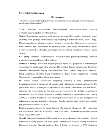 Mgr Wioletta Skowron Streszczenie „Wybrane wyznaczniki funkcjonowania psychospołecznego chorych z wrzodziejącym zapaleniem jelita grubego.” Tytuł. Wybrane wyznaczniki funkcjonowania psychospołecznego chorych z wrzodziejącym zapaleniem jelita grubego. Wstęp. Wrzodziejące zapalenie jelita grubego to przewlekłe, zapalne schorzenie błony śluzowej jelita grubego manifestujące się biegunką z domieszką krwi, śluzu i ropy. Choroba przebiega z okresami rzutów i remisji. Leczenie jest długotrwałym procesem, które powinno być skierowane na poprawę stanu klinicznego, minimalizację lęków i obaw związanych z chorobą, akceptację choroby, lepszą satysfakcję i jakość życia chorego. Cel pracy. Poznanie wyznaczników funkcjonowania psychospołecznego chorych z wrzodziejącym zapaleniem jelita grubego. Materiał i metody. Badaniem prospektywnym objęto 102 pacjentów z rozpoznanym wrzodziejącym zapaleniem jelita grubego. Do zebrania danych zastosowano: Kliniczny Wskaźnik Aktywności Choroby, Kwestionariusz Obaw i Lęków związanych z chorobą, Skalę Akceptacji Choroby, Skalę Satysfakcji z Życia, Skalę Uogólnionej Własnej Skuteczności i autorski kwestionariusz ankiety. Do analizy danych zastosowano statystykę opisową i testy parametryczne i nieparametryczne w zależności od rodzaju skali i charakteru rozkładu zmiennych. Do porównania dwóch zmiennych o normalnych rozkładach zastosowano test t-Studenta, natomiast do porównania dwóch zmiennych wyrażonych na skalach nominalnych zastosowano test U Manna Whitney’a. Analizę wariancji przeprowadzona za pomocą ANOVA, a analizy korelacyjne dla zmiennych wyrażonych na skalach porządkowych dokonano za pomocą korelacji r-Pearsona. Wyniki przyjęto jako istotne statystycznie przy poziomie istotności p < 0,05. Badania przeprowadzono za zgodą Komisji Bioetycznej Okręgowej Izby Lekarskiej w Częstochowie (Nr K.B.Cz.-9/2012) z dnia 24.04.2012 r., z dodatkowym rozszerzeniem badań z dnia 29.01.2014 r. Wyniki. Większość badanych (64%) znajdowała się w aktywnej fazie choroby. Badani mężczyźni i osoby poniżej 50. roku życia prezentowali wyższą średnią aktywności klinicznej choroby. Wysoki poziom obaw i lęków występował u 73% badanych i dotyczył dziedzin: wpływu choroby, życia intymnego, powikłań i stygmatyzacji. Najwyższy poziom lęków i obaw obserwowano w dziedzinach powikłań i wpływu choroby na życie badanych. Badani prezentowali przeciętny poziom akceptacji choroby (28,7 pkt.) i obniżony poziom zarówno satysfakcji z życia (21,14 pkt.) jak i uogólnionego poczucia własnej skuteczności (30,48 pkt.). Analiza statystyczna wykazała, że czas trwania choroby (p=0,04) i płeć (p=0,001) wpływają na uogólnione poczucie własnej skuteczności, wiek na aktywność życiową (p=0,02), a wykształcenie na akceptację choroby (p=0,04). Analiza statystyczna nie wykazała wpływu miejsca zamieszkania na funkcjonowanie psychospołeczne badanych. Wnioski. Aktywność choroby oraz wysoki poziom obaw i lęków ma wpływ na jakość życia i funkcjonowanie psychospołeczne osób z wrzodziejącym zapaleniem jelita grubego. Badani w aktywnym stadium choroby charakteryzowali się wyższym poziomem obaw i lęków, niższym poziomem akceptacji choroby, satysfakcji z życia i przekonania o skutecznym radzeniu sobie z sytuacjami trudnymi i przeszkodami. Poczucie własnej skuteczności zależało od czasu trwania choroby, stanu cywilnego i płci badanych. Słowa kluczowe: wrzodziejące zapalenie jelita grubego, akceptacja, satysfakcja, uogólnione poczucie własnej skuteczności, lęki i obawy.