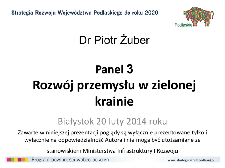 Dr Piotr Żuber Panel 3 Rozwój przemysłu w zielonej krainie Białystok 20 luty 2014 roku Zawarte w niniejszej prezentacji poglądy są wyłącznie prezentowane tylko i wyłącznie na odpowiedzialność Autora i nie mogą być utożsamiane ze stanowiskiem Ministerstwa Infrastruktury I Rozwoju 1 Struktura prezentacji 1. 2. 3. 4. 5. 6. Uwagi wstępne Zielone Podlaskie. Co to jest? Zapisy strategii województwa podlaskiego do roku 2020 odnoszące się do koncepcji ZP Zielone Podlaskie. Wnioski z analizy zapisów strategii Zielone Podlaskie. Warunki wdrożenia koncepcji Pytania do dyskusji 2 Uwagi wstępne • • Wg Wikipedii przemysł to dział produkcji materialnej, w którym wydobywanie zasobów przyrody i dostosowanie ich do potrzeb ludzi odbywa się na dużą skalę, na zasadzie podziału pracy i za pomocą maszyn. Zielona kraina to z jeden z najważniejszych składowych wizji województwa podlaskiego wykorzystującego do rozwoju zespół takich czynników rozwojowych jak: najwięcej w Polsce terenów objętych ochroną w formie Parków Narodowych, wysoki udział lasów, najniższa gęstość zaludnienia. 3 Uwagi wstępne • W kontekście celów polityki rozwoju oznacza to koncentrację uwagi na rozwijaniu zielonych (ekologicznych) specjalizacji oraz zazielenianie polityk, rozwój zielonych innowacji oraz kształtowania bardziej zielonych usług. • W tym kontekście dyskutując przyszłe możliwości rozwojowe województwa podlaskiego o przemyśle należy mówić o Zielonym Podlasiu w szerszym rozumieniu – różnych działań gospodarczych związanych z wykorzystaniem potencjału zielonej krainy. 4 Zielone Podlaskie. Co to jest? Czytając Strategię Województwa Podlaskiego można mieć wątpliwości czym Zielone Podlaskie jest: • Sloganem reklamowym? Należy sprawdzić czy za Zielonym Podlaskim kryje się coś więcej niż uzasadnienie wydatków w dziedzinie infrastruktury • Horyzontalną zasadą? Należy sprawdzić czy jest ona konsekwentnie stosowana. • Celem interwencji publicznej? Należy sprawdzić jakie rezultaty są zakładane do osiągnięcia (wskaźniki)? 5 Zielone Podlaskie. Zapisy strategii rozwoju województwa podlaskiego do roku 2020 Wizja: Wykorzystanie wrażliwości Unii Europejskiej na kwestie środowiskowo-klimatyczne. Rozwój oparty o: rozwój zielonych przemysłów, umiejętność zazieleniania polityk, zielone innowacje, kształtowanie bardziej zielonych usług. 6 Zielone Podlaskie. Zapisy strategii rozwoju województwa podlaskiego do roku 2020 Składowe wizji. Eko-innowacje: • • • • • Technologie przyjazne środowisku, w tym ICT, Dostosowanie do standardów ekologicznych, OZE w modelu rozproszonym Produkcja urządzeń do wytwarzania energii z OZE, Budownictwo ekologiczne, energooszczędne, Ekorozwój: • • • • • Badania nad bioróżnorodnością Ekologiczne zarządzanie środowiskiem, Inżynieria ekologiczna, Zielone miejsca pracy Eko-turystyka, w tym agroturystyka, 7 Zielone Podlaskie. Zapisy strategii rozwoju województwa podlaskiego do roku 2020 Składowe wizji Żywność wysokiej jakości: • • • • • Produkcja mleka Przemysł spożywczy, w tym przetwórstwo ekologiczne, Produkcja maszyn rolniczych, Produkty tradycyjne, Rolnictwo ekologiczne. Srebrna gospodarka: • • • • Opieka nad osobami starszymi, Implanty medyczne, Rehabilitacja, fizykoterapia, Turystyka medyczna 8 Zielone Podlaskie. Zapisy strategii rozwoju województwa podlaskiego do roku 2020 Diagnoza: • Wysoki potencjał województwa do prowadzenia rozwoju opartego na zielonych wartościach (tereny chronione, niska emisja zanieczyszczeń, dobry stan środowiska, wielokulturowość, szlaki turystyczne, potencjał do zaspakajanie potrzeb ludzi starszych , w tym Uniwersytet Medyczny ) • Nie mniej jednak zidentyfikowane braki obejmują: • wyposażenie infrastrukturalne (dostęp do kanalizacji, oczyszczenie ścieków, zagospodarowanie odpadów, • niezbyt wysoką świadomość ekologiczną (na poziomie edukacji różnych stopni oraz różnych grup zawodowych w tym pracowników administracji publicznej, • Niewystarczający rozwój bazy turystycznej, 9 Zielone Podlaskie. Zapisy strategii rozwoju województwa podlaskiego do roku 2020 Diagnoza: • Jakość środowiska przyrodniczego podstawą wysokiej konkurencyjności branży rolno-spożywczej (duże pogłowie bydła, mleko krowie, przetwórstwo mleka)– dogodne warunki do rozwoju rolnictwa ekologicznego • Potencjał rozwoju odnawialnych źródeł energii (biogaz, energetyka wiatrowa, wykorzystania energii słonecznej) • Wysoka pozycja Białegostoku jako miejsca do życia (czyste środowisko i wysoki poziom bezpieczeństwa, dostęp do usług medycznych i rekreacja), 10 Zielone Podlaskie. Zapisy strategii województwa podlaskiego do roku 2020 Diagnoza: • Specjalizacja w zakresie przemysłu wyłącznie związana z rolnictwem, leśnictwem, łowiectwem i rybołówstwem • Duży odsetek zatrudnionych w rolnictwie – 3 miejsc w kraju, co ze względu na niską dochodowość wiąże się niską przeciętnie zamożnością społeczeństwa na tle kraju • Niedostosowanie kwalifikacji do potencjalnego zielonego skoku pomimo istnienia placówek naukowych i instytucji badawczych • Negatywne trendy demograficzne – drenaż mózgów 11 Zielone Podlaskie. Zapisy strategii rozwoju województwa podlaskiego do roku 2020 12 Zielone Podlaskie. Zapisy strategii rozwoju województwa podlaskiego do roku 2020 Cel operacyjne związane z realizacją koncepcji: 1.2.Wzrost innowacyjności Podlaskich przedsiębiorstw ale… brak odniesień do specjalizacji regionalnej 1.3 Rozwój kompetencji do pracy i wsparcie aktywności zawodowej mieszkańców regionu ale….. brak odniesień do potrzeb w zakresie edukacji i kształcenia kadr w zakresie Zielonego Podlaskiego 13 Zielone Podlaskie. Zapisy strategii rozwoju województwa podlaskiego do roku 2020 Cele operacyjne związane z realizacją koncepcji: Cel 1.5 Efektywne korzystan