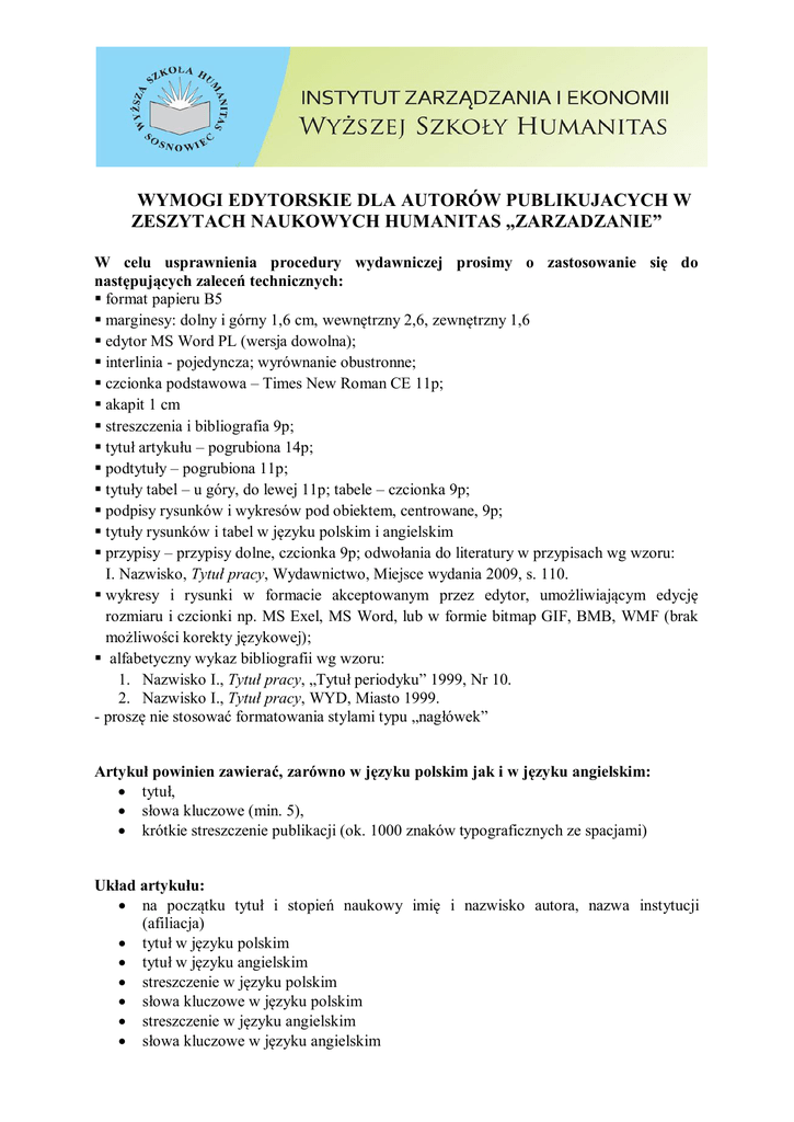 WYMOGI EDYTORSKIE DLA AUTORÓW PUBLIKUJACYCH W ZESZYTACH NAUKOWYCH HUMANITAS „ZARZADZANIE” W celu usprawnienia procedury wydawniczej prosimy o zastosowanie się do następujących zaleceń technicznych: format papieru B5 marginesy: dolny i górny 1,6 cm, wewnętrzny 2,6, zewnętrzny 1,6 edytor MS Word PL (wersja dowolna); interlinia - pojedyncza; wyrównanie obustronne; czcionka podstawowa – Times New Roman CE 11p; akapit 1 cm streszczenia i bibliografia 9p; tytuł artykułu – pogrubiona 14p; podtytuły – pogrubiona 11p; tytuły tabel – u góry, do lewej 11p; tabele – czcionka 9p; podpisy rysunków i wykresów pod obiektem, centrowane, 9p; tytuły rysunków i tabel w języku polskim i angielskim przypisy – przypisy dolne, czcionka 9p; odwołania do literatury w przypisach wg wzoru: I. Nazwisko, Tytuł pracy, Wydawnictwo, Miejsce wydania 2009, s. 110. wykresy i rysunki w formacie akceptowanym przez edytor, umożliwiającym edycję rozmiaru i czcionki np. MS Exel, MS Word, lub w formie bitmap GIF, BMB, WMF (brak możliwości korekty językowej); alfabetyczny wykaz bibliografii wg wzoru: 1. Nazwisko I., Tytuł pracy, „Tytuł periodyku” 1999, Nr 10. 2. Nazwisko I., Tytuł pracy, WYD, Miasto 1999. - proszę nie stosować formatowania stylami typu „nagłówek” Artykuł powinien zawierać, zarówno w języku polskim jak i w języku angielskim: tytuł, słowa kluczowe (min. 5), krótkie streszczenie publikacji (ok. 1000 znaków typograficznych ze spacjami) Układ artykułu: na początku tytuł i stopień naukowy imię i nazwisko autora, nazwa instytucji (afiliacja) tytuł w języku polskim tytuł w języku angielskim streszczenie w języku polskim słowa kluczowe w języku polskim streszczenie w języku angielskim słowa kluczowe w języku angielskim wstęp rozdziały podsumowanie bibliografia sporządzona alfabetycznie (kolejność według nazwisk autorów). nota biograficzna o Autorze w języku polskim nota biograficzna o Autorze w języku angielskim dane kontaktowe do Autora (do opublikowania) Wymagane jest przygotowanie artykułu w objętości ok. ½ arkusza wydawniczego (20.000 znaków ze spacjami). Artykuł, po uzyskaniu 2 pozytywnych recenzji, zostanie opublikowany w Zeszytach Naukowych Wyższej Szkoły HUMANITAS Zarządzanie. Artykuł należy przesłać drogą elektroniczną na e-mail: [email protected] lub na adres: Redakcja Zeszytów Naukowych WSH Zarządzanie Wyższa Szkoła Humanitas Ul. Kilińskiego 43 41-200 Sosnowiec Opłata za publikację (w kwocie 150zł) powinna zostać uiszczona na poniższe konto: Wyższa Szkoła Humanitas ul. Kilińskiego 43 41-200 Sosnowiec numer konta: 24 1050 1360 1000 0008 0337 9932 tytuł przelewu: ZN WSH Zarządzanie – Imię i nazwisko Autora Wszelkich dodatkowych informacji udziela: Dr Małgorzata Smolarek Tel. 600-338-176 [email protected]