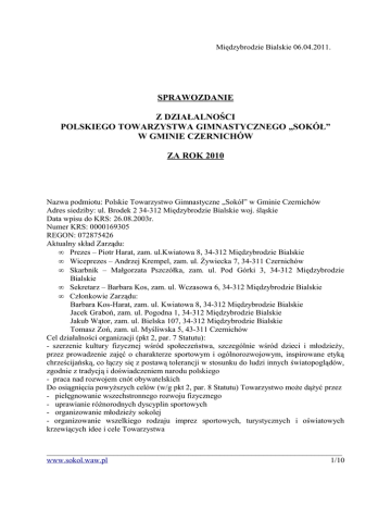 Międzybrodzie Bialskie 06.04.2011. SPRAWOZDANIE Z DZIAŁALNOŚCI POLSKIEGO TOWARZYSTWA GIMNASTYCZNEGO „SOKÓŁ” W GMINIE CZERNICHÓW ZA ROK 2010 Nazwa podmiotu: Polskie Towarzystwo Gimnastyczne „Sokół” w Gminie Czernichów Adres siedziby: ul. Brodek 2 34-312 Międzybrodzie Bialskie woj. śląskie Data wpisu do KRS: 26.08.2003r. Numer KRS: 0000169305 REGON: 072875426 Aktualny skład Zarządu: • Prezes – Piotr Harat, zam. ul.Kwiatowa 8, 34-312 Międzybrodzie Bialskie • Wiceprezes – Andrzej Krempel, zam. ul. Żywiecka 7, 34-311 Czernichów • Skarbnik – Małgorzata Pszczółka, zam. ul. Pod Górki 3, 34-312 Międzybrodzie Bialskie • Sekretarz – Barbara Kos, zam. ul. Wczasowa 6, 34-312 Międzybrodzie Bialskie • Członkowie Zarządu: Barbara Kos-Harat, zam. ul. Kwiatowa 8, 34-312 Międzybrodzie Bialskie Jacek Graboń, zam. ul. Pogodna 1, 34-312 Międzybrodzie Bialskie Jakub Wątor, zam. ul. Bielska 107, 34-312 Międzybrodzie Bialskie Tomasz Zoń, zam. ul. Myśliwska 5, 43-311 Czernichów Cel działalności organizacji (pkt 2, par. 7 Statutu): - szerzenie kultury fizycznej wśród społeczeństwa, szczególnie wśród dzieci i młodzieży, przez prowadzenie zajęć o charakterze sportowym i ogólnorozwojowym, inspirowane etyką chrześcijańską, co łączy się z postawą tolerancji w stosunku do ludzi innych światopoglądów, zgodnie z tradycją i doświadczeniem narodu polskiego - praca nad rozwojem cnót obywatelskich Do osiągnięcia powyższych celów (w/g pkt 2, par. 8 Statutu) Towarzystwo może dążyć przez - pielęgnowanie wszechstronnego rozwoju fizycznego - uprawianie różnorodnych dyscyplin sportowych - organizowanie młodzieży sokolej - organizowanie wszelkiego rodzaju imprez sportowych, turystycznych i oświatowych krzewiących idee i cele Towarzystwa ___________________________________________________________________________ www.sokol.waw.pl 1/10 - organizowani zespołów, amatorskich kółek teatralnych, recytatorskich i podobnych - rozbudzanie w swych członkach poczucia narodowej i osobistej godności oraz chętnego i bezinteresownego wypełniania obowiązków społecznych i obywatelskich. Towarzystwo podejmuje wszelkie nie sprzeciwiające się prawu działania i prace, skierowane na rozpowszechnianie jego idei i wprowadzenie w życie jego zadań. Polskie towarzystwo Gimnastyczne ‘Sokół” w Gminie Czernichów z siedzibą w Międzybrodziu Bialskim działalność statutową rozpoczęło w kwietniu 2003 roku, a w roku następnym uzyskało status organizacji pożytku publicznego. W roku obrotowym 2010 PTG „Sokół” osiągnęło przychody w kwocie 62 791,82 zł, z tego z tytułu składek członkowskich, loterii fantowych i innych w kwocie 17 255,60 zł, pozostałe przychody przeznaczone na działalność statutową wyniosły 45 536,22 zł, z czego dotacje z Ministerstwa Sportu i Turystyki – 17 345,00 zł, z Urzędu Gminy Czernichów – 17345,00 zł. Zgromadzone środki przeznaczono na zorganizowanie imprez sportowoplenerowych: Majówka z Sokołem (zadanie nie zrealizowane z powodu niesprzyjającej pogody – dotacja zwrócona do Urzędu Gminy) i Pożegnanie Lata z „Sokołem”. Zorganizowano również Wakacje z Sokołem – dodatkowe letnie zajęcia sportowe i artystyczne dla dzieci i młodzieży, Regaty Żar, obóz biwakowy pod Grunwaldem i Dzień Sokoła. Ponadto cały rok działały wszystkie sekcje PTG „Sokół”, prowadząc zajęcia dla swoich członków. Koszty realizacji zadań statutowych wyniosły ogółem 70 320,19 zł, z czego na koszty administracyjne przypadło: - zużycie materiałów biurowych – 1 570,71 zł - zużycie materiałów i energii – 3 184,02 zł - usługi obce – 8 999,29 zł - podatki i opłaty – 764,75 zł PTG „Sokół’ w roku obrotowym nie udzieliło żadnych gwarancji i poręczeń związanych z działalnością statutową. Źródłem zwiększenia funduszu statutowego były przede wszystkim składki członkowskie, darowizny od darczyńców na rzecz OPP, a także dotacje z Urzędu Gminy Czernichów oraz Ministerstwa Sportu i Turystyki. PTG „Sokół” nie posiada żadnych składników majątku, a uzyskane przychody w ponad 95% wykorzystane są na działalność statutową. W roku obrotowym 2010 nie wystąpiła konieczność wyceny aktywów i pasywów w rozumieniu ustawy o rachunkowości, a także zmian w stosunku do roku poprzedniego. W aktywach występują dwie pozycje: środki pieniężne w kasie i na rachunku bankowym oraz należności krótkoterminowe. W pasywach: fundusz statutowy i nadwyżka kosztów nad przychodami. Walne Zgromadzenie podjęło uchwałę o pokryciu nadwyżki kosztów nad przychodami z przychodów roku następnego i funduszu statutowego. Działalność Polskiego Towarzystwa Gimnastycznego „Sokół” w Gminie Czernichów w roku 2010 skupiała się na realizacji zadań statutowych, a więc przede wszystkim prowadzeniu zajęć z dziećmi i młodzieżą w poszczególnych sekcjach ___________________________________________________________________________ www.sokol.waw.pl 2/10 stowarzyszenia. Podejmowano również działania, które w sposób pośredni prowadziły do realizacji celów statutowych; organizowano zawody sportowe, zajęcia wakacyjne i imprezy plenerowe przeznaczone dla szerokiego grona odbiorców, latem swoją działalność wznowiło pole namiotowe „Sokoła” położone nad Jeziorem Międzybrodzkim. W ciągu całego roku w „Sokole” działały sekcje sportowe: narciarska, żeglarska, lekkoatletyczna (psich zaprzęgów) i turystyczna, a w miesiącu września powołano do życia sekcję piłki nożnej. Dużą aktywnością wykazały się również sekcja artystyczna oraz działający pod patronatem „Sokoła” Klub Honorowych Krwiodawców. SEKCJA NARCIARSKA Sekcja narciarska w czasie siedmioletniej działalności rozrosła się do 60 członków-uczestników. Zainteresowanie zajęciami w roku 2010 było tak duże, że niezbędne okazało się ogranicze