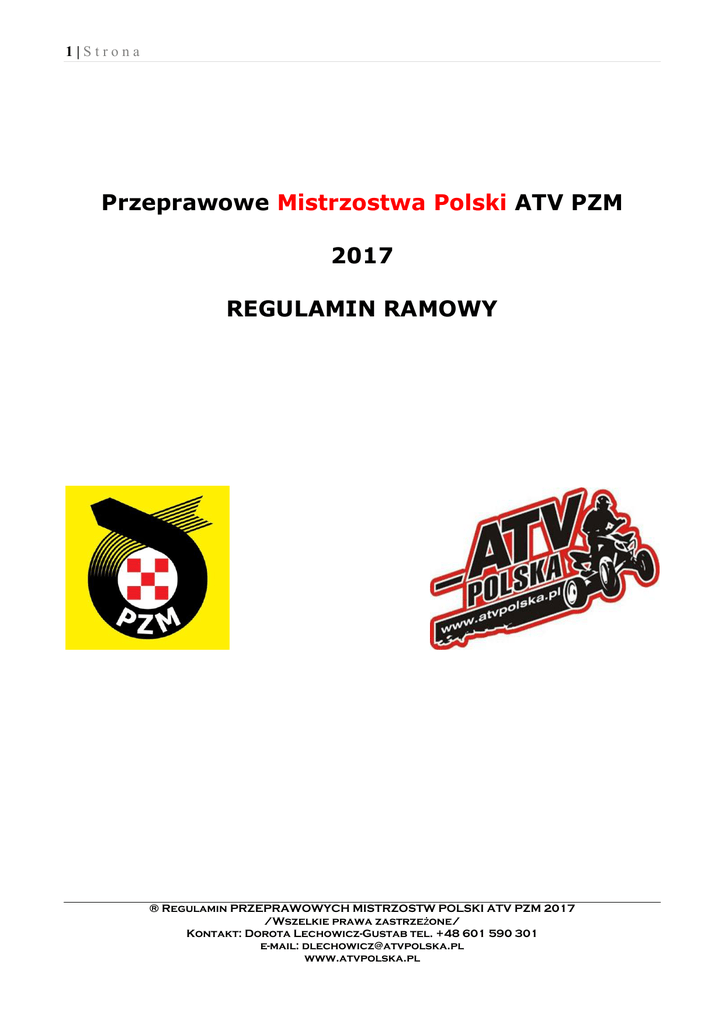 1|Strona Przeprawowe Mistrzostwa Polski ATV PZM 2017 REGULAMIN RAMOWY ® Regulamin PRZEPRAWOWYCH MISTRZOSTW POLSKI ATV PZM 2017 /Wszelkie prawa zastrzeżone/ Kontakt: Dorota Lechowicz-Gustab tel. +48 601 590 301 e-mail: [email protected] www.atvpolska.pl 2|Strona 1. Przeprawowe Mistrzostwa Polski ATV PZM 1.1 Właściciel i charakter Imprezy PRZEPRAWOWE MISTRZOSTWA POLSKI ATV PZM (zwane dalej PMP ATV PZM) jest to cykl imprez terenowo - nawigacyjnych dla użytkowników pojazdów ATV. Celem organizacji Przeprawowych Mistrzostw Polski ATV PZM jest podnoszenie poziomu nawigowania oraz doskonalenie umiejętności jazdy zespołowej w ekstremalnych warunkach terenowych. PMP ATV PZM ma na celu wyłonienie najlepszych zawodników w klasyfikacji sezonu i przyznanie tytułu Mistrza Polski. PMP ATV PZM jest własnością Polskiego Związku Motorowego (zwanego dalej PZM). PZM zastrzega sobie prawo interpretacji niniejszego Regulaminu i postanawia, że Główna Komisja Sportu Popularnego i Turystyki (GKSPiT) jest jedyną władzą upoważnioną do rozpatrywania i rozstrzygania wszelkich rozbieżności i wątpliwości, które mogą powstać przy stosowaniu i interpretacji niniejszego Regulaminu i innych odnośnych przepisów. 1.2 Organizatorzy Organizatorem, wskazanym decyzją GKSPiT PZM, do realizacji PMP ATV PZM jest Polskie Stowarzyszenie Czterokołowców ATV Polska zwane dalej ATV Polska. ATV Polska posiada wyłączne prawo oprócz PZM do dysponowania nazwą PPP ATV PZM. 1.3. Obowiązki Organizatora - wytyczenie i oznaczenie tras imprezy o stopniu trudności adekwatnym do poziomu uczestników, - oznakowanie odcinków prób sędziowanych i wyznaczenie miejsc umieszczenia Elektronicznych Punktów Kontrolnych (EPK) potwierdzających dotarcie do punktu i oznakowanie miejsc ich umieszczenia w nawigacji uczestników, - uzyskanie wszystkich koniecznych zezwoleń od właścicieli terenu oraz innych instytucji, których zgoda podczas organizacji imprezy jest wymagana prawem, w szczególności zarządców gruntów, - zapewnienie obsługi administracyjnej i sędziowskiej z odpowiednimi uprawnieniami, - wyznaczenie zamkniętego parku maszyn, - przygotowanie wszelkiej dokumentacji, koniecznej do sprawnego i rzetelnego przeprowadzenia imprezy, - realizacja wytycznych ZOŚ ZG PZM odnośnie ochrony środowiska podczas imprez motorowych. 1.4. Osoby oficjalne - Dyrektor Imprezy - Sędzia Główny - Kierownik Tras - Zespół Sędziów Wykaz osób funkcyjnych zostanie każdorazowo podany w Regulaminie Uzupełniającym w terminie 30 dni przed imprezą 2. Uczestnicy Mistrzostw Polski 2.1. Do udziału w rundach PMP ATV PZM, jako kierujący pojazdem atv będzie dopuszczona osoba posiadająca uprawnienia stosowne do kategorii rejestracji pojazdu: - pojazd Samochodowy Czterokołowiec lekki (L6e) – prawo jazdy AM lub karta motorowerowa - pojazd Samochodowy Czterokołowiec inny (L7e) – prawo jazdy samochodowe B1, B - ciągnik rolniczy - prawo jazdy T lub B1, B - motocykl – prawo jazdy A Zgodnie z Uchwałą ZG PZM nr 1/2006 z dnia 08.04.2006 roku minimalny wiek dopuszczający do klasy 4K w sporcie motocyklowym w klasach atv/utv wynosi 16 lat. 2.2. Obowiązek startu w Przeprawowych Mistrzostwach Polski w roku 2017 ® Regulamin PRZEPRAWOWYCH MISTRZOSTW POLSKI ATV PZM 2017 /Wszelkie prawa zastrzeżone/ Kontakt: Dorota Lechowicz-Gustab tel. +48 601 590 301 e-mail: [email protected] www.atvpolska.pl 3|Strona Zawodnik spełniający poniższe warunki może wystartować wyłącznie w PMP 2017 (nie ma prawa klasyfikacji w PPP 2017) - każdy zawodnik klasyfikowany w PMP 2016 i 2015 - każdy zawodnik, który został sklasyfikowany na miejscach 1-5 w klasyfikacji generalnej PPP w 2016 roku, - każdy zawodnik PPP, który był klasyfikowany na miejscach 1 -3 w przynajmniej jednym rajdzie w 2016 roku (raz stawał na podium w sezonie 2016) Lista zawodników mających obowiązek zgłoszenia do udziału w PMP ATV PZM 2016 stanowi załącznik nr 2. 2.3. Prawo do udziału w Przeprawowych Mistrzostwach Polski ATV PZM w roku 2017 W roku 2017 prawo do udziału w Przeprawowych Mistrzostwach Polski ATV PZM będzie miał: - każdy zawodnik Przeprawowego Pucharu Polski ATV PZM z roku 2016, który w każdej z dwóch rund PPP 2016 uzyskał minimum 50% ilości punktów EPK zawodnika, który wygrał daną rundę. - każdy zawodnik klasyfikowany w PMP 2015, - każdy zawodnik, który został sklasyfikowany na miejscach 1-5 w klasyfikacji generalnej PPP w 2015 roku i nie startował w 2016 roku - każdy zawodnik PPP, który był klasyfikowany na miejscach 1 -3 w przynajmniej jednym rajdzie w 2015 roku (raz stawał na podium w sezonie 2015) i nie startował w 2016 roku Lista zawodników uprawnionych do udziału w PMP ATV PZM 2017 stanowi załącznik nr 3. 3.1. Zasady rywalizacji Rywalizacja w rajdzie PMP polega na poknywaniu trasy wedłu śladu wpisanego przez organizatora do urządzenia GPS zawodnika oraz odnajdywaniu punktów w terenie oznaczonych jako EPK. Podstawową zasadą rywalizacji i klasyfikowania zawodników w PMP jest zdobywanie w określonym przez organizatora limicie czasu jak największej ilości EPK poprzez zarejestrowanie ich odczytów w urządzeniach RSG zaplombowanych do każdego pojazdu. Odczyt jest możliwy po zbliżeniu pojazdu na odległość ok. 0,5 m do miejsca zamocowania EPK. Rajd PMP nie jest w żadnym wypadku formą rywalizacji na czas (wyścigu) i organizator nie dokonuje pomiaru prędkości średniej uczestników przebywających na trasie. Czas pokonywania trasy jest wyłącznie czynnikiem pomocniczym w przypadku kiedy sumaryczna ilość zaliczonych punktów EPK uczestników jest identyczna i wtedy krótszy czas decyduje o lepszym miejscu tylko pomiędzy nimi. W PMP ATV PZM dopuszcza się do startu dowolnej marki pojazd ATV (quad z napędem 4x4). Pojazd musi być obowiązkowo wyposażony w wyciągarkę przednią. Wyciągarka tylna może być zamontowana opcjonalnie i nie jest obowiązkowa. Start na trasę odbywa się w Teamach.