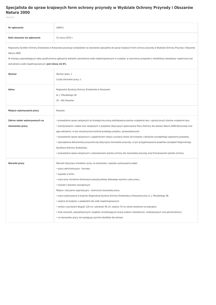 Specjalista do spraw krajowych form ochrony przyrody w Wydziale Ochrony Przyrody i Obszarów Natura 2000 2015-03-31 Nr ogłoszenia 168411 Data ukazania się ogłoszenia 31 marca 2015 r. Regionalny Dyrektor Ochrony Środowiska w Rzeszowie poszukuje kandydatów na stanowisko specjalista do spraw krajowych form ochrony przyrody w Wydziale Ochrony Przyrody i Obszarów Natura 2000. W miesiącu poprzedzającym datę upublicznienia ogłoszenia wskaźnik zatrudnienia osób niepełnosprawnych w urzędzie, w rozumieniu przepisów o rehabilitacji zawodowej i społecznej oraz zatrudnianiu osób niepełnosprawnych, jest niższy niż 6%. Wymiar Wymiar etatu: 1 Liczba stanowisk pracy: 1 Adres Regionalna Dyrekcja Ochrony Środowiska w Rzeszowie Al. J. Piłsudskiego 38 35 – 001 Rzeszów Miejsce wykonywania pracy Rzeszów Zakres zadań wykonywanych na • prowadzenie spraw związanych ze strategiczną oceną oddziaływania planów urządzenia lasu i uproszczonych planów urządzenia lasu; stanowisku pracy • koordynowanie i nadzór prac związanych z projektem dotyczącym opracowania Planu Ochrony dla obszaru Natura 2000 Bieszczady oraz jego wdrażanie, w tym merytoryczna kontrola przebiegu projektu, sprawozdawczość; • prowadzenie spraw związanych z uzgadnianiem nakazu usunięcia drzew lub krzewów z obszarów szczególnego zagrożenia powodzią; • sporządzanie dokumentacji przyrodniczej dotyczącej rezerwatów przyrody, w tym przygotowywanie projektów zarządzeń Regionalnego Dyrektora Ochrony Środowiska; • prowadzenie spraw związanych z ustanawianiem planów ochrony dla rezerwatów przyrody oraz finansowaniem planów ochrony. Warunki pracy Warunki dotyczące charakteru pracy na stanowisku i sposobu wykonywania zadań • praca administracyjno - biurowa, • wyjazdy w teren, • praca przy monitorze ekranowym powyżej połowy dobowego wymiaru czasu pracy, • kontakt z klientem zewnętrznym Miejsce i otoczenie organizacyjno – techniczne stanowiska pracy • praca wykonywana w budynku Regionalnej Dyrekcji Ochrony Środowiska w Rzeszowie przy al. J. Piłsudskiego 38, • wejście do budynku z podjazdem dla osób niepełnosprawnych, • winda o wymiarach długość 120 cm, szerokość 95 cm, wejście 70 cm (drzwi otwierane na zewnątrz), • brak oznaczeń, specjalistycznych urządzeń umożliwiających pracę osobom niewidomym, niedosłyszącym oraz głuchoniemym, • na stanowisku pracy nie występują czynniki szkodliwe dla zdrowia Wymagania związane ze stanowiskiem niezbędne: pracy wykształcenie wyższe w zakresie w zakresie ochrony środowiska lub leśnictwa lub biologii lub pokrewne doświadczenie zawodowe/staż pracy: minimum 1 rok doświadczenia zawodowego w zakresie ochrony środowiska lub ochrony przyrody lub leśnictwa pozostałe wymagania niezbędne: • znajomość ustawy o udostępnianiu informacji o środowisku i jego ochronie, udziale społeczeństwa w ochronie środowiska oraz o ocenach oddziaływania na środowisko; • znajomość ustawy o ochronie przyrody; • znajomość ustawy o lasach; • znajomość aktów wykonawczych do ww. ustaw; • znajomość Kodeksu postępowania administracyjnego; • znajomość ustawy o służbie cywilnej; • umiejętność argumentowania i negocjacji; • umiejętność obsługi komputera programów pakietu MS. Office. wymagania dodatkowe: • doświadczenie zawodowe w administracji publicznej; • umiejętność obsługi programu Quantum GIS • prawo jazdy kat. B Wymagane dokumenty i oświadczenia • życiorys i list motywacyjny • oświadczenie kandydata o wyrażeniu zgody na przetwarzanie danych osobowych do celów rekrutacji • oświadczenie kandydata o korzystaniu z pełni praw publicznych • oświadczenie kandydata o nieskazaniu prawomocnym wyrokiem za umyślne przestępstwo lub umyślne przestępstwo skarbowe • kopie dokumentów potwierdzających wykształcenie • kopia dokumentu potwierdzającego posiadanie polskiego obywatelstwa lub oświadczenie o posiadaniu obywatelstwa polskiego • kopie dokumentów potwierdzających doświadczenie zawodowe. Inne dokumenty i oświadczenia • kopia dokumentu potwierdzającego niepełnosprawność - w przypadku kandydatów, którzy zamierzają skorzystać z pierwszeństwa w zatrudnieniu, w przypadku, gdy znajdą się w gronie najlepszych kandydatów • kopie dokumentów potwierdzających spełnianie wymagań dodatkowych (doświadczenie) • kopia prawa jazdy potwierdzającego posiadanie uprawnienia do kierowania samochodem osobowym (kat. B) lub oświadczenie o posiadaniu takiego uprawnienia. Termin składania dokumentów 14 kwietnia 2015 r. Miejsce składania dokumentów Regionalna Dyrekcja Ochrony Środowiska w Rzeszowie Al. J. Piłsudskiego 38, 35-001 Rzeszów Inne informacje Oświadczenia prosimy składać zgodnie ze wzorem zamieszczonym na stronie internetowej: http://bip.rzeszow.rdos.gov.pl (Praca/Wzory oświadczeń). Oświadczenia powinny być podpisane własnoręcznie. Dokumenty należy przesyłać listownie lub składać osobiście w zamkniętej kopercie w sekretariacie RDOŚ w Rzeszowie. Oferty otrzymane po terminie nie będą rozpatrywane (decyduje data stempla pocztowego). Oferty kandydatów niewyłonionych możliwe są do odebrania w terminie 1 miesiąca od dnia opublikowania wyniku naboru. Oferty kandydatów wyłonionych a niezatrudnionych możliwe są do odebrania w terminie 3 miesięcy od objęcia stanowiska przez wybranego kandydata. Niewykorzystane oferty i nieodebrane w terminie zostaną zniszczone komisyjnie. Kandydaci spełniający wymagania formalne zostaną zakwalifikowani do dalszych etapów naboru, o czym będą poinformowani telefonicznie lub e – mailem. Nabór składa się z następujących etapów: selekcji ofert pod kątem spełniania wymagań formalnych, sprawdzianu wiedzy (wraz ze sprawdzeniem umiejętności obsługi komputera programów pakietu MS. Office), rozmowy kwalifikacyjnej. Do składania dokumentów zachęcamy osoby niepełnosprawne. Doda