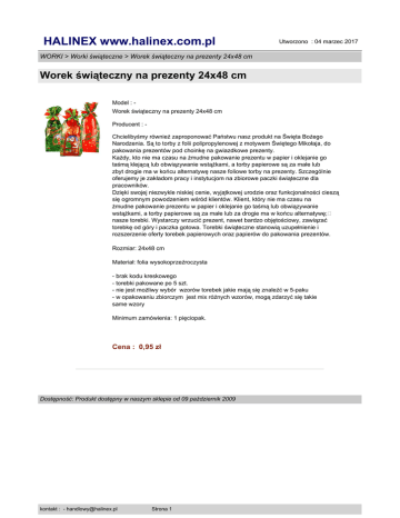 HALINEX www.halinex.com.pl Utworzono : 04 marzec 2017 WORKI > Worki świąteczne > Worek świąteczny na prezenty 24x48 cm Worek świąteczny na prezenty 24x48 cm Model : Worek świąteczny na prezenty 24x48 cm Producent : Chcielibyśmy również zaproponować Państwu nasz produkt na Święta Bożego Narodzenia. Są to torby z folii polipropylenowej z motywem Świętego Mikołaja, do pakowania prezentów pod choinkę na gwiazdkowe prezenty. Każdy, kto nie ma czasu na żmudne pakowanie prezentu w papier i oklejanie go taśmą klejącą lub obwiązywanie wstążkami, a torby papierowe są za małe lub zbyt drogie ma w końcu alternatywę nasze foliowe torby na prezenty. Szczególnie oferujemy je zakładom pracy i instytucjom na zbiorowe paczki świąteczne dla pracowników. Dzięki swojej niezwykle niskiej cenie, wyjątkowej urodzie oraz funkcjonalności cieszą się ogromnym powodzeniem wśród klientów. Klient, który nie ma czasu na żmudne pakowanie prezentu w papier i oklejanie go taśmą lub obwiązywanie wstążkami, a torby papierowe są za małe lub za drogie ma w końcu alternatywę;� nasze torebki. Wystarczy wrzucić prezent, nawet bardzo objętościowy, zawiązać torebkę od góry i paczka gotowa. Torebki świąteczne stanowią uzupełnienie i rozszerzenie oferty torebek papierowych oraz papierów do pakowania prezentów. Rozmiar: 24x48 cm Materiał: folia wysokoprzeźroczysta - brak kodu kreskowego - torebki pakowane po 5 szt. - nie jest możliwy wybór wzorów torebek jakie mają się znaleźć w 5-paku - w opakowaniu zbiorczym jest mix różnych wzorów, mogą zdarzyć się takie same wzory Minimum zamówienia: 1 pięciopak. Cena : 0,95 zł Dostępność: Produkt dostępny w naszym sklepie od 09 październik 2009 kontakt : - [email protected] Strona 1