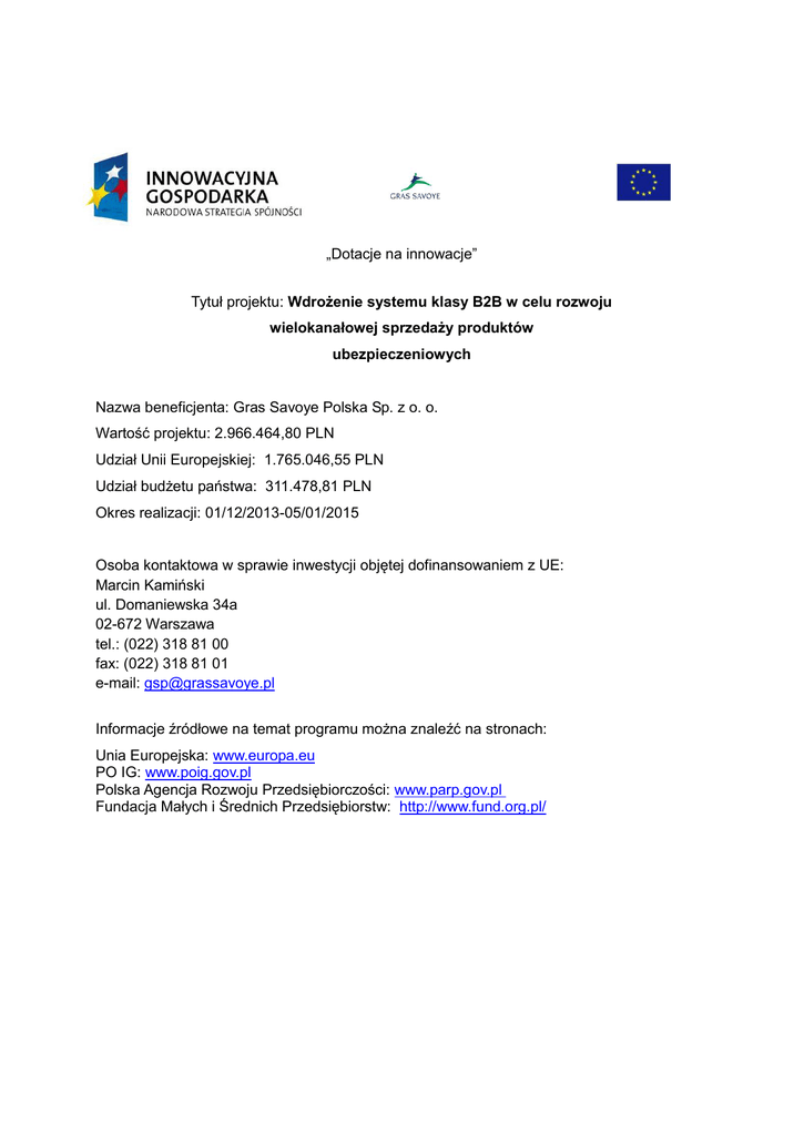 „Dotacje na innowacje” Tytuł projektu: Wdrożenie systemu klasy B2B w celu rozwoju wielokanałowej sprzedaży produktów ubezpieczeniowych Nazwa beneficjenta: Gras Savoye Polska Sp. z o. o. Wartość projektu: 2.966.464,80 PLN Udział Unii Europejskiej: 1.765.046,55 PLN Udział budżetu państwa: 311.478,81 PLN Okres realizacji: 01/12/2013-05/01/2015 Osoba kontaktowa w sprawie inwestycji objętej dofinansowaniem z UE: Marcin Kamiński ul. Domaniewska 34a 02-672 Warszawa tel.: (022) 318 81 00 fax: (022) 318 81 01 e-mail: [email protected] Informacje źródłowe na temat programu można znaleźć na stronach: Unia Europejska: www.europa.eu PO IG: www.poig.gov.pl Polska Agencja Rozwoju Przedsiębiorczości: www.parp.gov.pl Fundacja Małych i Średnich Przedsiębiorstw: http://www.fund.org.pl/