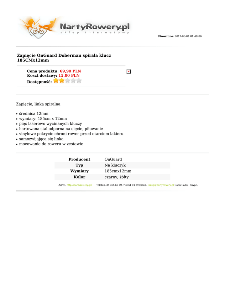Utworzono: 2017-03-04 01:48:06 Zapięcie OnGuard Doberman spirala klucz 185CMx12mm Cena produktu: 69,90 PLN Koszt dostawy: 15,00 PLN Dostępność: Zapięcie, linka spiralna ● ● ● ● ● ● ● średnica 12mm wymiary: 185cm x 12mm pięć laserowo wycinanych kluczy hartowana stal odporna na cięcie, piłowanie vinylowe pokrycie chroni rower przed otarciem lakieru samozwijająca się linka mocowanie do roweru w zestawie Producent Typ Wymiary Kolor Adres: http://nartyrowery.pl/ OnGuard Na kluczyk 185cmx12mm czarny, żółty Telefon: 34 365 66 09, 793 61 04 29 Email: [email protected] Gadu-Gadu: Skype: