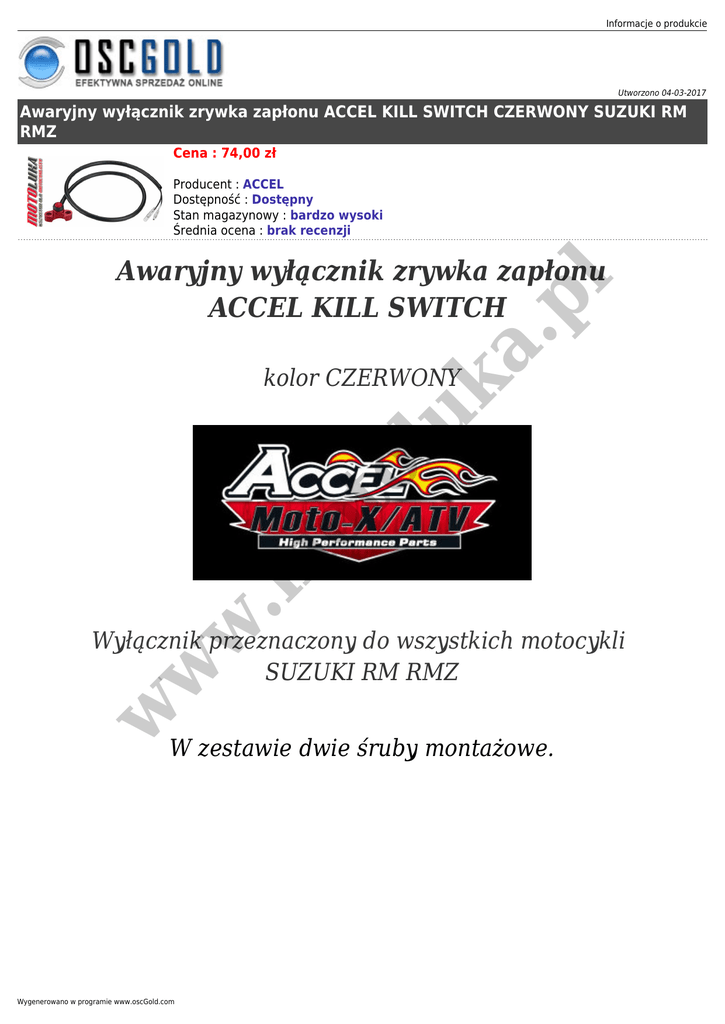 Informacje o produkcie Utworzono 04-03-2017 Awaryjny wyłącznik zrywka zapłonu ACCEL KILL SWITCH CZERWONY SUZUKI RM RMZ Cena : 74,00 zł Producent : ACCEL Dostępność : Dostępny Stan magazynowy : bardzo wysoki Średnia ocena : brak recenzji a. pl Awaryjny wyłącznik zrywka zapłonu ACCEL KILL SWITCH w w .m ot ol uk kolor CZERWONY w Wyłącznik przeznaczony do wszystkich motocykli SUZUKI RM RMZ W zestawie dwie śruby montażowe. Wygenerowano w programie www.oscGold.com w w w ot .m a. pl uk ol
