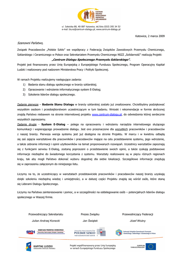 Katowice, 2 marca 2009 Szanowni Państwo, Związek Pracodawców „Polskie Szkło” we współpracy z Federacją Związków Zawodowych Przemysłu Chemicznego, Szklarskiego i Ceramicznego w Polsce oraz Sekretariatem Przemysłu Chemicznego NSZZ „Solidarność” realizują Projekt: „Centrum Dialogu Społecznego Przemysłu Szklarskiego”. Projekt jest finansowany przez Unię Europejską z Europejskiego Funduszu Społecznego, Program Operacyjny Kapitał Ludzki i realizowany pod nadzorem Ministerstwa Pracy i Polityki Społecznej. W ramach Projektu realizujemy następujące zadania: 1) Badania stanu dialogu społecznego w branży szklarskiej; 2) Opracowanie i wdrożenie informatycznego system E-Dialog; 3) Szkolenie liderów dialogu społecznego. Zadanie pierwsze – Badanie Stanu Dialogu w branży szklarskiej zostało już zrealizowane. Chcielibyśmy podziękować wszystkim osobom i przedsiębiorstwom uczestniczącym w tym badaniu. Wnioski i rekomendacje w formie skróconej znajdą Państwo niebawem na stronie internetowej projektu www.centrum-dialogu.pl, do odwiedzenia której serdecznie wszystkich zapraszamy. Zadanie drugie - System E-Dialog – polega na opracowaniu i wdrożeniu narzędzia internetowego służącego komunikacji i wspierającego prowadzenie dialogu. Jest ono przeznaczone dla wszystkich pracowników i pracodawców z naszej branży. Pierwsza wersja systemu jest już dostępna na stronie Projektu. W marcu i w kwietniu odbędą się zaś zajęcia warsztatowe dla pracowników i pracodawców mające na celu przedstawienie systemu, jego wdrożenie, a także zebranie informacji i opinii użytkowników na temat proponowanych rozwiązań. Uczestnicy warsztatów zapoznają się z funkcjami serwisu E-Dialog, zostaną poproszeni o przedstawienie swoich opinii, a także zyskają podstawowe informacje niezbędne do świadomego korzystania z systemu. Warsztaty realizowane są w pięciu różnych regionach kraju, tak aby mogli Państwo dokonać wyboru dogodnej dla siebie lokalizacji. Szczegółowe informacje znajdują się w zaproszeniu załączonym do niniejszego listu. Liczymy na to, że uczestniczący w warsztatach przedstawiciele pracowników i pracodawców naszej branży uzyskają dzięki szkoleniu niezbędną wiedzę i umiejętności, a w dalszej części Projektu znajdą się wśród osób, które staną się Liderami Dialogu Społecznego. Liczymy na Państwa zainteresowanie i pomoc, a w szczególności na oddelegowanie osób – potencjalnych liderów dialogu społecznego w Waszej firmie. Przewodniczący Sekretariatu Prezes Związku Przewodniczący Federacji Julian Andrzej Konecki Jan Świątek Józef Woźny „Centrum Dialogu Społecznego Przemysłu Szklarskiego” zaprasza do udziału w warsztatach dotyczących systemu E‐Dialog ‐‐‐‐‐‐‐‐‐‐‐‐‐‐‐‐‐‐‐‐‐‐‐‐‐‐‐‐‐‐‐‐‐‐‐‐‐‐‐‐‐‐‐‐‐‐‐‐‐‐‐‐‐‐‐‐‐‐‐‐‐‐‐‐‐‐‐‐‐‐‐‐‐‐‐‐‐‐‐‐‐‐‐‐‐‐‐‐‐‐‐‐‐‐‐‐‐‐‐‐‐‐‐‐‐‐‐‐‐‐‐‐‐‐‐‐‐‐‐‐‐‐‐‐‐‐‐‐‐‐‐‐‐‐‐‐‐‐‐‐‐‐‐‐‐‐‐‐‐‐‐‐‐‐‐‐‐‐‐‐‐‐‐‐‐‐ Cele warsztatów 1. Wdrożenie i promocja E‐Dialog ‐ systemu komunikacji oraz wspierania dialogu w branży. a. Zapoznanie uczestników z systemem. b. Przetestowanie proponowanych narzędzi. c. Zebranie opinii na temat możliwości doskonalenia i rozwoju funkcji systemu E‐Dialog. 2. Przedstawienie pojęcia , zasad i form prowadzenia dialogu społecznego. 3. Przygotowanie grupy osób zdolnej do prowadzenia dialogu społecznego w strukturach zakładowych oraz ponadzakładowych. ‐‐‐‐‐‐‐‐‐‐‐‐‐‐‐‐‐‐‐‐‐‐‐‐‐‐‐‐‐‐‐‐‐‐‐‐‐‐‐‐‐‐‐‐‐‐‐‐‐‐‐‐‐‐‐‐‐‐‐‐‐‐‐‐‐‐‐‐‐‐‐‐‐‐‐‐‐‐‐‐‐‐‐‐‐‐‐‐‐‐‐‐‐‐‐‐‐‐‐‐‐‐‐‐‐‐‐‐‐‐‐‐‐‐‐‐‐‐‐‐‐‐‐‐‐‐‐‐‐‐‐‐‐‐‐‐‐‐‐‐‐‐‐‐‐‐‐‐‐‐‐‐‐‐‐‐‐‐‐‐‐‐‐‐‐‐‐‐ RAMOWY PROGRAM WARSZTATÓW Dzień I do godz. 10.30 ‐ przyjazd uczestników 11.00 ‐ 14.00 ‐ zajęcia I 14.00 ‐ 15.00 ‐ przerwa obiadowa 15.00 ‐ 19.00 ‐ zajęcia II 19.30 ‐ kolacja Dzień II od 7.30 9.00 ‐ 13.30 13.30 ‐ 14.00 14.00 ‐ śniadanie ‐ zajęcia III ‐ podsumowanie warsztatów, wręczenie zaświadczeń ‐ obiad, wyjazd uczestników Zagadnienia objęte warsztatami 1. 2. 3. Wprowadzenie do tematyki dialogu społecznego: a. podstawowe pojęcia, b. podstawy prawne, c. formy i narzędzia dialogu Przemysł szklarski w Polsce – możliwości rozwoju dialogu społecznego: a. informacje ogólne o branży szklarskiej, b. historia dialogu autonomicznego i efekty dotychczasowych działań c. Projekt „Centrum Dialogu Społecznego Przemysłu Szklarskiego” System E‐Dialog a. słownik pojęć związanych z zastosowanymi technikami informatycznymi b. warsztaty praktyczne: zapoznanie się z platformą E‐Dialog (praca z komputerem) opinie, uwagi, propozycje MIEJSCA I TERMINY REALIZACJI WARSZTATÓW Zawiercie ‐ Hotel „Zawiercie” ‐ 27‐28 kwietnia Uwaga! Planowane wcześniej na 29 – 30 kwietnia warsztaty w Klimkówce koło Krosna odbędą się w późniejszym terminie. WARUNKI UCZESTNICTWA 1. Udział w warsztatach jest bezpłatny. 2. Spotkania realizowane są w grupach liczących 20 osób. 3. Organizator zwraca również koszty poniesione w związku z dotarciem na miejsce. 4. Każdy z Partnerów zapewnia udział w warsztatach swoich 30 przedstawicieli. Dodatkowo 10 miejsc zostanie uzupełnione przez przedstawicieli pracodawców. W załączeniu przekazujemy również Państwu list intencyjny do przedstawienia w zakładach pracy.