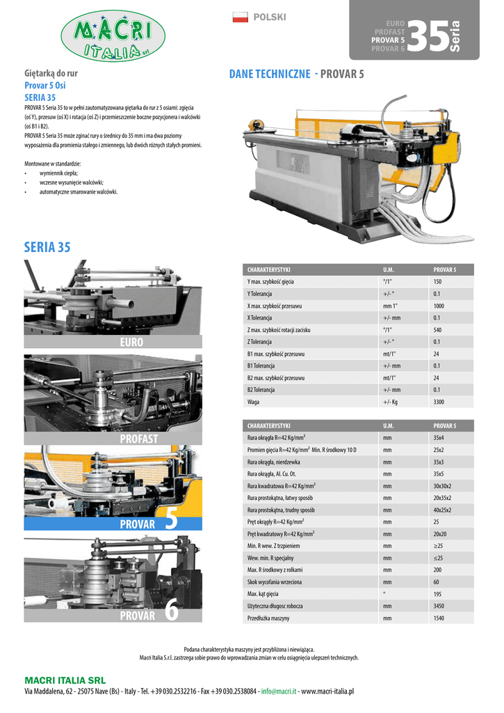 EURO PROFAST PROVAR 5 PROVAR 6 Seria polski Dane techniczne - Provar 5 Giętarką do rur Provar 5 Osi Seria 35 PROVAR 5 Seria 35 to w pełni zautomatyzowana giętarka do rur z 5 osiami: zgięcia (oś Y), przesuw (oś X) i rotacja (oś Z) i przemieszczenie boczne pozycjonera i walcówki (oś B1 i B2). PROVAR 5 Seria 35 może zginać rury o średnicy do 35 mm i ma dwa poziomy wyposażenia dla promienia stałego i zmiennego, lub dwóch różnych stałych promieni. Montowane w standardzie: • wymiennik ciepła; • wczesne wysunięcie walcówki; • automatyczne smarowanie walcówki. Seria 35 EURO PROFAST PROVAR PROVAR 5 6 CHARAKTERYSTYKI U.M. PROVAR 5 Y max. szybkość gięcia °/1" 150 Y Tolerancja +/- ° 0.1 X max. szybkość przesuwu mm 1" 1000 X Tolerancja +/- mm 0.1 Z max. szybkość rotacji zacisku °/1" 540 Z Tolerancja +/- ° 0.1 B1 max. szybkość przesuwu mt/1" 24 B1 Tolerancja +/- mm 0.1 B2 max. szybkość przesuwu mt/1" 24 B2 Tolerancja +/- mm 0.1 Waga +/- Kg 3300 CHARAKTERYSTYKI U.M. PROVAR 5 Rura okrągła R=42 Kg/mm² mm 35x4 Promien gięcia R=42 Kg/mm² Min. R środkowy 10 D mm 25x2 Rura okrągła, nierdzewka mm 35x3 Rura okrągła, Al. Cu. Ot. mm 35x5 Rura kwadratowa R=42 Kg/mm² mm 30x30x2 Rura prostokątna, łatwy sposób mm 20x35x2 Rura prostokątna, trudny sposób mm 40x25x2 Pręt okrągły R=42 Kg/mm² mm 25 Pręt kwadratowy R=42 Kg/mm² mm 20x20 Min. R wew. Z trzpieniem mm ≥25 Wew. min. R specjalny mm ≤25 Max. R środkowy z rolkami mm 200 Skok wycofania wrzeciona mm 60 Max. kąt gięcia ° 195 Użyteczna długosc robocza mm 3450 Przedłużka maszyny mm 1540 Podana charakterystyka maszyny jest przybliżona i niewiążąca. Macri Italia S.r.l. zastrzega sobie prawo do wprowadzania zmian w celu osiągnięcia ulepszeń technicznych. Macri Italia srl Via Maddalena, 62 - 25075 Nave (Bs) - Italy - Tel. +39 030.2532216 - Fax +39 030.2538084 - [email protected] - www.macri-italia.pl