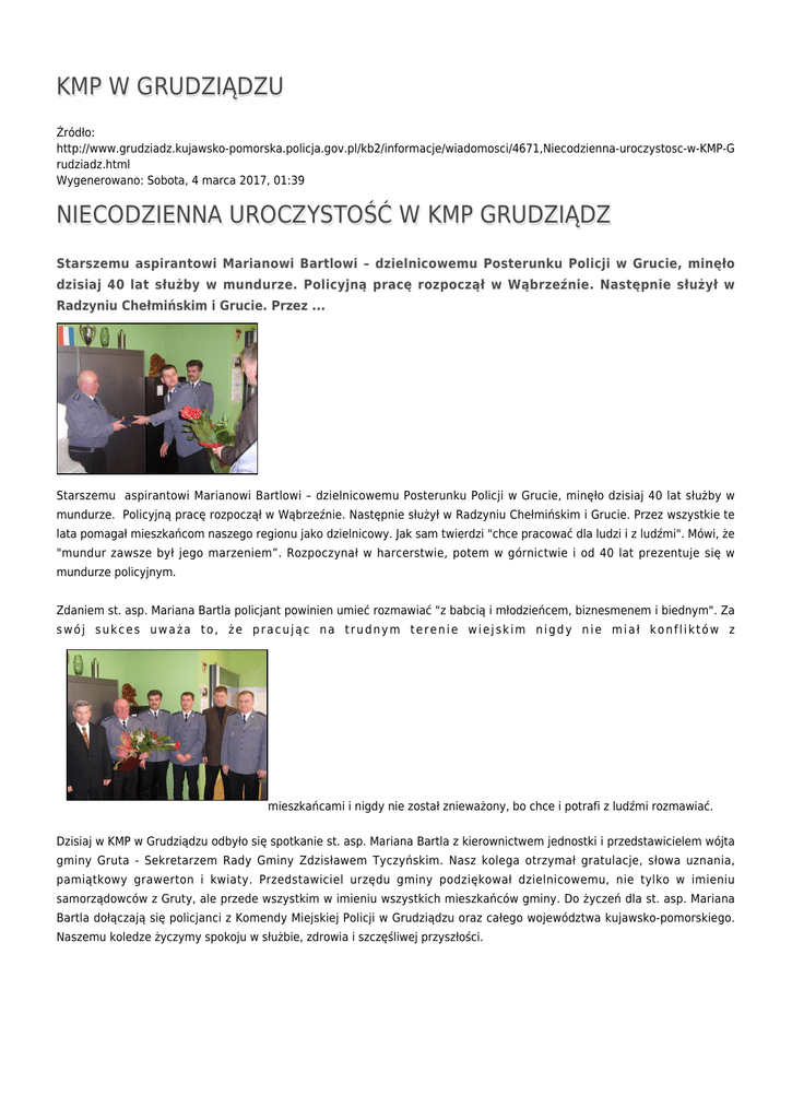 KMP W GRUDZIĄDZU Źródło: http://www.grudziadz.kujawsko-pomorska.policja.gov.pl/kb2/informacje/wiadomosci/4671,Niecodzienna-uroczystosc-w-KMP-G rudziadz.html Wygenerowano: Sobota, 4 marca 2017, 01:39 NIECODZIENNA UROCZYSTOŚĆ W KMP GRUDZIĄDZ Starszemu aspirantowi Marianowi Bartlowi – dzielnicowemu Posterunku Policji w Grucie, minęło dzisiaj 40 lat służby w mundurze. Policyjną pracę rozpoczął w Wąbrzeźnie. Następnie służył w Radzyniu Chełmińskim i Grucie. Przez ... Starszemu aspirantowi Marianowi Bartlowi – dzielnicowemu Posterunku Policji w Grucie, minęło dzisiaj 40 lat służby w mundurze. Policyjną pracę rozpoczął w Wąbrzeźnie. Następnie służył w Radzyniu Chełmińskim i Grucie. Przez wszystkie te lata pomagał mieszkańcom naszego regionu jako dzielnicowy. Jak sam twierdzi "chce pracować dla ludzi i z ludźmi". Mówi, że "mundur zawsze był jego marzeniem”. Rozpoczynał w harcerstwie, potem w górnictwie i od 40 lat prezentuje się w mundurze policyjnym. Zdaniem st. asp. Mariana Bartla policjant powinien umieć rozmawiać "z babcią i młodzieńcem, biznesmenem i biednym". Za swój sukces uważa to, że pracując na trudnym terenie wiejskim nigdy nie miał konfliktów z mieszkańcami i nigdy nie został znieważony, bo chce i potrafi z ludźmi rozmawiać. Dzisiaj w KMP w Grudziądzu odbyło się spotkanie st. asp. Mariana Bartla z kierownictwem jednostki i przedstawicielem wójta gminy Gruta - Sekretarzem Rady Gminy Zdzisławem Tyczyńskim. Nasz kolega otrzymał gratulacje, słowa uznania, pamiątkowy grawerton i kwiaty. Przedstawiciel urzędu gminy podziękował dzielnicowemu, nie tylko w imieniu samorządowców z Gruty, ale przede wszystkim w imieniu wszystkich mieszkańców gminy. Do życzeń dla st. asp. Mariana Bartla dołączają się policjanci z Komendy Miejskiej Policji w Grudziądzu oraz całego województwa kujawsko-pomorskiego. Naszemu koledze życzymy spokoju w służbie, zdrowia i szczęśliwej przyszłości. Opracowała: nadkom. Marzena Solochewicz-Kostrzewska Autor: grudziadz Publikacja: grudziadz Ocena: 0/5 (0) Tweetnij