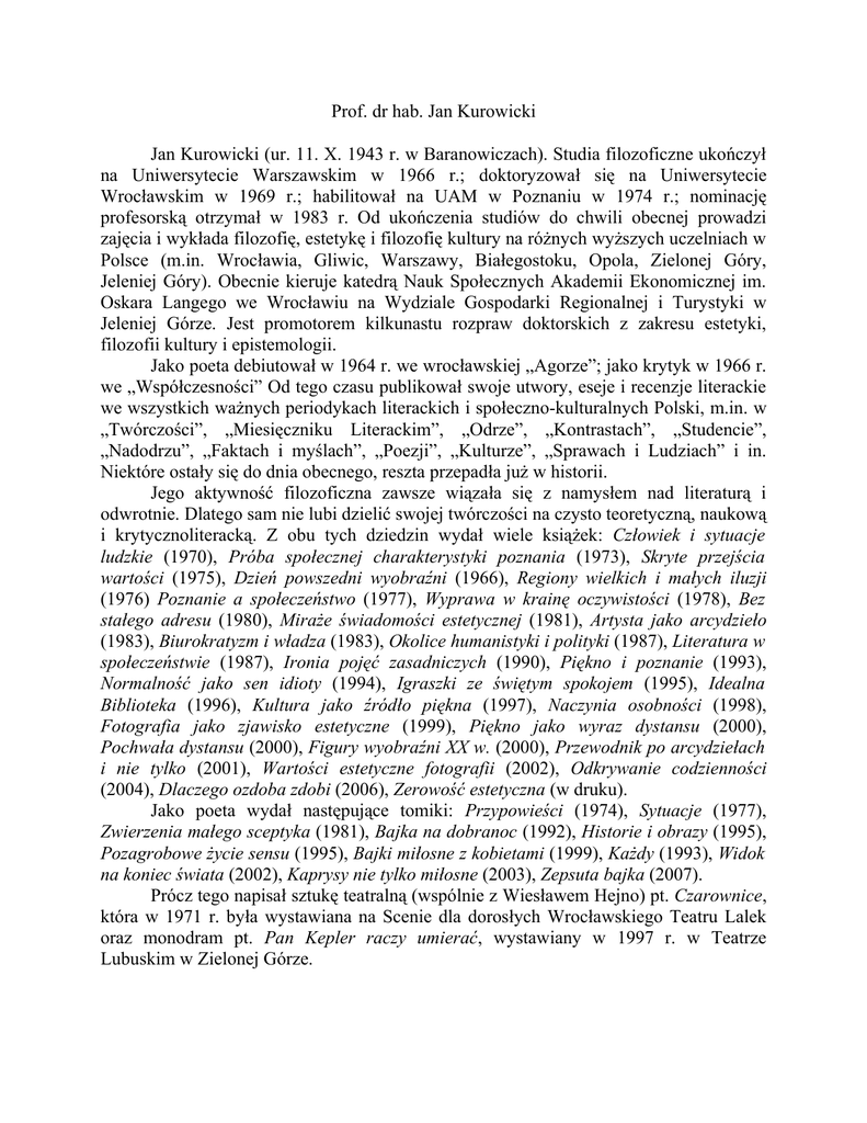 Prof. dr hab. Jan Kurowicki Jan Kurowicki (ur. 11. X. 1943 r. w Baranowiczach). Studia filozoficzne ukończył na Uniwersytecie Warszawskim w 1966 r.; doktoryzował się na Uniwersytecie Wrocławskim w 1969 r.; habilitował na UAM w Poznaniu w 1974 r.; nominację profesorską otrzymał w 1983 r. Od ukończenia studiów do chwili obecnej prowadzi zajęcia i wykłada filozofię, estetykę i filozofię kultury na różnych wyższych uczelniach w Polsce (m.in. Wrocławia, Gliwic, Warszawy, Białegostoku, Opola, Zielonej Góry, Jeleniej Góry). Obecnie kieruje katedrą Nauk Społecznych Akademii Ekonomicznej im. Oskara Langego we Wrocławiu na Wydziale Gospodarki Regionalnej i Turystyki w Jeleniej Górze. Jest promotorem kilkunastu rozpraw doktorskich z zakresu estetyki, filozofii kultury i epistemologii. Jako poeta debiutował w 1964 r. we wrocławskiej „Agorze”; jako krytyk w 1966 r. we „Współczesności” Od tego czasu publikował swoje utwory, eseje i recenzje literackie we wszystkich ważnych periodykach literackich i społeczno-kulturalnych Polski, m.in. w „Twórczości”, „Miesięczniku Literackim”, „Odrze”, „Kontrastach”, „Studencie”, „Nadodrzu”, „Faktach i myślach”, „Poezji”, „Kulturze”, „Sprawach i Ludziach” i in. Niektóre ostały się do dnia obecnego, reszta przepadła już w historii. Jego aktywność filozoficzna zawsze wiązała się z namysłem nad literaturą i odwrotnie. Dlatego sam nie lubi dzielić swojej twórczości na czysto teoretyczną, naukową i krytycznoliteracką. Z obu tych dziedzin wydał wiele książek: Człowiek i sytuacje ludzkie (1970), Próba społecznej charakterystyki poznania (1973), Skryte przejścia wartości (1975), Dzień powszedni wyobraźni (1966), Regiony wielkich i małych iluzji (1976) Poznanie a społeczeństwo (1977), Wyprawa w krainę oczywistości (1978), Bez stałego adresu (1980), Miraże świadomości estetycznej (1981), Artysta jako arcydzieło (1983), Biurokratyzm i władza (1983), Okolice humanistyki i polityki (1987), Literatura w społeczeństwie (1987), Ironia pojęć zasadniczych (1990), Piękno i poznanie (1993), Normalność jako sen idioty (1994), Igraszki ze świętym spokojem (1995), Idealna Biblioteka (1996), Kultura jako źródło piękna (1997), Naczynia osobności (1998), Fotografia jako zjawisko estetyczne (1999), Piękno jako wyraz dystansu (2000), Pochwała dystansu (2000), Figury wyobraźni XX w. (2000), Przewodnik po arcydziełach i nie tylko (2001), Wartości estetyczne fotografii (2002), Odkrywanie codzienności (2004), Dlaczego ozdoba zdobi (2006), Zerowość estetyczna (w druku). Jako poeta wydał następujące tomiki: Przypowieści (1974), Sytuacje (1977), Zwierzenia małego sceptyka (1981), Bajka na dobranoc (1992), Historie i obrazy (1995), Pozagrobowe życie sensu (1995), Bajki miłosne z kobietami (1999), Każdy (1993), Widok na koniec świata (2002), Kaprysy nie tylko miłosne (2003), Zepsuta bajka (2007). Prócz tego napisał sztukę teatralną (wspólnie z Wiesławem Hejno) pt. Czarownice, która w 1971 r. była wystawiana na Scenie dla dorosłych Wrocławskiego Teatru Lalek oraz monodram pt. Pan Kepler raczy umierać, wystawiany w 1997 r. w Teatrze Lubuskim w Zielonej Górze.