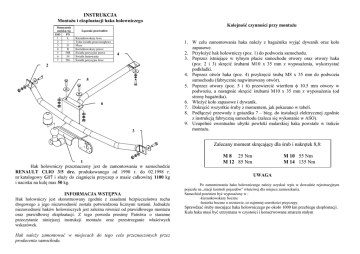 INSTRUKCJA MontaŜu i eksploatacji haka holowniczego Oznaczenie zacisku wg ISO PN 1 L 2 + 3 31 4 R 5 58R 6 54 7 58L Kolejność czynności przy montaŜu Łączenie przewodów Kierunkowskazy lewe Tylne światła przeciwmgłowe Masa Kierunkowskazy prawe Światła pozycyjne prawe Światła hamowania Światła pozycyjne lewe 4 2 5 6 3 1. W celu zamontowania haka naleŜy z bagaŜnika wyjąć dywanik oraz koło zapasowe. 2. PrzyłoŜyć hak holowniczy (poz. 1) do podwozia samochodu. 3. Poprzez istniejące w tylnym płacie samochodu otwory oraz otwory haka (poz. 2 i 3) skręcić śrubami M10 x 35 mm z wyposaŜenia, wykorzystać podkładki. 4. Poprzez otwór haka (poz. 4) przykręcić śrubą M8 x 35 mm do podwozia samochodu (fabrycznie nagwintowany otwór). 5. Poprzez otwory (poz. 5 i 6) przewiercić wiertłem φ 10.5 mm otwory w podwoziu, a następnie skręcić śrubami M10 x 35 mm z wyposaŜenia (od strony bagaŜnika). 6. WłoŜyć koło zapasowe i dywanik. 7. Dokręcić wszystkie śruby z momentem, jak pokazano w tabeli. 8. Podłączyć przewody z gniazdka 7 – bieg. do instalacji elektrycznej zgodnie z instrukcją fabryczną samochodu (zaleca się wykonanie w ASO). 9. Uzupełnić ewentualne ubytki powłoki malarskiej haka powstałe w trakcie montaŜu. Zalecany moment skręcający dla śrub i nakrętek 8,8: 1 Hak holowniczy przeznaczony jest do zamontowania w samochodzie RENAULT CLIO 3/5 drz. produkowanego od 1990 r. do 02.1998 r. nr katalogowy G17 i słuŜy do ciągnięcia przyczep o masie całkowitej 1100 kg i nacisku na kulę max 50 kg. INFORMACJA WSTĘPNA Hak holowniczy jest skonstruowany zgodnie z zasadami bezpieczeństwa ruchu drogowego a jego niezawodność została potwierdzona licznymi testami. JednakŜe niezawodność haków holowniczych jest zaleŜna równieŜ od prawidłowego montaŜu oraz prawidłowej eksploatacji. Z tego powodu prosimy Państwa o staranne przeczytanie niniejszej instrukcji montaŜu oraz przestrzeganie właściwych wskazówek. Hak naleŜy zamontować w miejscach do tego celu przeznaczonych przez producenta samochodu. M 8 25 Nm M 12 85 Nm M 10 55 Nm M 14 135 Nm UWAGA Po zamontowaniu haka holowniczego naleŜy uzyskać wpis w dowodzie rejestracyjnym pojazdu na „stacji kontroli pojazdów” właściwej dla miejsca zamieszkania. Samochód powinien być wyposaŜony w : -kierunkowskazy boczne -lusterka boczne o rozstawie, co najmniej szerokości przyczepy. Sprawdzać śruby mocujące haka holowniczego po około 1000 km przebiegu eksploatacji. Kula haka musi być utrzymana w czystości i konserwowana smarem stałym KARTA GWARANCYJNA Producent udziela gwarancji niniejszą kartą gwarancyjną na okres 1 rok licząc od dnia zakupu haka holowniczego do samochodów: RENAULT CLIO PPUH AUTO-HAK s.j. Produkcja Haków Holowniczych Henryk & Zbigniew Nejman 76-200 SŁUPSK ul. Słoneczna 16E tel/fax (059) 84-14-414; 84-14-413 E-mail: [email protected] www. autohak.com.pl 3/5 drz. Produkowanego od 1990 r. do 02.1998 r. Data produkcji .............................. Data zakupu................................... HAK HOLOWNICZY DO SAMOCHODU TYPU: RENAULT CLIO 3/5 drz. Gwarancja odnosi się do wad ukrytych wynikających z niezgodności z aktualnie zobowiązującymi normami a zwłaszcza ze złej konstrukcji, zastosowania wadliwych materiałów itp. Gwarancja nie obejmuje natomiast uszkodzeń zawinionych przez nabywcę, a zwłaszcza na skutek nieprzestrzegania zasad konserwacji i uŜytkowania powstałych w czasie przewozów dokonanych przez nabywcę. Reklamacje naleŜy zgłaszać w punkcie sprzedaŜy, składając jednocześnie kartę gwarancyjną. Usunięcie "wady" następuje po stwierdzeniu przez punkt sprzedaŜy wspólnie z producentem słuszności złoŜonej reklamacji. Reklamacja powinna być załatwiona w ciągu czternastu dni od dnia uznania reklamacji. Karta gwarancyjna jest niewaŜna, jeŜeli nie jest wypełniona i podpisana. Produkowanego od 1990 r. do 02.1998 r. Nr kat. G 17 Data zgłoszenia reklamacji: ................................................................... CERTYFIKAT Nr B/1/199/2000