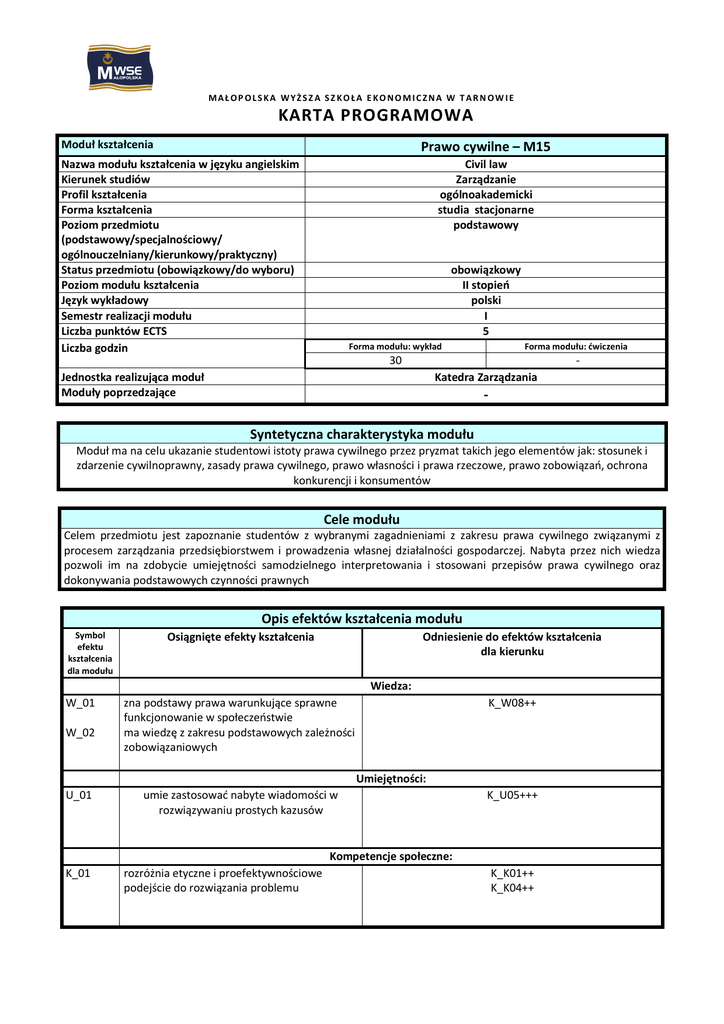 MAŁOP OLSKA WYŻSZ A SZ KOŁA E KONOMICZNA W TARN OW IE KARTA PROGRAMOWA Moduł kształcenia Prawo cywilne – M15 Nazwa modułu kształcenia w języku angielskim Kierunek studiów Profil kształcenia Forma kształcenia Poziom przedmiotu (podstawowy/specjalnościowy/ ogólnouczelniany/kierunkowy/praktyczny) Status przedmiotu (obowiązkowy/do wyboru) Poziom modułu kształcenia Język wykładowy Semestr realizacji modułu Liczba punktów ECTS Liczba godzin Civil law Zarządzanie ogólnoakademicki studia stacjonarne podstawowy obowiązkowy II stopień polski I 5 Forma modułu: wykład Forma modułu: ćwiczenia 30 - Jednostka realizująca moduł Moduły poprzedzające Katedra Zarządzania Syntetyczna charakterystyka modułu Moduł ma na celu ukazanie studentowi istoty prawa cywilnego przez pryzmat takich jego elementów jak: stosunek i zdarzenie cywilnoprawny, zasady prawa cywilnego, prawo własności i prawa rzeczowe, prawo zobowiązań, ochrona konkurencji i konsumentów Cele modułu Celem przedmiotu jest zapoznanie studentów z wybranymi zagadnieniami z zakresu prawa cywilnego związanymi z procesem zarządzania przedsiębiorstwem i prowadzenia własnej działalności gospodarczej. Nabyta przez nich wiedza pozwoli im na zdobycie umiejętności samodzielnego interpretowania i stosowani przepisów prawa cywilnego oraz dokonywania podstawowych czynności prawnych Opis efektów kształcenia modułu Symbol efektu kształcenia dla modułu Osiągnięte efekty kształcenia Odniesienie do efektów kształcenia dla kierunku Wiedza: W_01 W_02 zna podstawy prawa warunkujące sprawne funkcjonowanie w społeczeństwie ma wiedzę z zakresu podstawowych zależności zobowiązaniowych K_W08++ Umiejętności: U_01 umie zastosować nabyte wiadomości w rozwiązywaniu prostych kazusów K_U05+++ Kompetencje społeczne: K_01 rozróżnia etyczne i proefektywnościowe podejście do rozwiązania problemu K_K01++ K_K04++ Treści kształcenia modułu Forma modułu: wykład 1. Pojęcie prawa cywilnego – jego miejsce w systemie prawa. 2. Prawo cywilne jako część prawa prywatnego. 3. Źródła prawa cywilnego – historia źródeł prawa. 4. Zdarzenie cywilnoprawne, stosunek cywilnoprawny. 5. Obowiązki menadżerów w świetle prawa. 6. Prawo podmiotowe, nadużycie prawa. 7. Zasady prawa cywilnego. 8. Prawo własności i charakterystyka praw rzeczowych. 9. Prawo zobowiązań. 10. Bezpodstawne wzbogacenie, czyny niedozwolone. 11. Prawna ochrona konkurencji i konsumentów. 1. 2. 3. Forma modułu: ćwiczenia Prawo cywilne – część ogólna: - pojecie prawa cywilnego: - miejsce prawa cywilnego w systemie prawa, - prawo cywilne jako część prawa prywatnego, - źródła prawa cywilnego, historia źródeł prawa, - zdarzenia cywilnoprawne, - stosunek cywilnoprawny, - obowiązki menadżerów w świetle prawa, - prawo podmiotowe, - nadużycie prawa, - zasady prawa cywilnego. Prawo rzeczowe, prawo zobowiązań: - prawo własności i charakterystyka praw rzeczowych, - prawo zobowiązań – pojecie zobowiązania, długu i odpowiedzialności, - ogólne przepisy o zobowiązaniach, w tym o zobowiązaniach umownych. Prawo zobowiązań: - bezpodstawne wzbogacenie, - czyny niedozwolone, - wykonanie zobowiązań, - skutki niewykonania zobowiązania - prawna ochrona konkurencji i konsumentów Literatura podstawowa 1. Prawo cywilne, K. Czajkowska-Matosiuk, wyd. 2, Warszawa 2011. 2. Aplikacje prawnicze w pytaniach i odpowiedziach, K. Czajkowska-Matosiuk, t. 1, wyd. 5, Warszawa 2011. 3. Komentarz do kodeksu cywilnego pod red. G. Bieniek, Warszawa 2011. 4. Zbiór ustaw, Warszawa 2011. 5. Biegun Edward, Jezioro Julian, Kierzyk Tadeusz, Grolny Katarzyna, Podstawy Prawa Cywilnego, Cześć ogólna, Prawo Rzeczowe, Wyd. Legnica 2004 r. 6. Ciszewski Jerzy, Stępień Anna, Prawo cywilne w pytaniach i odpowiedziach, Wyd. LexisNexis 2007. Literatura uzupełniająca 1. Prawo cywilne. Zobowiązania, Z. Radwański, Warszawa 2011. 2. Prawo cywilne – część ogólna, Z. Radwański, Warszawa 2011 Metody dydaktyczne Zajęcia prowadzone są w formie wykładu łącząc oddziaływanie werbalne z wizualnym dzięki wykorzystaniu technik multimedialnych. Na ćwiczeniach wykład materiału, zapoznanie z orzeczeniami, rozwiązywanie kazusów