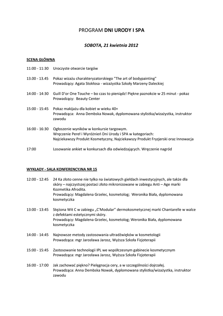 PROGRAM DNI URODY I SPA SOBOTA, 21 kwietnia 2012 SCENA GŁÓWNA 11:00 - 11:30 Uroczyste otwarcie targów 13.00 - 13.45 Pokaz wizażu charakteryzatorskiego "The art of bodypainting" Prowadzący: Agata Stokłosa - wizażystka Szkoły Marzeny Daleckiej 14:00 - 14:30 Guill D’or One Touche – bo czas to pieniądz! Piękne paznokcie w 25 minut - pokaz Prowadzący: Beauty Center 15:00 - 15:45 Pokaz makijażu dla kobiet w wieku 40+ Prowadząca: Anna Dembska Nowak, dyplomowana stylistka/wizażystka, instruktor zawodu 16:00 - 16:30 Ogłoszenie wyników w konkursie targowym. Wręczenie Pereł i Wyróżnień Dni Urody i SPA w kategoriach: Najciekawszy Produkt Kosmetyczny, Najciekawszy Produkt Fryzjerski oraz Innowacja 17:00 Losowanie ankiet w konkursach dla odwiedzających. Wręczenie nagród WYKŁADY - SALA KONFERENCYJNA NR 15 12:00 - 12:45 24 Ka złoto cenne nie tylko na światowych giełdach inwestycyjnych, ale także dla skóry – najczystszej postaci złoto mikronizowane w zabiegu Anti – Age marki Kozmetika Afrodita. Prowadzący: Magdalena Grzelec, kosmetolog; Weronika Biała, dyplomowana kosmetyczka 13:00 - 13:45 Stężona Wit C w zabiegu „C’Modular” dermokosmetycznej marki Chantarelle w walce z defektami estetycznymi skóry. Prowadzący: Magdalena Grzelec, kosmetolog; Weronika Biała, dyplomowana kosmetyczka 14:00 - 14:45 Najnowsze metody zastosowania ultradźwięków w kosmetologii Prowadząca: mgr Jarosława Jarosz, Wyższa Szkoła Fizjoterapii 15:00 - 15:45 Zastosowanie technologii IPL we współczesnym gabinecie kosmetycznym Prowadząca: mgr Jarosława Jarosz, Wyższa Szkoła Fizjoterapii 16:00 - 17:00 Jak zachować piękno? Pielęgnacja cery, a w szczególności dojrzałej. Prowadząca: Anna Dembska Nowak, dyplomowana stylistka/wizażystka, instruktor zawodu POKAZY, ZABIEGI - SALA KONFERENCYJNA NR 41 12:00 - 12:30 Korekta wrastających paznokci przy użyciu Kostki Arkady Prowadząca: Bernadetta Chudzikowska-Łaś, kosmetolog, specjalista podolog, konsultant w Dolnośląskiej Poradni Stopy Cukrzycowej 13:00 - 14:00 Fakty i mity Mikrodermabrazji Korundowej z zastosowaniem japońskiej linii kosmetycznej Salacia Arius Prowadzący: Agnieszka Prus, mgr kosmetolog, specjalista ds. mikropigmentacji, Bernadetta Chudzikowska - Łaś, kosmetolog, specjalista podolog 14:00 - 14:45 Triotechnologia - nowa era walki z cellulitem. Efektywne wykorzystanie połączenia kawitacji ze standardowymi zabiegami kosmetycznymi. Trzy sposoby wykorzystania kawitacji. Prowadzący - Marzena Dalecka - kosmetolog, doktorant, właściciel Instytutu Medycyny Estetycznej we Wrocławiu, Agnieszka Posłuszny - magister fizjoterapii 15:00 - 16:00 Mikroigłowa terapia Euro Touch - Anty Age przy pomocy mezoterapii mikroigłowej Prowadząca: Agnieszka Prus , mgr kosmetolog, specjalista ds. mikropigmentacji 16:15 – 17:30 Urządzenie Coco najnowsze osiągnięcia chirurgii estetycznej z Japonii. Unikalna synergia 3 fal, ultradźwięków i elektroakupunktury dająca natychmiastowy efekt liftingu, spłycenia zmarszczek, rozjaśnienia przebarwień, modelowania sylwetki. Efekty już po pierwszym zabiegu. Prowadząca: mgr inż. biotechnologii Sylwia Fryziel specjalista szkoleniowiec w firmie Surima. NIEDZIELA, 22 kwietnia 2012 SCENA GŁÓWNA 11: 00 – 11:45 Hialuron 3D - alternatywa dla botoksu i wypełniaczy. Prowadząca: Iwona Wójcik - kosmetyczka, specjalista ds. szkoleń i marki ETRE BELLE, wyłączny dystrybutor marki ETRE BELLE w Polsce 12:00 -13:00 Pokaz wizażu – makijaż wieczorowy, okolicznościowy Prowadząca: Inez Wacowska, wizażystka Belle Epoque 13.00 - 14.00 Moc kamieni wulkanicznych - ciało człowieka i filozofia RAJAWATU. Balinezyjskie spa. Prowadząca: Iwona Wójcik - kosmetyczka, specjalista ds. szkoleń i marki ETRE BELLE, wyłączny dystrybutor marki ETRE BELLE w Polsce 14:00 - 14:30 Guill D’or One Touche – bo czas to pieniądz! Piękne paznokcie w 25 minut - pokaz Prowadzący: Beauty Center 14:30 - 15:00 Makijaż na wiosnę – Pokaz i porady Prowadząca: Anna Dembska Nowak, dyplomowana stylistka/wizażystka, instruktor zawodu 15:15 - 15:30 Pokaz tańca brzucha Kamila Piróg, Małgorzata Dudek, instruktorki tańca brzucha 15:45 - 16:15 Wybory Miss Dni Urody i SPA –prezentacje i ogłoszenie wyników 16:30 - 16:45 Pokaz tańca brzucha Kamila Piróg, Małgorzata Dudek, instruktorki tańca brzucha 17:00 Losowanie ankiet w konkursach dla odwiedzających. Wręczenie nagród WYKŁADY - SALA KONFERENCYJNA NR 15 11:00 – 11:45 Peeling Ferulac jako całoroczny peeling antyoksydacjyny w technologii nanosomalnej. Prowadząca: mgr inż. biotechnologii Sylwia Fryziel specjalista szkoleniowiec w firmie Surima. 12:00 - 12:45 Innowacyjny zabieg młodości „Estrini” dermokosmetycznej marki Chantarelle dla skóry dojrzałej i bardzo dojrzałej, oparty na zaawansowanych formułach kompleksów fitoestrogenów. Prowadzący: Magdalena Grzelec, kosmetolog; Weronika Biała, dyplomowana kosmetyczka 13.00 - 13.45 Triotechnologia - nowa era walki z cellulitem. Efektywne wykorzystanie połączenia kawitacji ze standardowymi zabiegami kosmetycznymi. Trzy sposoby wykorzystania kawitacji. Prowadzący - Marzena Dalecka - kosmetolog, doktorant, właściciel Instytutu Medycyny Estetycznej we Wrocławiu, Agnieszka Posłuszny - magister fizjoterapii. 14:00 - 15:30 Tajniki prawidłowego demakijażu i oczyszczania skóry Prowadząca: Maria Śmiechowicz, konsultantka firmy Ziaja, wizażystka, kosmetyczka 15:30 - 16:30 Jak być modnym na co dzień - trendy w kolorach i fasonach Wiosna 2012. Warsztaty ze stylizacji oraz indywidualne konsultacje. Prowadząca: Anna Dembska Nowak, dyplomowana stylistka/wizażystka, instruktor zawodu POKAZY, ZABIEGI - SALA KONFERENCYJNA NR 41 13:00 - 14:00 Natura w służbie zdrowia i urody skóry – wykorzystanie 100% naturalnych olejków marki Kozmetika Afrodita w orientalnym masażu autorskim „Dashira” (z elementami masażu tajskiego, Lomi Lomi Nui i Peloha) Prowadzący: Magdalena Grzele