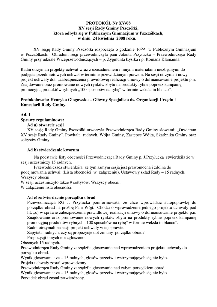 PROTOKÓŁ Nr XV/08 XV sesji Rady Gminy Pszczółki, która odbyła się w Publicznym Gimnazjum w Pszczółkach, w dniu 24 kwietnia 2008 roku. XV sesję Rady Gminy Pszczółki rozpoczęto o godzinie 16oo w Publicznym Gimnazjum w Pszczółkach. Obradom sesji przewodniczyła pani Jolanta Przyłucka – Przewodnicząca Rady Gminy przy udziale Wiceprzewodniczących – p. Zygmunta Łysika i p. Romana Klamanna. Radni otrzymali projekty uchwał wraz z uzasadnieniem i innymi materiałami niezbędnymi do podjęcia przedmiotowych uchwał w terminie przewidzianym prawem. Na sesji otrzymali nowy projekt uchwały dot. „zabezpieczenia prawidłowej realizacji umowy o dofinansowanie projektu p.n. Znajdowanie oraz promowanie nowych rynków zbytu na produkty rybne poprzez kampanię promocyjną produktów rybnych „100 sposobów na rybę” w formie weksla in blanco”. Protokołowała: Henryka Głogowska – Główny Specjalista ds. Organizacji Urzędu i Kancelarii Rady Gminy. Ad. 1 Sprawy regulaminowe: Ad a) otwarcie sesji XV sesję Rady Gminy Pszczółki otworzyła Przewodnicząca Rady Gminy słowami: „Otwieram XV sesję Rady Gminy”. Powitała radnych, Wójta Gminy, Zastępcę Wójta, Skarbnika Gminy oraz sołtysów Gminy. Ad b) stwierdzenie kworum Na podstawie listy obecności Przewodnicząca Rady Gminy p. J.Przyłucka stwierdziła że w sesji uczestniczy 15 radnych. Przewodnicząca stwierdziła, że tym samym sesja jest prawomocna i zdolna do podejmowania uchwał. (Lista obecności w załączeniu). Ustawowy skład Rady – 15 radnych. Wszyscy obecni. W sesji uczestniczyło także 9 sołtysów. Wszyscy obecni. W załączeniu lista obecności. Ad c) zatwierdzenie porządku obrad Przewodnicząca RG J. Przyłucka poinformowała, że chce wprowadzić autopoprawkę do porządku obrad na prośbę Pani Wójt. Chodzi o wprowadzenie jednego projektu uchwały pod lit. „c) w sprawie zabezpieczenia prawidłowej realizacji umowy o dofinansowanie projektu p.n. Znajdowanie oraz promowanie nowych rynków zbytu na produkty rybne poprzez kampanię promocyjną produktów rybnych „100 sposobów na rybę” w formie weksla in blanco”. Radni otrzymali na sesji projekt uchwały w tej sprawie. Zapytała radnych, czy są propozycje dot zmiany porządku obrad? Propozycji innych nie zgłoszono. Obecnych 15 radnych. Przewodnicząca Rady Gminy zarządziła głosowanie nad wprowadzeniem projektu uchwały do porządku obrad. Wynik głosowania: za – 15 radnych, głosów przeciw i wstrzymujących się nie było. Projekt uchwały został wprowadzony. Przewodnicząca Rady Gminy zarządziła głosowanie nad całym porządkiem obrad. Wynik głosowania: za – 15 radnych, głosów przeciw i wstrzymujących się nie było. Porządek obrad został zatwierdzony. PORZĄDEK OBRAD XV sesji Rady Gminy Pszczółki przedstawiał się następująco: 1. Sprawy regulaminowe: a) otwarcie sesji, b) stwierdzenie kworum, c) przedstawienie porządku obrad, d) przyjęcie protokołu XIV sesji, e) interpelacje radnych i zapytania sołtysów, f) odpowiedzi na interpelacje i zapytania. 2. Rozpatrzenie i podjęcie następujących uchwał: a) Rozpatrzenie sprawozdania i ocena wykonania budżetu Gminy Pszczółki za 2007 rok - wystąpienie Wójta Gminy i Skarbnika Gminy. b) Opinia Regionalnej Izby Obrachunkowej w Gdańsku o sprawozdaniu z wykonania budżetu Gminy Pszczółki za 2007 rok – przedstawia Skarbnik Gminy Pani Jolanta Żbikowska. c) Przedstawienie opinii Komisji Rewizyjnej o wykonaniu budżetu Gminy Pszczółki za 2007 rok – przedstawia Przewodnicząca Komisji Pani Janina Jakowska. d) Przedstawienie wniosku Komisji Rewizyjnej w sprawie udzielenia absolutorium Wójtowi Gminy Pszczółki z tytułu wykonania budżetu za 2007 rok – przedstawia Przewodnicząca Komisji Rewizyjnej Pani Janina Jakowska. e) Opinia Regionalnej Izby Obrachunkowej w Gdańsku w sprawie wniosku Komisji Rewizyjnej o udzielenie absolutorium Wójtowi Gminy Pszczółki – przedstawia Skarbnik Gminy Pani Jolanta Żbikowska. 7. Podjęcie uchwały w sprawie absolutorium dla Wójta Gminy Pszczółki z wykonania budżetu gminy za 2007 rok – referuje Przewodnicząca Rady Gminy Pani Jolanta Przyłucka. 8. Sprawozdanie z działalności Gminnego Ośrodka Pomocy Społecznej w Pszczółkach za 2007 rok – referuje Kierownik GOPS-u. 9. Rozpatrzenie i podjęcie następujących uchwał: a) Projekt uchwały w sprawie zatwierdzenia sprawozdania finansowego za 2007 rok Gminnej Biblioteki Publicznej w Pszczółkach – referuje Dyrektor GBP Pani Bogumiła Tuźnik, b) Projekt uchwały w sprawie zmiany budżetu Gminy Pszczółki na 2008 rok – referuje Skarbnik Gminy p. Jolanta Żbikowska, c) Projekt uchwały w sprawie zabezpieczenia prawidłowej realizacji umowy o dofinansowanie projektu p.n. Znajdowanie oraz promowanie nowych rynków zbytu na produkty rybne poprzez kampanię promocyjną produktów rybnych „100 sposobów na rybę” w formie weksla in blanco – referuje Wójt Gminy p. Hanna Brejwo. 10. Wolne wnioski i informacje. 11. Zamknięcie obrad sesji. Ad. 1 d) przyjęcie protokołu XIV sesji: Przewodnicząca Rady Gminy J. Przyłucka stwierdziła, że protokół XIV sesji Rady Gminy był wyłożony do wglądu i radni nie wnieśli żadnych poprawek. Protokół Nr XIV/08 został zatwierdzony przy braku sprzeciwu. Ad. 1 e) interpelacje i zapytania radnych oraz zapytania sołtysów: Sołtys P. Nowomiejski zapytał o sprawę projektu statutu sołectw. Poprosił o wpisanie do projektu statutu zapisu, że sołectwo działa na podstawie ustawy o samorządzie gminnym oraz że sołectwo ma zdolność sądową. Chodzi o to, aby każde sołectwo miało możliwość występowania do sądu. Przew. RG j. Przyłucka wyjaśniła, że odbywają się zebrania wiejskie na których będą przeprowadzone konsultacje z mieszkańcami w sprawie przyjęcia projektów statutów sołectw. Takie zebranie odbędzie się również w Rębielczu. Po konsultacjach projekt statutu trafi na Radę Gminy. Pro