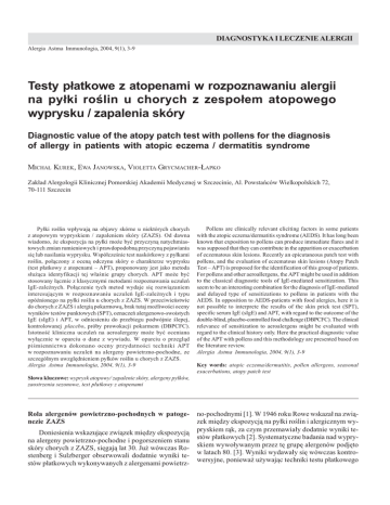 Kurek M., Janowska E., Grycmacher-£apko V. Testy p³atkowe zDIAGNOSTYKA atopenami (APT) w rozpoznawaniu alergii ... 3 I LECZENIE ALERGII Alergia Astma Immunologia, 2004, 9(1), 3-9 Testy p³atkowe z atopenami w rozpoznawaniu alergii na py³ki rolin u chorych z zespo³em atopowego wyprysku / zapalenia skóry Diagnostic value of the atopy patch test with pollens for the diagnosis of allergy in patients with atopic eczema / dermatitis syndrome MICHA£ KUREK, EWA JANOWSKA, VIOLETTA GRYCMACHER-£APKO Zak³ad Alergologii Klinicznej Pomorskiej Akademii Medycznej w Szczecinie, Al. Powstañców Wielkopolskich 72, 70-111 Szczecin Py³ki rolin wp³ywaj¹ na objawy skórne u niektórych chorych z atopowym wypryskiem / zapaleniem skóry (ZAZS). Od dawna wiadomo, ¿e ekspozycja na py³ki mo¿e byæ przyczyn¹ natychmiastowych zmian rumieniowych i prawdopodobn¹ przyczyn¹ pojawiania siê lub nasilania wyprysku. Wspó³czenie test naskórkowy z py³kami rolin, po³¹czony z ocen¹ odczynu skóry o charakterze wyprysku (test p³atkowy z atopenami APT), proponowany jest jako metoda s³u¿¹ca identyfikacji tej w³anie grupy chorych. APT mo¿e byæ stosowany ³¹cznie z klasycznymi metodami rozpoznawania uczuleñ IgE-zale¿nych. Po³¹czenie tych metod wydaje siê rozwi¹zaniem interesuj¹cym w rozpoznawaniu uczuleñ IgE-zale¿nych i typu opónionego na py³ki rolin u chorych z ZAZS. W przeciwieñstwie do chorych z ZAZS i alergi¹ pokarmow¹, brak tutaj mo¿liwoci oceny wyników testów punktowych (SPT), oznaczeñ alergenowo-swoistych IgE (sIgE) i APT, w odniesieniu do przebiegu podwójnie lepej, kontrolowanej placebo, próby prowokacji pokarmem (DBPCFC). Istotnoæ kliniczna uczuleñ na aeroalergeny mo¿e byæ oceniana wy³¹cznie w oparciu o dane z wywiadu. W oparciu o przegl¹d pimiennictwa dokonano oceny przydatnoci techniki APT w rozpoznawaniu uczuleñ na alergeny powietrzno-pochodne, ze szczególnym uwzglêdnieniem py³ków rolin u chorych z ZAZS. Alergia Astma Immunologia, 2004, 9(1), 3-9 S³owa kluczowe: wyprysk atopowy/ zapalenie skóry, alergeny py³ków, zaostrzenia sezonowe, test p³atkowy z atopenami Rola alergenów powietrzno-pochodnych w patogenezie ZAZS Doniesienia wskazuj¹ce zwi¹zek miêdzy ekspozycj¹ na alergeny powietrzno-pochodne i pogorszeniem stanu skóry chorych z ZAZS, siêgaj¹ lat 30. Ju¿ wówczas Rostenberg i Sulzberger obserwowali dodatnie wyniki testów p³atkowych wykonywanych z alergenami powietrz- Pollens are clinically relevant eliciting factors in some patients with the atopic eczema/dermatitis syndrome (AEDS). It has long been known that exposition to pollens can produce immediate flares and it was supposed that they can contribute in the apparition or exacerbation of eczematous skin lesions. Recently an epicutaneous patch test with pollens, and the evaluation of eczematous skin lesions (Atopy Patch Test APT) is proposed for the identification of this group of patients. For pollens and other aeroallergens, the APT might be used in addition to the classical diagnostic tools of IgE-mediated sensitization. This seem to be an interesting combination for the diagnosis of IgE-mediated and delayed type of sensitizations to pollens in patients with the AEDS. In opposition to AEDS-patients with food alergies, here it is not possible to interprete the results of the skin prick test (SPT), specific serum IgE (sIgE) and APT, with regard to the outcome of the double-blind, placebo-controlled food challenge (DBPCFC). The clinical relevance of sensitization to aeroalergens might be evaluated with regard to the clinical history only. Here the practical diagnostic value of the APT with pollens and this methodology are presented based on the literature review. Alergia Astma Immunologia, 2004, 9(1), 3-9 Key words: atopic eczema/dermatitis, pollen allergens, seasonal exacerbations, atopy patch test no-pochodnymi [1]. W 1946 roku Rowe wskaza³ na zwi¹zek miêdzy ekspozycj¹ na py³ki rolin i alergicznym wypryskiem r¹k, za czym przemawia³y dodatnie wyniki testów p³atkowych [2]. Systematyczne badania nad wypryskiem wywo³ywanym przez tê grupê alergenów podjêto w latach 80. [3]. Wyniki wydawa³y siê wówczas kontrowersyjne, poniewa¿ u¿ywaj¹c techniki testu p³atkowego 4 Alergia Astma Immunologia, 2004, 9(1), 3-9 i klasycznych alergenów reakcji IgE-zale¿nych (atopenów) uzyskiwano odczyny opónione o charakterze wyprysku. Niewyjaniony by³ wówczas mechanizm prowadz¹cy do zmian wypryskowych pod wp³ywem kontaktu z atopenami. Dopiero odkrycie receptora wi¹¿¹cego IgE na powierzchni komórek Langerhansa, zwróci³o uwagê na mo¿liw¹ rolê tych komórek w prezentacji alergenów powietrzno-pochodnych przenikaj¹cych do skóry [4]. Odkrycie to przemawia³o za mo¿liwoci¹ wspólnego udzia³u swoistych alergenowo mechanizmów humoralnych (IgE) i komórkowych (limfocyty) w patogenezie ZAZS. Potwierdzi³y to badania markerów powierzchniowych alergenowo swoistych limfocytów T pozyskiwanych ze zmian skórnych chorych na ZAZS i profilu uwalnianych przez te komórki cytokin [5,6,7]. Wyniki tych badañ torowa³y drogê wspó³czesnym pogl¹dom na alergiczn¹ patogenezê ZAZS i sprawi³y, ¿e w latach 90. testy p³atkowe z aeroalergenami znalaz³y siê w centrum uwagi wielu badaczy. Wyniki okrelaj¹ce czêstoæ wystêpowania dodatnich APT z alergenami powietrzno-pochodnymi by³y zró¿nicowane. W zale¿noci od rodzaju badanych alergenów i przyjêtych rozwi¹zañ metodycznych wyniki dodatnie stwierdzano u 15-100% chorych z ZAZS [8]. Najwiêksza liczba doniesieñ dotyczy wykonywania APT z alergenami roztoczy kurzu domowego. Opisywano te¿ odczyny fa³szywie dodatnie, zwi¹zane ze stosowaniem zbyt wysokich stê¿eñ roztoczy [9]. Liczba badañ oceniaj¹cych odczyny opónione na py³ki rolin jest znacz¹co ni¿sza. Warto jednak odnotowaæ, ¿e podjêto wysi³ki maj¹ce na celu opracowanie optymalnej techniki APT z alergenami powietrzno-pochodnymi, zasady interpretacji wyników oraz czu³