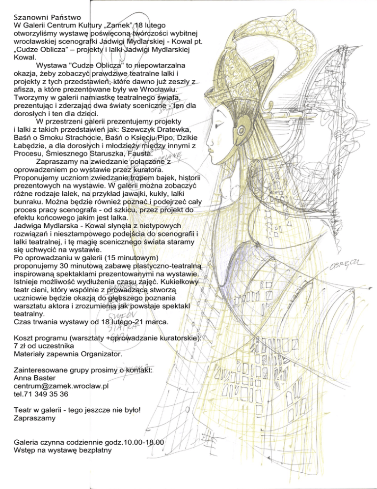Szanowni Państwo W Galerii Centrum Kultury „Zamek” 18 lutego otworzyliśmy wystawę poświęconą twórczości wybitnej wrocławskiej scenografki Jadwigi Mydlarskiej - Kowal pt. „Cudze Oblicza” – projekty i lalki Jadwigi Mydlarskiej Kowal. Wystawa "Cudze Oblicza" to niepowtarzalna okazja, żeby zobaczyć prawdziwe teatralne lalki i projekty z tych przedstawień, które dawno już zeszły z afisza, a które prezentowane były we Wrocławiu. Tworzymy w galerii namiastkę teatralnego świata, prezentując i zderzając dwa światy sceniczne - ten dla dorosłych i ten dla dzieci. W przestrzeni galerii prezentujemy projekty i lalki z takich przedstawień jak: Szewczyk Dratewka, Baśń o Smoku Strachocie, Baśń o Księciu Pipo, Dzikie Łabędzie, a dla dorosłych i młodzieży między innymi z Procesu, Śmiesznego Staruszka, Fausta. Zapraszamy na zwiedzanie połączone z oprowadzeniem po wystawie przez kuratora. Proponujemy uczniom zwiedzanie tropem bajek, historii prezentowych na wystawie. W galerii można zobaczyć różne rodzaje lalek, na przykład jawajki, kukły, lalki bunraku. Można będzie również poznać i podejrzeć cały proces pracy scenografa - od szkicu, przez projekt do efektu końcowego jakim jest lalka. Jadwiga Mydlarska - Kowal słynęła z nietypowych rozwiązań i niesztampowego podejścia do scenografii i lalki teatralnej, i tę magię scenicznego świata staramy się uchwycić na wystawie. Po oprowadzaniu w galerii (15 minutowym) proponujemy 30 minutową zabawę plastyczno-teatralną inspirowaną spektaklami prezentowanymi na wystawie. Istnieje możliwość wydłużenia czasu zajęć. Kukiełkowy teatr cieni, który wspólnie z prowadzącą stworzą uczniowie będzie okazją do głębszego poznania warsztatu aktora i zrozumienia jak powstaje spektakl teatralny. Czas trwania wystawy od 18 lutego-21 marca. Koszt programu (warsztaty +oprowadzanie kuratorskie): 7 zł od uczestnika Materiały zapewnia Organizator. Zainteresowane grupy prosimy o kontakt: Anna Baster [email protected] tel.71 349 35 36 Teatr w galerii - tego jeszcze nie było! Zapraszamy Galeria czynna codziennie godz.10.00-18.00 Wstęp na wystawę bezpłatny
