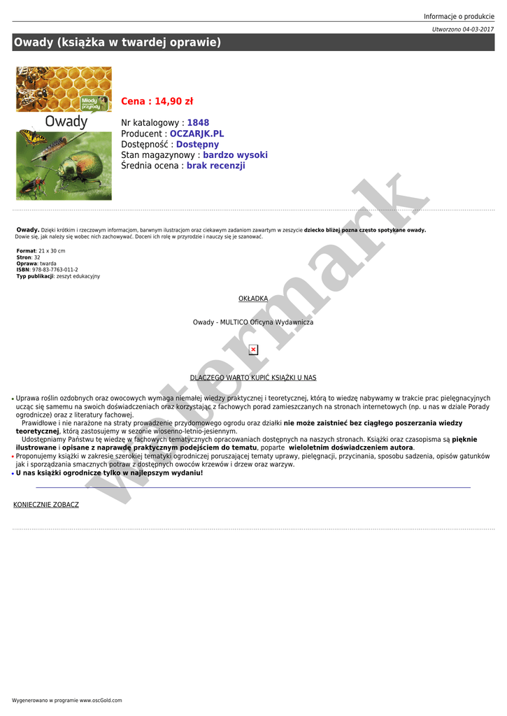 Informacje o produkcie Utworzono 04-03-2017 Owady (książka w twardej oprawie) Cena : 14,90 zł er m ar k Nr katalogowy : 1848 Producent : OCZARJK.PL Dostępność : Dostępny Stan magazynowy : bardzo wysoki Średnia ocena : brak recenzji Owady. Dzięki krótkim i rzeczowym informacjom, barwnym ilustracjom oraz ciekawym zadaniom zawartym w zeszycie dziecko bliżej pozna często spotykane owady. Dowie się, jak należy się wobec nich zachowywać. Doceni ich rolę w przyrodzie i nauczy się je szanować. Format: 21 x 30 cm Stron: 32 Oprawa: twarda ISBN: 978-83-7763-011-2 Typ publikacji: zeszyt edukacyjny OKŁADKA Owady - MULTICO Oficyna Wydawnicza DLACZEGO WARTO KUPIĆ KSIĄŻKI U NAS ● at ● Uprawa roślin ozdobnych oraz owocowych wymaga niemałej wiedzy praktycznej i teoretycznej, którą to wiedzę nabywamy w trakcie prac pielęgnacyjnych ucząc się samemu na swoich doświadczeniach oraz korzystając z fachowych porad zamieszczanych na stronach internetowych (np. u nas w dziale Porady ogrodnicze) oraz z literatury fachowej. Prawidłowe i nie narażone na straty prowadzenie przydomowego ogrodu oraz działki nie może zaistnieć bez ciągłego poszerzania wiedzy teoretycznej, którą zastosujemy w sezonie wiosenno-letnio-jesiennym. Udostępniamy Państwu tę wiedzę w fachowych tematycznych opracowaniach dostępnych na naszych stronach. Książki oraz czasopisma są pięknie ilustrowane i opisane z naprawdę praktycznym podejściem do tematu, poparte wieloletnim doświadczeniem autora. Proponujemy książki w zakresie szerokiej tematyki ogrodniczej poruszającej tematy uprawy, pielęgnacji, przycinania, sposobu sadzenia, opisów gatunków jak i sporządzania smacznych potraw z dostępnych owoców krzewów i drzew oraz warzyw. U nas książki ogrodnicze tylko w najlepszym wydaniu! w ● KONIECZNIE ZOBACZ Wygenerowano w programie www.oscGold.com