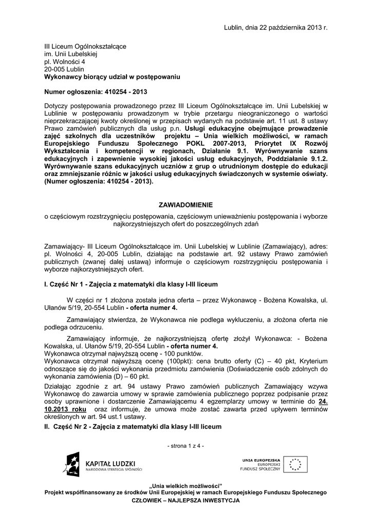 Lublin, dnia 22 października 2013 r. III Liceum Ogólnokształcące im. Unii Lubelskiej pl. Wolności 4 20-005 Lublin Wykonawcy biorący udział w postępowaniu Numer ogłoszenia: 410254 - 2013 Dotyczy postępowania prowadzonego przez III Liceum Ogólnokształcące im. Unii Lubelskiej w Lublinie w postępowaniu prowadzonym w trybie przetargu nieograniczonego o wartości nieprzekraczającej kwoty określonej w przepisach wydanych na podstawie art. 11 ust. 8 ustawy Prawo zamówień publicznych dla usług p.n. Usługi edukacyjne obejmujące prowadzenie zajęć szkolnych dla uczestników projektu – Unia wielkich możliwości, w ramach Europejskiego Funduszu Społecznego POKL 2007-2013, Priorytet IX Rozwój Wykształcenia i kompetencji w regionach, Działanie 9.1. Wyrównywanie szans edukacyjnych i zapewnienie wysokiej jakości usług edukacyjnych, Poddziałanie 9.1.2. Wyrównywanie szans edukacyjnych uczniów z grup o utrudnionym dostępie do edukacji oraz zmniejszanie różnic w jakości usług edukacyjnych świadczonych w systemie oświaty. (Numer ogłoszenia: 410254 - 2013). ZAWIADOMIENIE o częściowym rozstrzygnięciu postępowania, częściowym unieważnieniu postępowania i wyborze najkorzystniejszych ofert do poszczególnych zdań Zamawiający- III Liceum Ogólnokształcące im. Unii Lubelskiej w Lublinie (Zamawiający), adres: pl. Wolności 4, 20-005 Lublin, działając na podstawie art. 92 ustawy Prawo zamówień publicznych (zwanej dalej ustawą) informuje o częściowym rozstrzygnięciu postępowania i wyborze najkorzystniejszych ofert. I. Część Nr 1 - Zajęcia z matematyki dla klasy I-III liceum W części nr 1 złożona została jedna oferta – przez Wykonawcę - Bożena Kowalska, ul. Ułanów 5/19, 20-554 Lublin - oferta numer 4. Zamawiający stwierdza, że Wykonawca nie podlega wykluczeniu, a złożona oferta nie podlega odrzuceniu. Zamawiający informuje, że najkorzystniejszą ofertę złożył Wykonawca: - Bożena Kowalska, ul. Ułanów 5/19, 20-554 Lublin - oferta numer 4. Wykonawca otrzymał najwyższą ocenę - 100 punktów. Wykonawca otrzymał najwyższą ocenę (100pkt): cena brutto oferty (C) – 40 pkt, Kryterium odnoszące się do jakości wykonania przedmiotu zamówienia (Doświadczenie osób zdolnych do wykonania zamówienia (D) – 60 pkt. Działając zgodnie z art. 94 ustawy Prawo zamówień publicznych Zamawiający wzywa Wykonawcę do zawarcia umowy w sprawie zamówienia publicznego poprzez podpisanie przez osoby uprawnione i dostarczenie Zamawiającemu 4 egzemplarzy umowy w terminie do 24. 10.2013 roku oraz informuje, że umowa może zostać zawarta przed upływem terminów określonych w art. 94 ust.1 ustawy. II. Część Nr 2 - Zajęcia z matematyki dla klasy I-III liceum - strona 1 z 4 - „Unia wielkich możliwości” Projekt współfinansowany ze środków Unii Europejskiej w ramach Europejskiego Funduszu Społecznego CZŁOWIEK – NAJLEPSZA INWESTYCJA W części numer 2 zamówienia, zostały złożone dwie oferty: - oferta numer 1 złożona przez Wykonawcę - Władysław Swół, ul. K. Tumidajskiego 2B/18, 20247 Lublin, - oferta numer 7 złożona przez Wykonawcę - Jan Jaworski, ul. Wertera 16, 20-713 Lublin, Zamawiający stwierdza, że w/w Wykonawcy nie podlegają wykluczeniu z udziału w postępowaniu, a złożone przez nich oferty nie podlegają odrzuceniu. Zamawiający informuje, że najkorzystniejszą ofertę złożył Wykonawca: Władysław Swół, ul. K. Tumidajskiego 2B/18, 20-247 Lublin, (oferta numer 1). Wykonawca: Władysław Swół otrzymał najwyższą ocenę -100pkt: cena brutto oferty (C) – 40 pkt, Kryterium odnoszące się do jakości wykonania przedmiotu zamówienia (Doświadczenie osób zdolnych do wykonania zamówienia (D) – 60 pkt. Wykonawca: Jan Jaworski otrzymał 98,97 pkt: cena brutto oferty (C) – 38,97 pkt, Kryterium odnoszące się do jakości wykonania przedmiotu zamówienia (Doświadczenie osób zdolnych do wykonania zamówienia (D) – 60 pkt. Działając zgodnie z art. 94 ustawy Prawo zamówień publicznych Zamawiający wzywa Wykonawcę do zawarcia umowy w sprawie zamówienia publicznego poprzez podpisanie przez osoby uprawnione i dostarczenie Zamawiającemu 4 egzemplarzy umowy w terminie do 28. 10.2013 roku. III. Część Nr 4 - Prowadzenie koła edukacyjnego - warsztatów literackich dla klasy I-III liceum W części nr 4 złożona została jedna oferta – przez Wykonawcę - Magdalena Bożko, ul. Tulipanowa 66, 20-827 Lublin - oferta numer 9. Zamawiający stwierdza, że Wykonawca nie podlega wykluczeniu, a złożona oferta nie podlega odrzuceniu. Zamawiający informuje, że najkorzystniejszą ofertę złożył Wykonawca: - Magdalena Bożko, ul. Tulipanowa 66, 20-827 Lublin - oferta numer 9. Wykonawca otrzymał najwyższą ocenę - 70 punktów. Wykonawca otrzymał najwyższą ocenę (70pkt): cena brutto oferty (C) – 40 pkt, Kryterium odnoszące się do jakości wykonania przedmiotu zamówienia (Doświadczenie osób zdolnych do wykonania zamówienia (D) – 30 pkt. Działając zgodnie z art. 94 ustawy Prawo zamówień publicznych Zamawiający wzywa Wykonawcę do zawarcia umowy w sprawie zamówienia publicznego poprzez podpisanie przez osoby uprawnione i dostarczenie Zamawiającemu 4 egzemplarzy umowy w terminie do 24. 10.2013 roku oraz informuje, że umowa może zostać zawarta przed upływem terminów określonych w art. 94 ust.1 ustawy. IV. Część Nr 5 - Zajęcia z doradztwa zawodowego dla klasy III liceum. W części nr 5 złożone zostały trzy oferty: - oferta numer 5, złożona przez Wykonawcę - Agnieszkę Kośkiewicz, Dominów ul. Wichrowa 14, 20-388 Lublin 6, - oferta numer 2, złożona przez Wykonawcę - Europejskie Centrum Doradczo-Szkoleniowe Rafał Dudzic, ul. Lipińskiego 21/54, 20-849 Lublin, - strona 2 z 4 - „Unia wielkich możliwości” Projekt współfinansowany ze środków Unii Europejskiej w ramach Europejskiego Funduszu Społecznego CZŁOWIEK – NAJLEPSZA INWESTYCJA - oferta numer